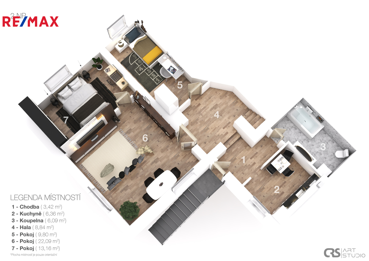 V prvním patře domu se nachází obývací pokoj, 2 ložnice z nichž je romantický výhled na řeku a okolí, kuchyň, koupelna.