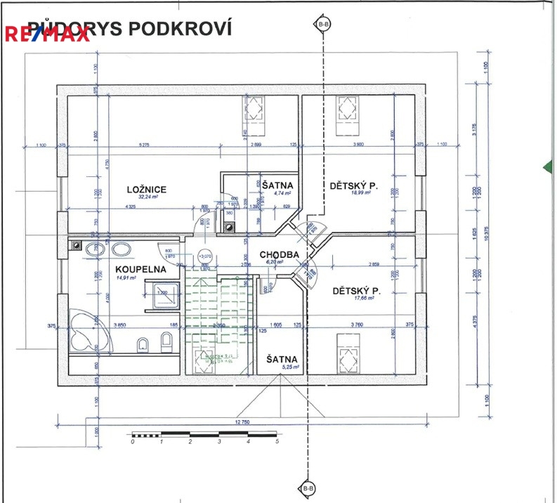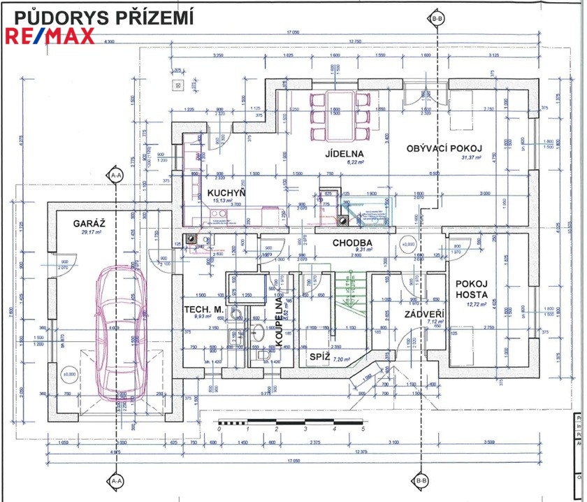 Naleznete zde také pokoj pro hosty (12,7 m2), koupelnu s wc, šatnu, tech. místnost a vstup do garáže (29 m2).