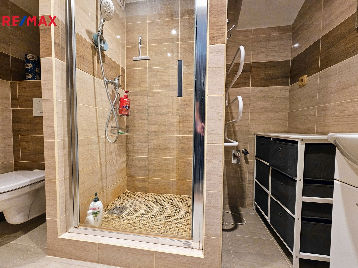 V patře je kuchyně 10 m2, obývací pokoj 22 m2, předsíň, koupelna se sprchovým koutem a WC, dětský pokoj 15 m2, ložnice 14 m2 a komora s plyn. kotlem. Z ložnice je vstup na lodžii 13,5 m2 do zahrady.