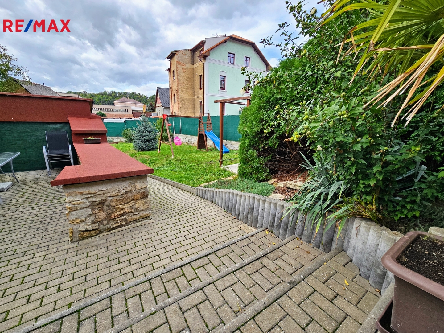 Na dlážděném dvorku za domem je letní posezení, na zatravněné části dětské hřiště, houpačka, a skluzavka.