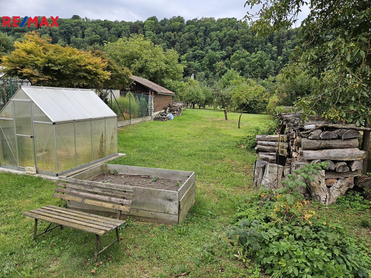Dvorek navazuje na velkou oplocenou zahradu 1717 m2 se skleníkem a plodícími ovocnými stromy, třešně, broskve, švestky, jabloně.