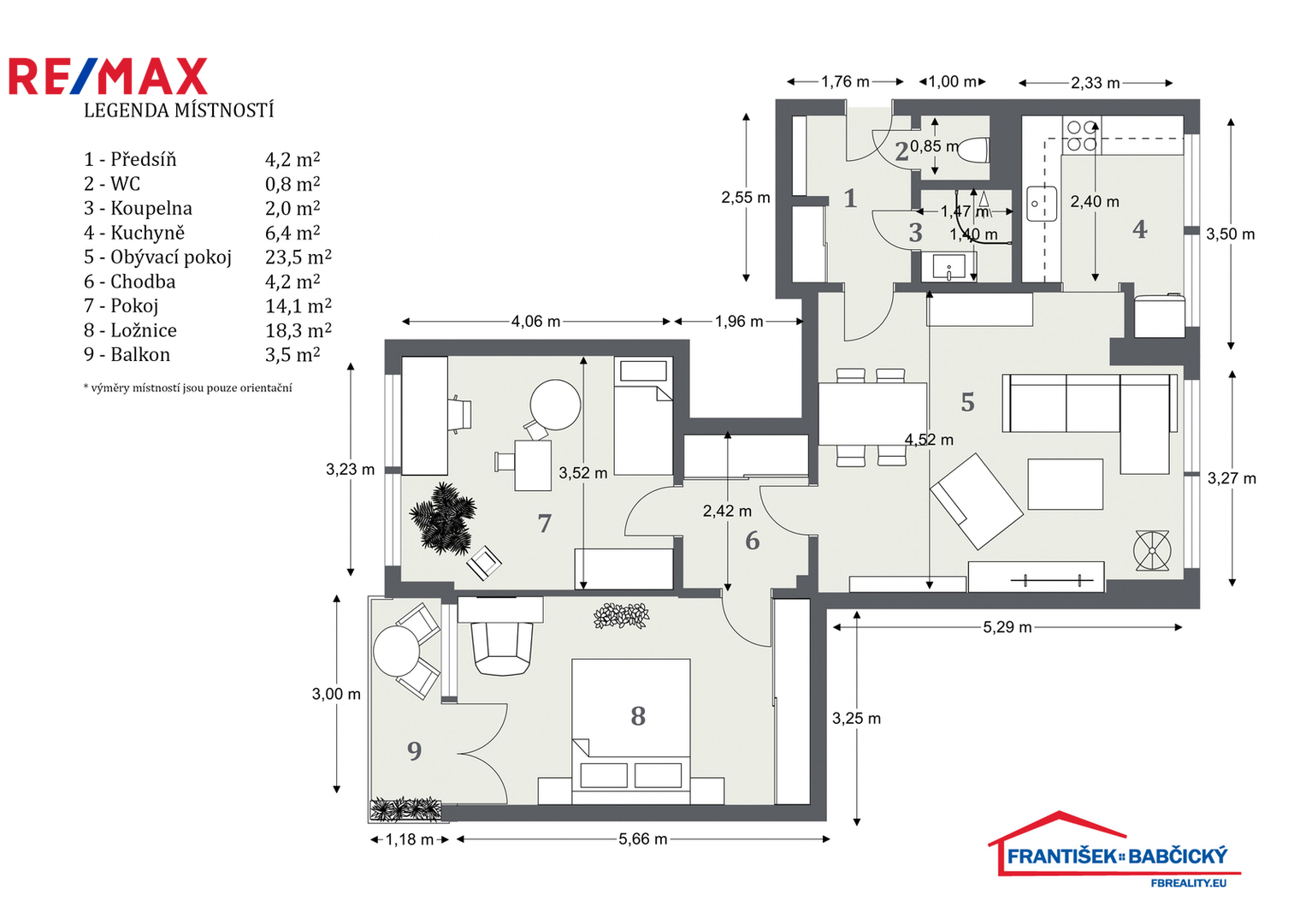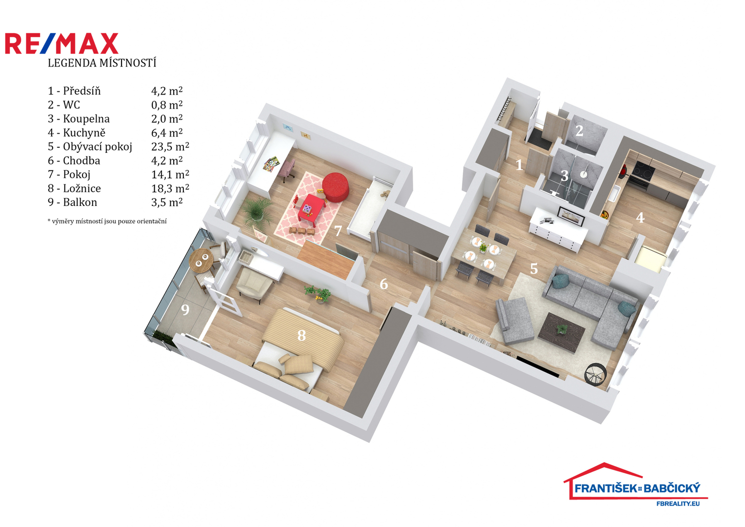 Dispozice bytu: obývací pokoj 23,5 m² se vstupem na lodžii 3,5 m², ložnice 18,3 m², druhá ložnice 14,1 m², chodba 4,2 m², kuchyně s oknem 6,4 m², předsíň 4,2 m², koupelna se sprchovým koutem 2 m², samostatné WC 1 m². K bytu náleží také sklepní kóje (cca 2 m²). V domě je k dispozici společná kočárkárna.