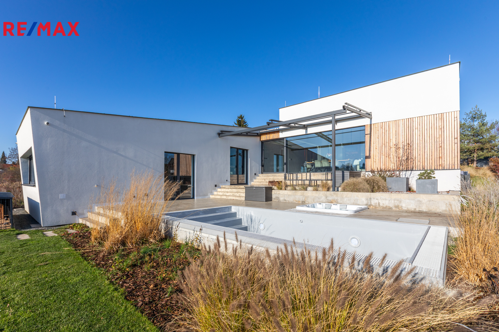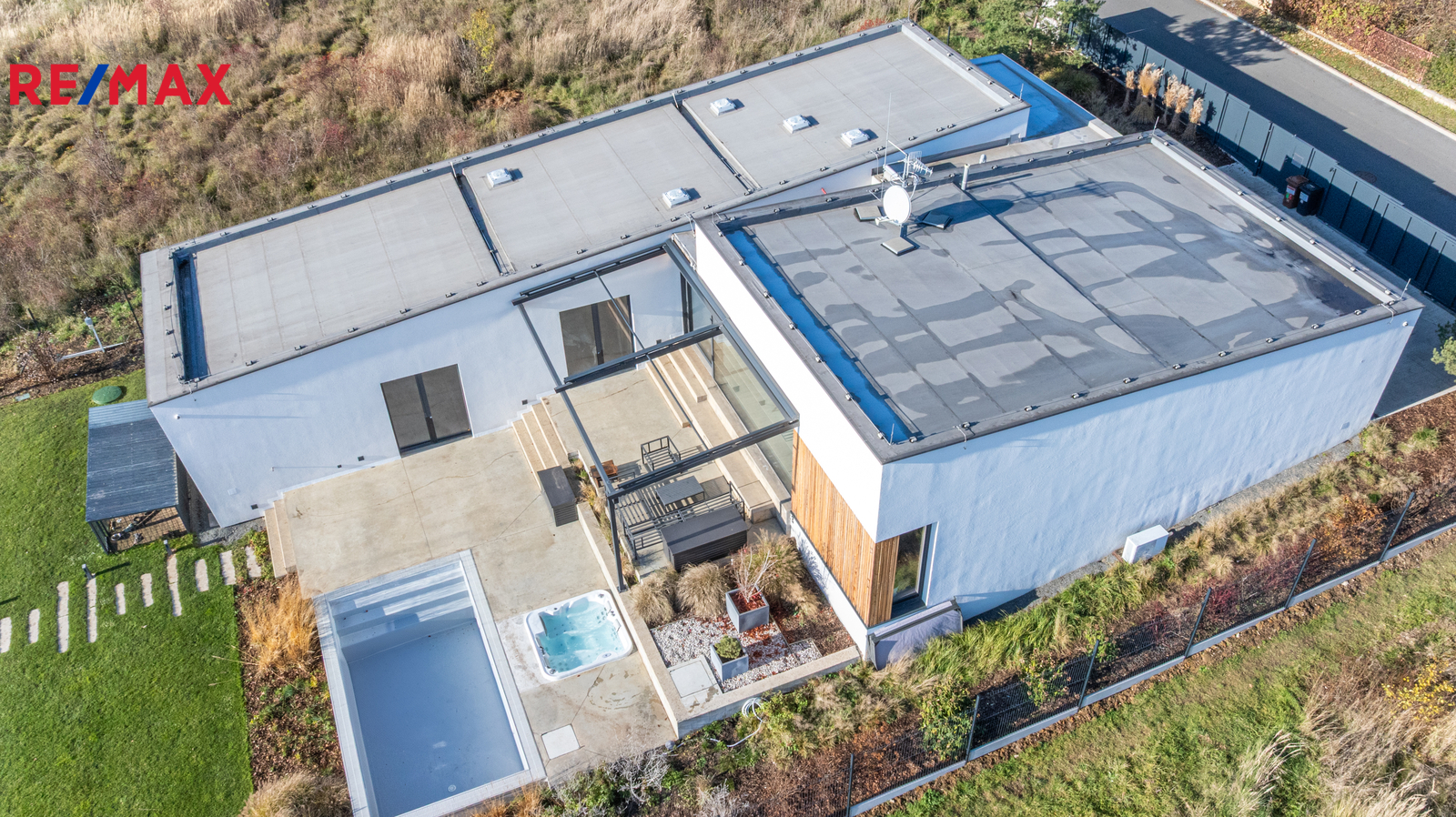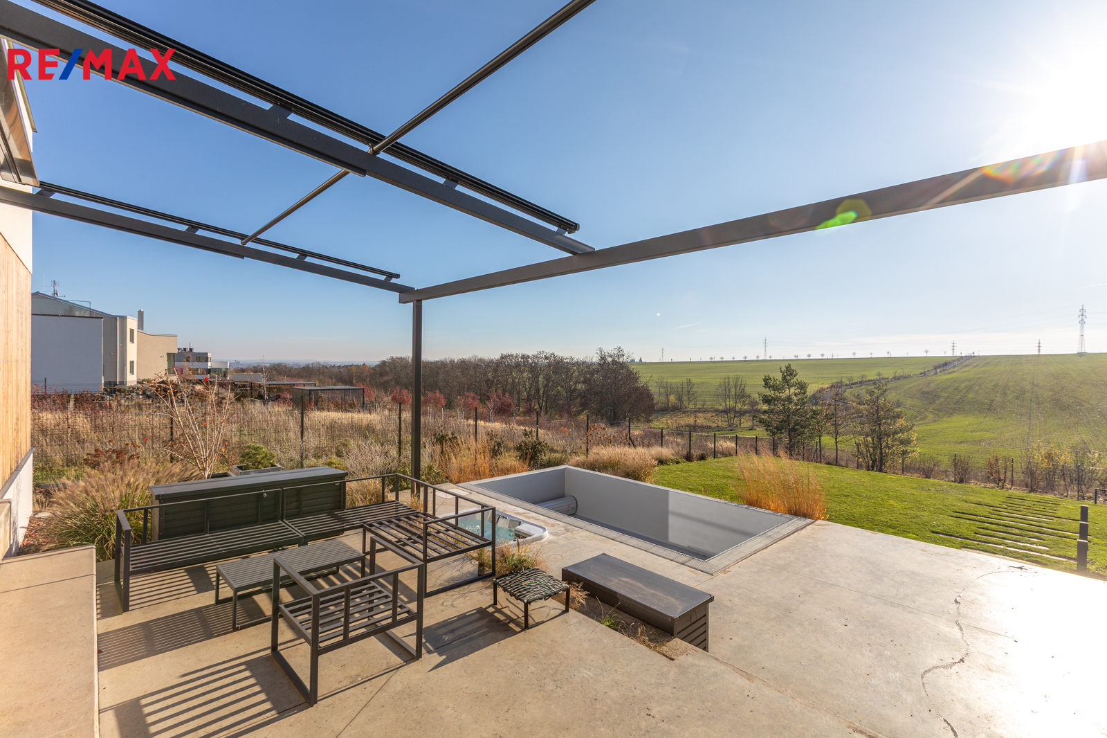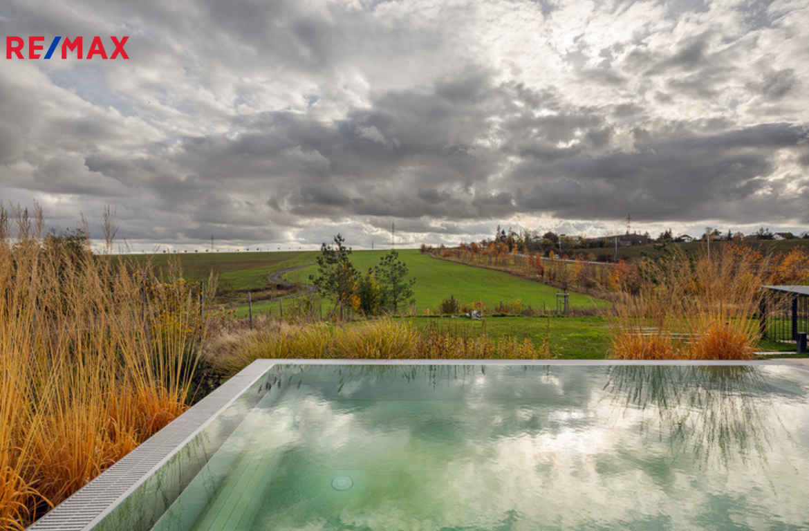 Terasa o výměře 65 m2 má elektricky ovládané zastínění, zapuštěný přelivový bazén 6x3 s vyjížděcí krycí nosnou lamelou a vířivku, vše od firmy BWT.