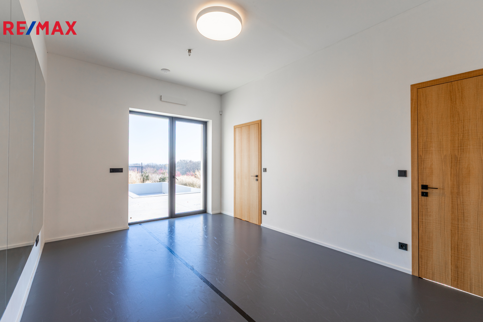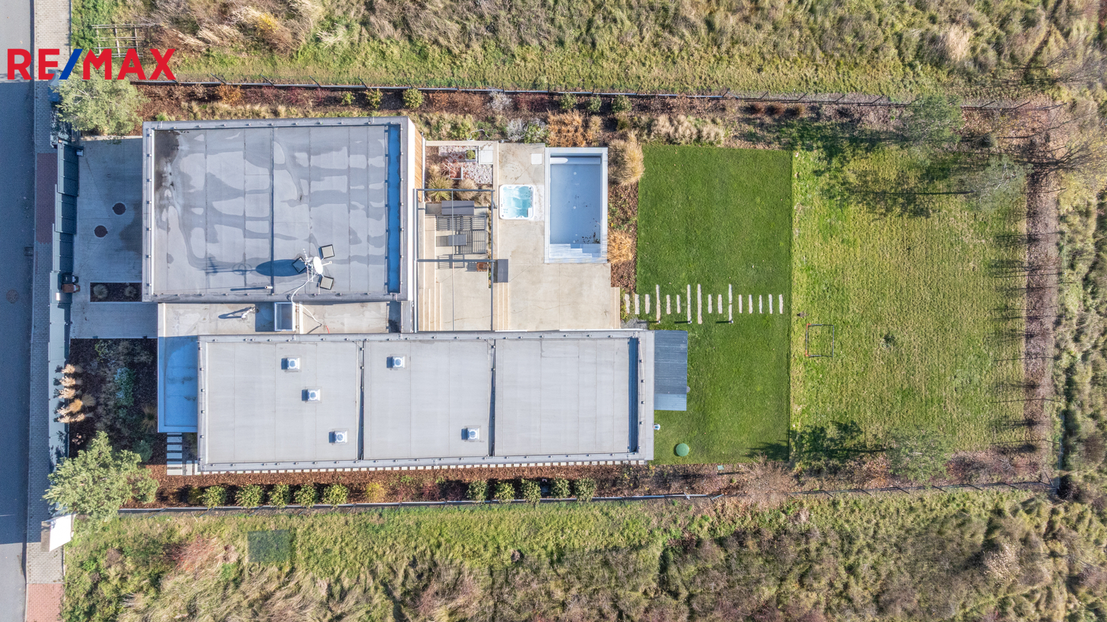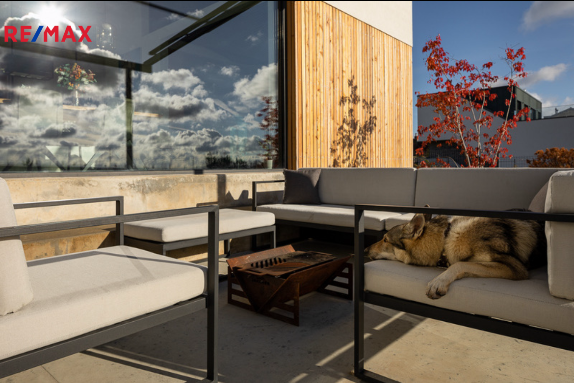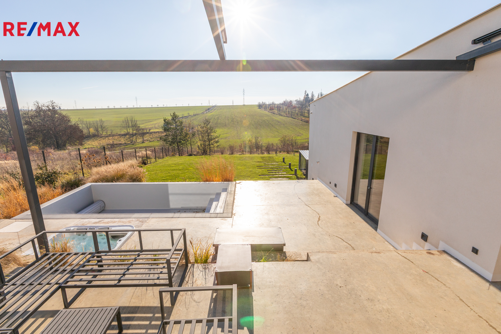 Terasa o výměře 65 m2 má elektricky ovládané zastínění, zapuštěný přelivový bazén 6x3 s vyjížděcí krycí nosnou lamelou a vířivku, vše od firmy BWT.