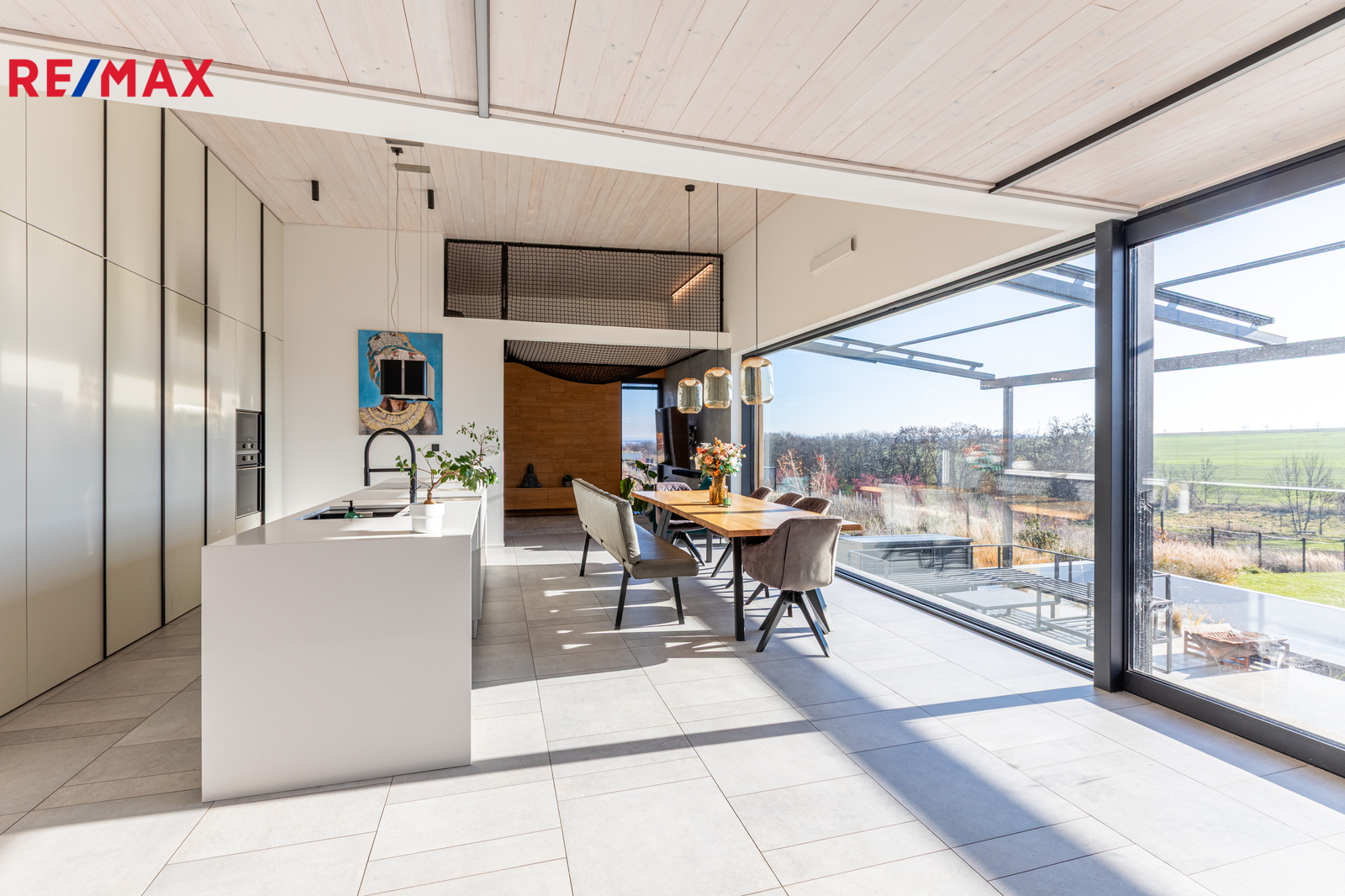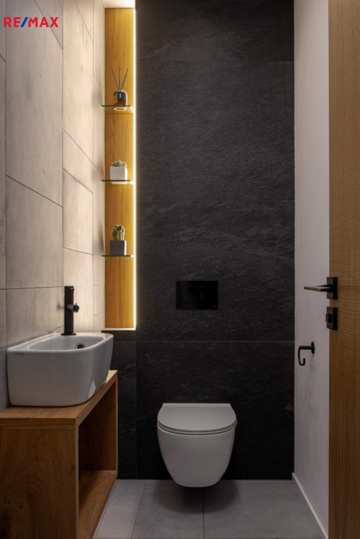 Vila je v precizním provedení, interiér je vkusně zařízen vestavěným nábytkem.