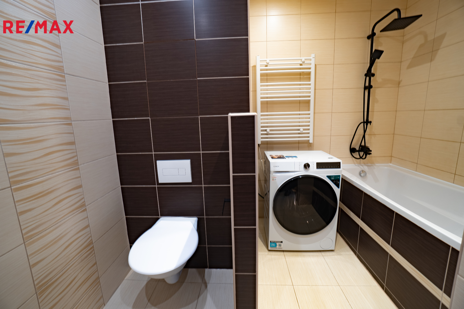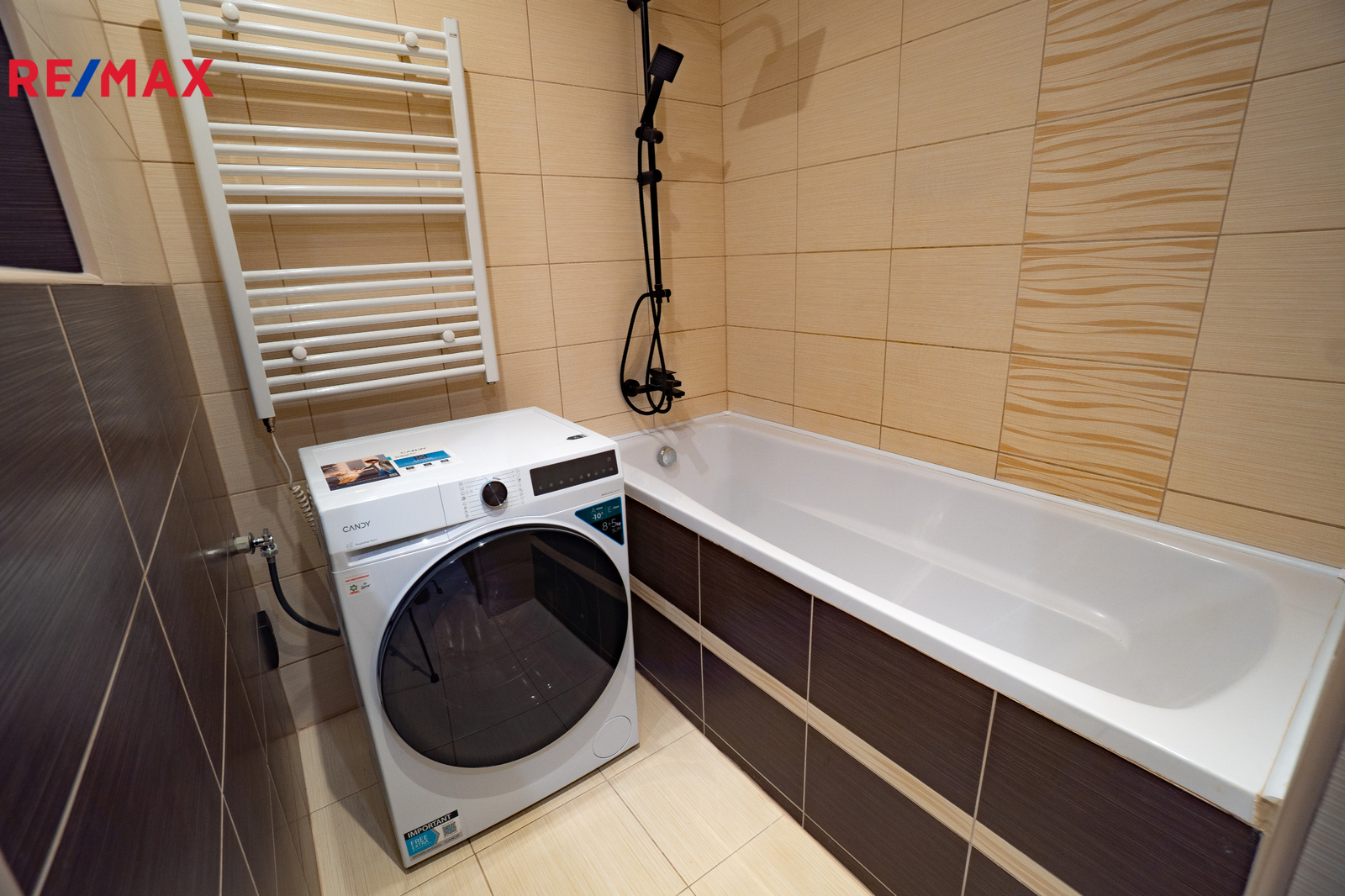 koupelna s vanou a pračkou se sušičkou