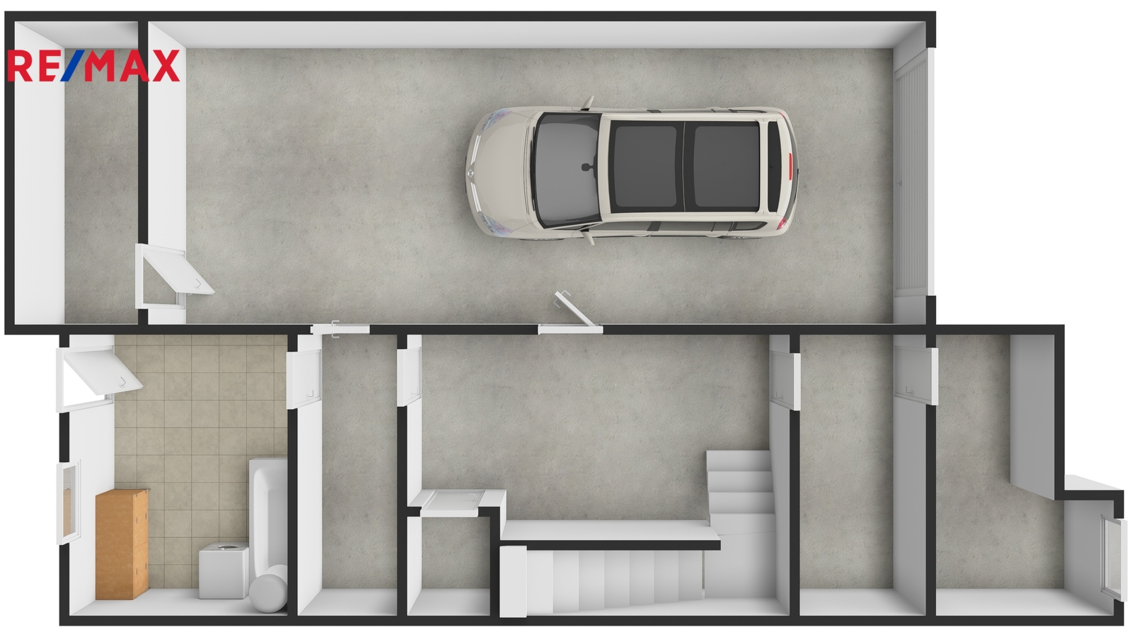 1. podlaží: garáž s kapacitou až pro dva automobily, dále technické zázemí domu – několik komor, prádelna a vstup na zahradu. Tento prostor lze využít i k vybudování dílny, pracovny nebo domácího wellness.