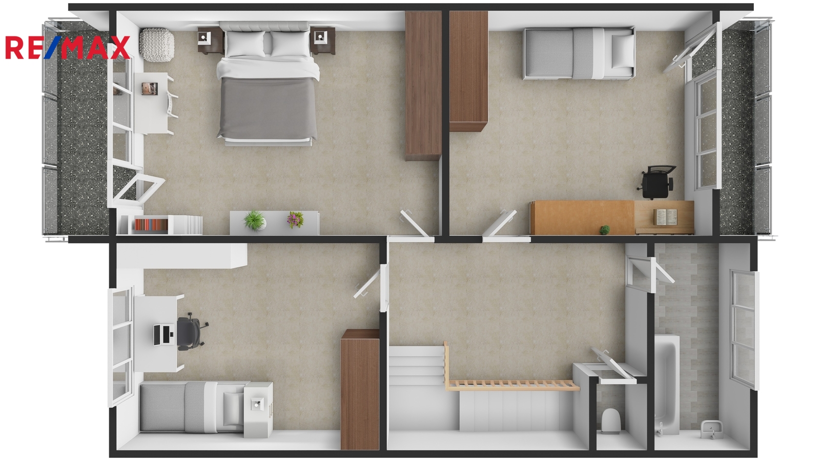 3. podlaží: tři samostatné ložnice (dvě s balkonem), koupelna a samostatné WC.