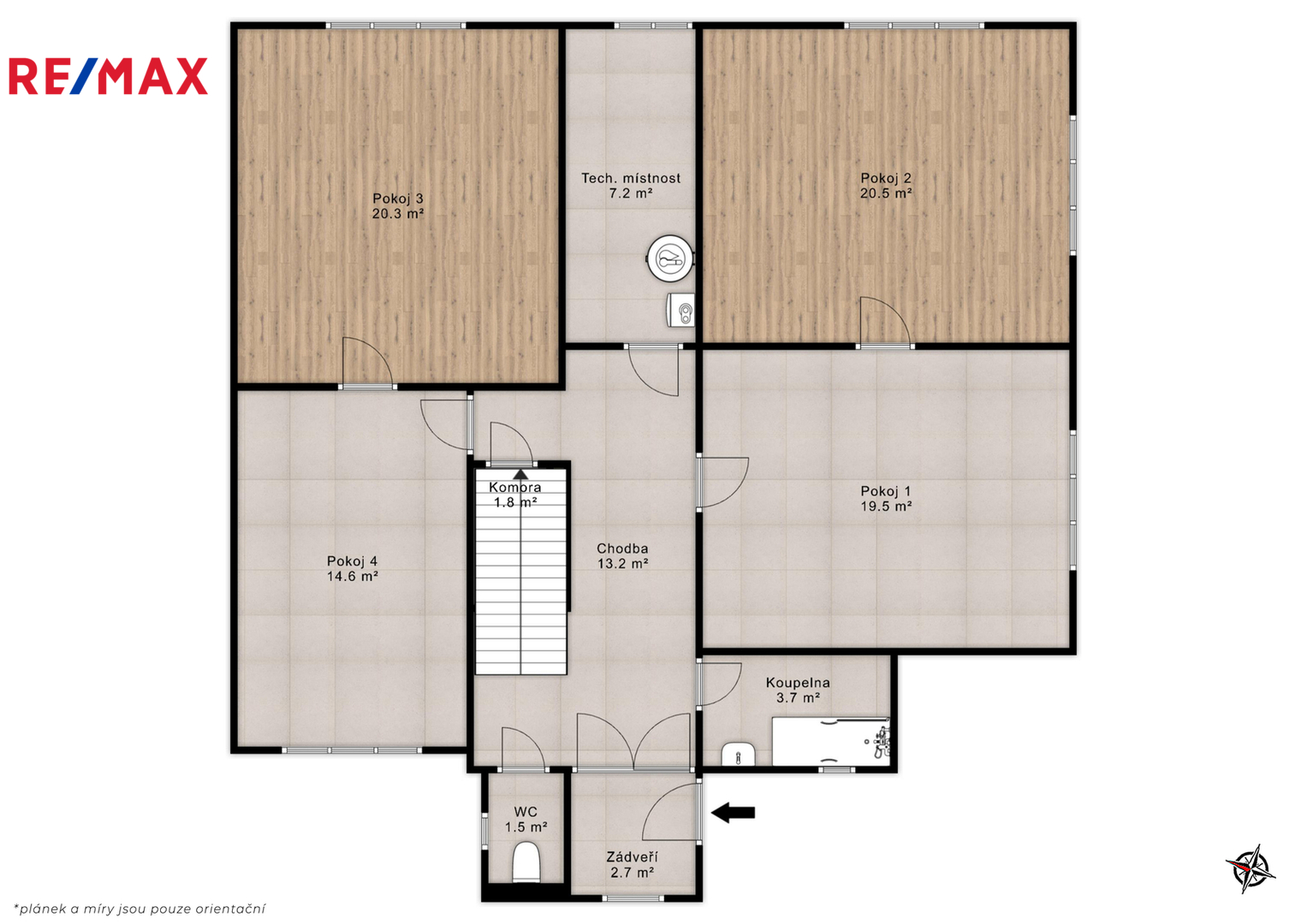 Aktuální dispozice 6+1 (4 místnosti v přízemí a 3 v patře) umožňuje přizpůsobit dům potřebám i početnější rodiny.