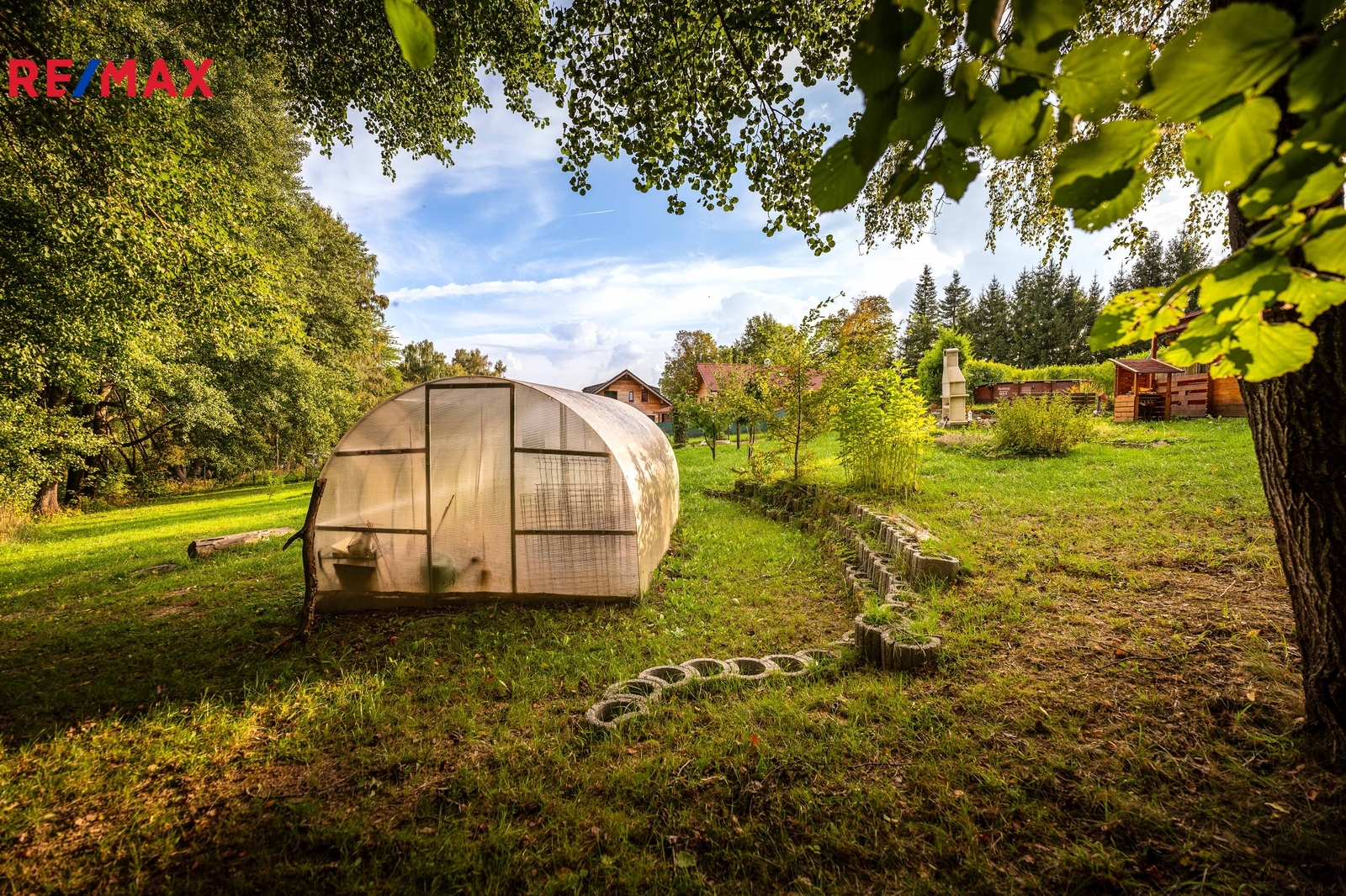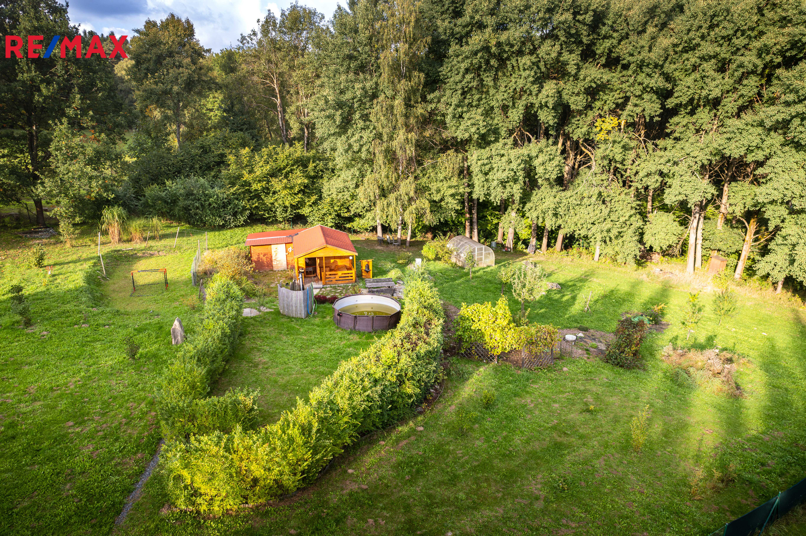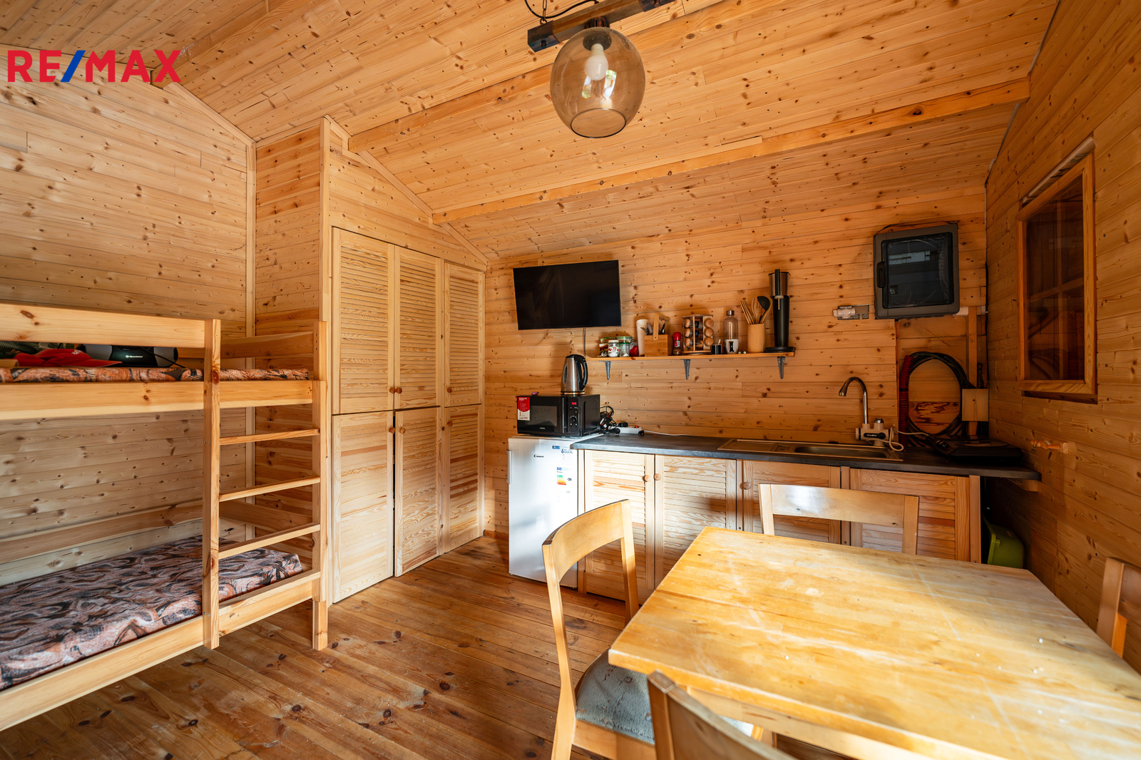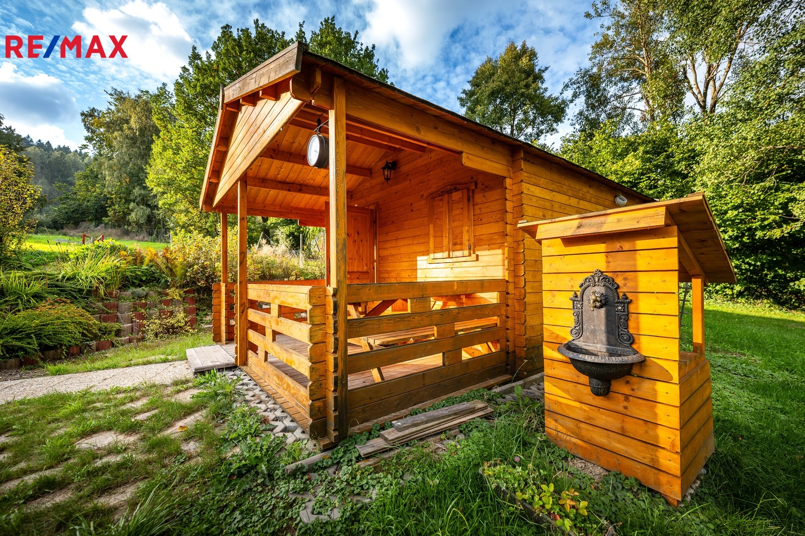 Na pozemku stojí menší dřevěná chatka, kterou lze využívat pro zázemí během pobytu nebo budoucí výstavby. Součástí je také přístřešek na nářadí. Upravená část zahrady nabízí venkovní posezení s krbem, bazénem a okrasnou výsadbou, zaručující soukromí na části rozlehlého pozemku.