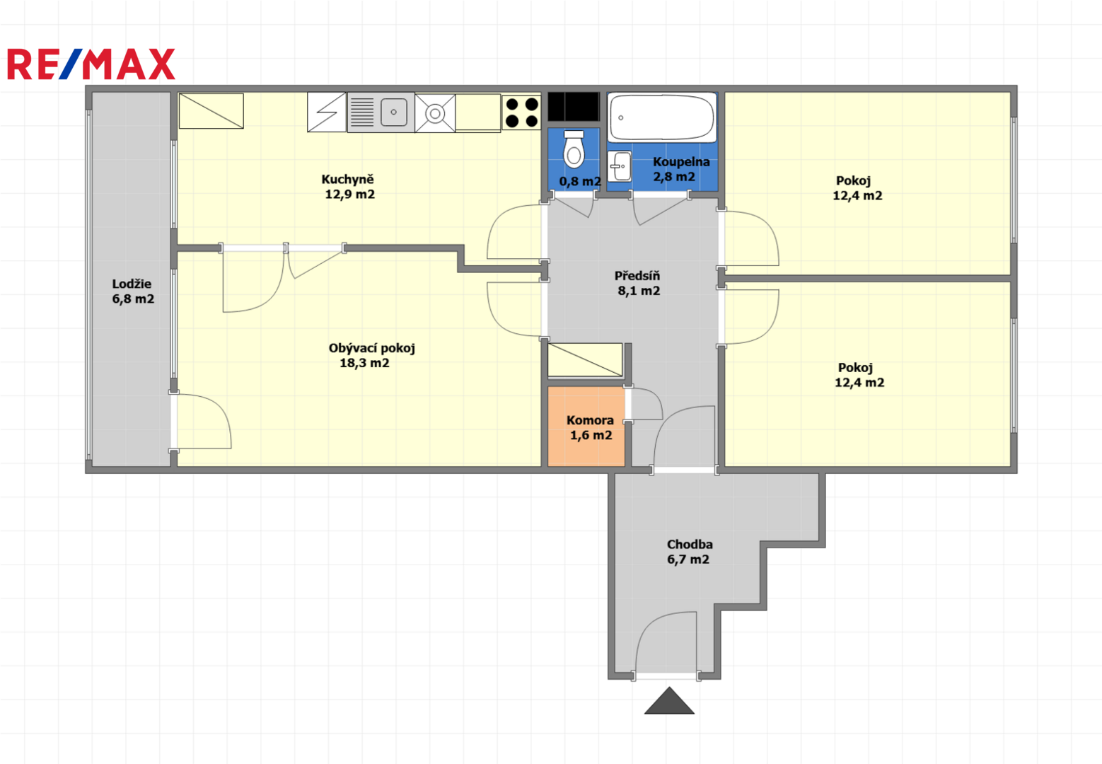 Z obývacího pokoje (18,3 m2) vede přístup na lodžii (6,80 m2), která je zasklená a nabízí příjemný prostor k odpočinku.