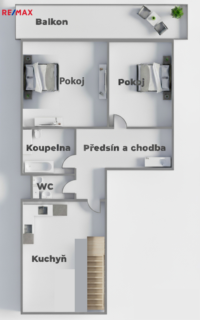 Po vstupu do bytu vás přivítá předsíň s vestavnou skříní. Z předsíně se dostanete do samostatného pokoje a ložnice s přímým vstupem na velkou lodžii. Z chodby vede vstup do prostorné koupelny a na samostatnou toaletu. Srdcem bytu je světlá kuchyně s vysokým stropem, která dodává prostoru vzdušnost a jedinečný charakter. Dominantou je schodiště, které vede do horního patra, kde se nachází prostorný obývací pokoj a další pokoj vhodný například jako pracovna nebo dětský pokoj.