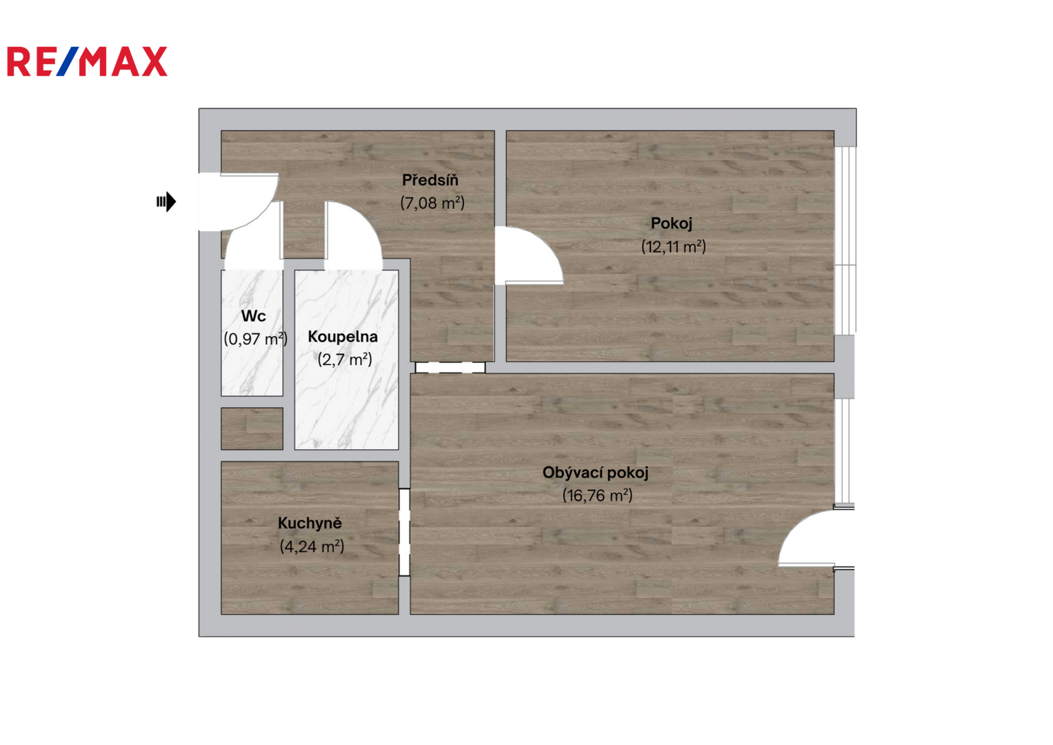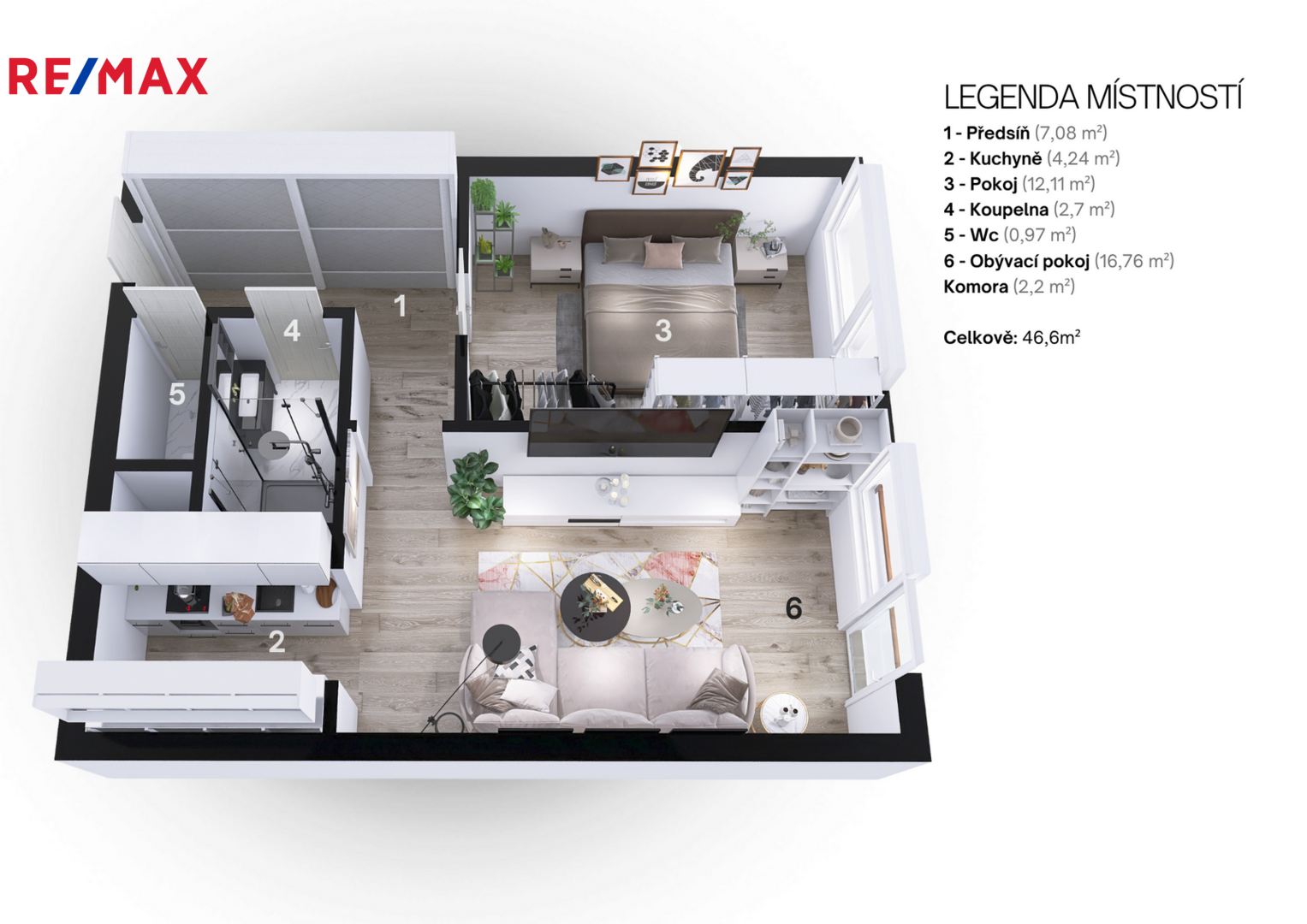 Dispozici tvoří vstupní předsíň ( 7,08 m²) s vestavnou skříní po celé délce chodby, obývací pokoj (16,76 m²) s navazujícím kuchyňským koutem, samostatná ložnice (12,11 m²), koupelna se sprchovým koutem (2,7 m²) a samostatné WC (0,97 m²). K bytu náleží komora o velikosti 2,2 m² umístěná o patro výše. Na patře je k dispozici společný balkon, v přízemí domu kočárkárna/kolárna. Kuchyňská linka je vybavena varnou deskou, digestoří, myčkou, lednicí, mrazákem a vestavěnou pračkou. Byt je připraven k okamžitému nastěhování.