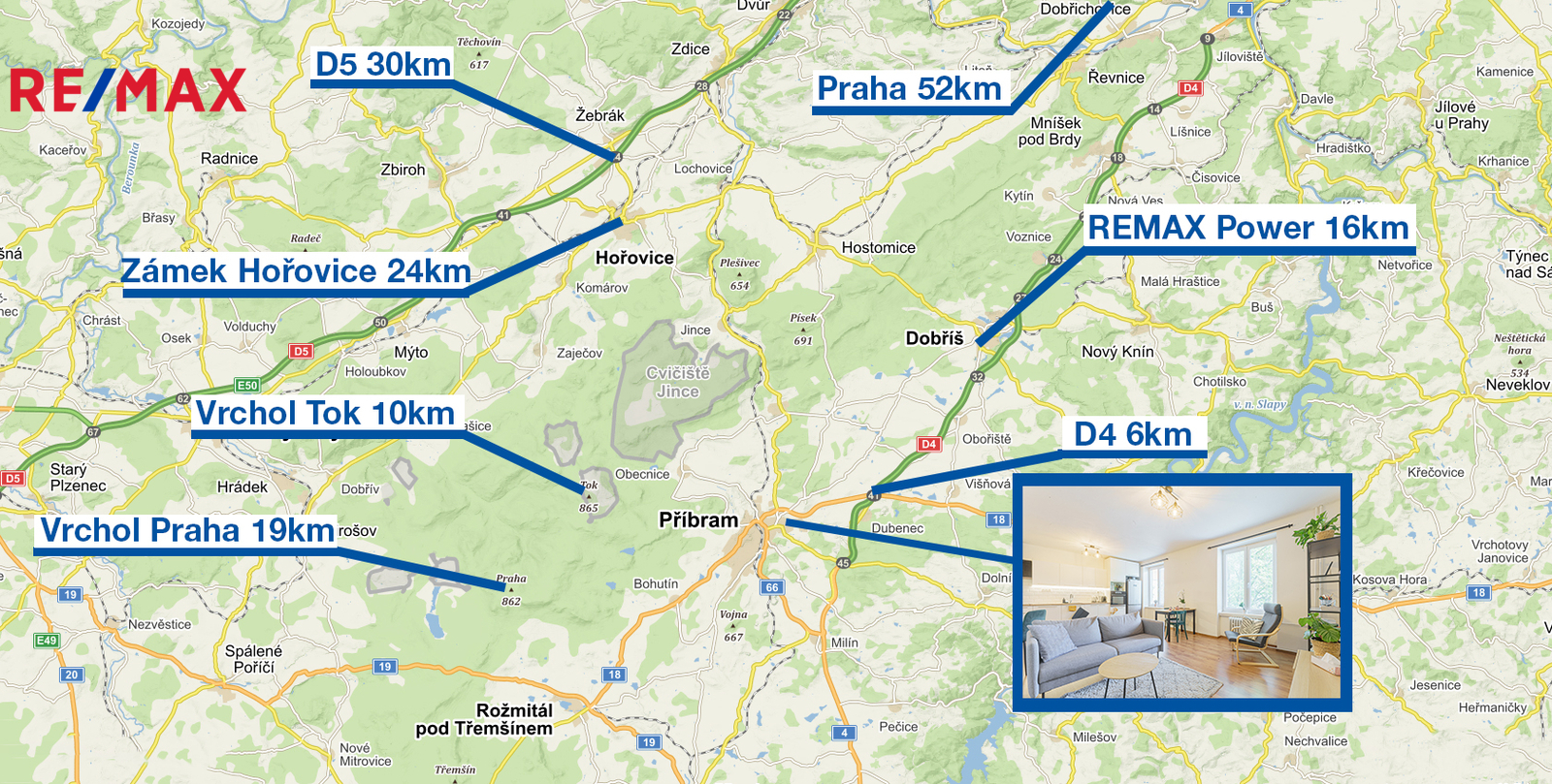 Z této části Příbrami je skvělé spojení po městě a rovněž na dálnici do Prahy nebo Písku.