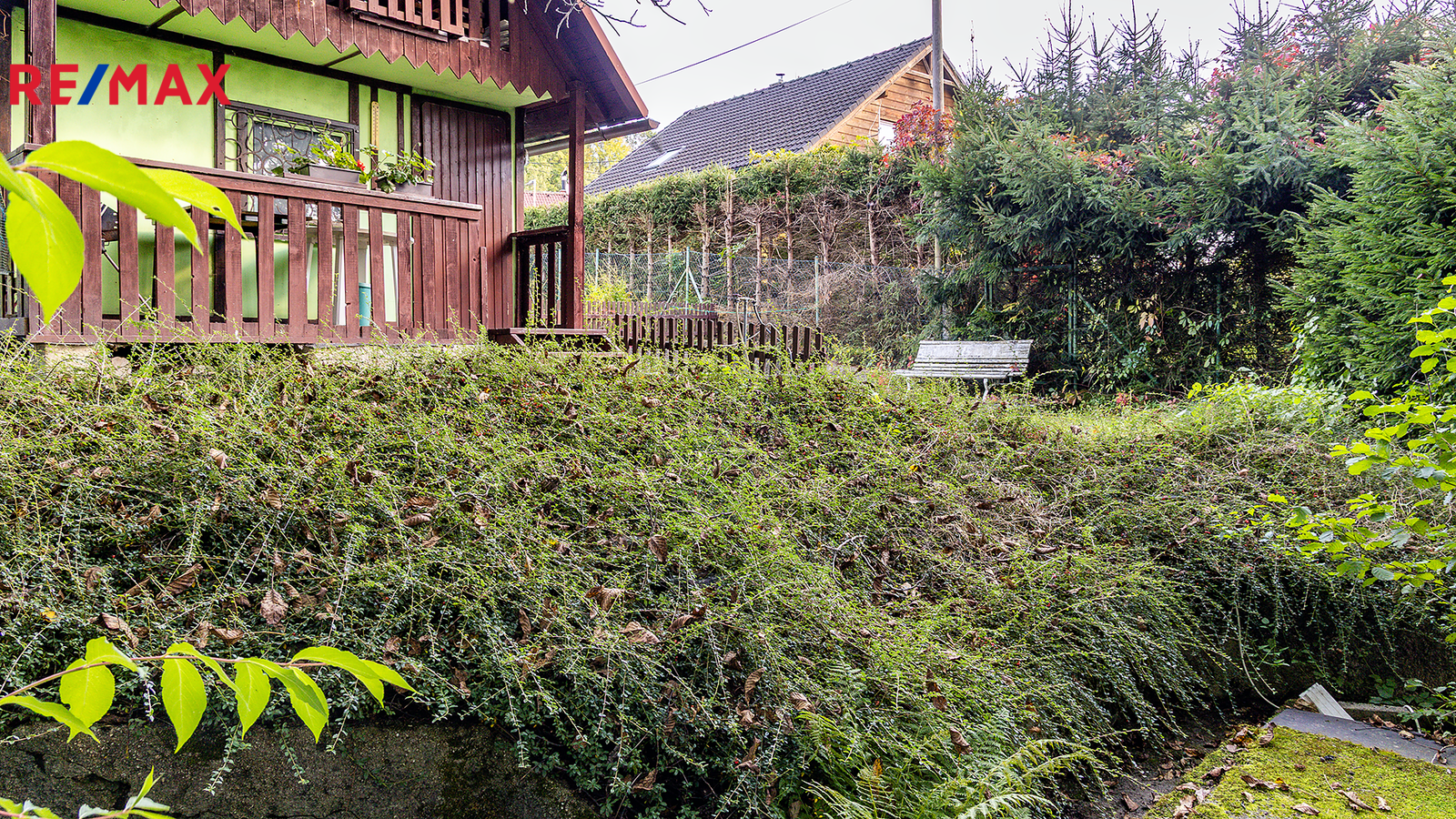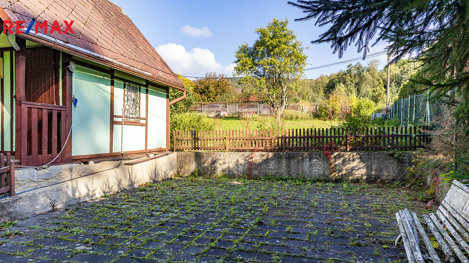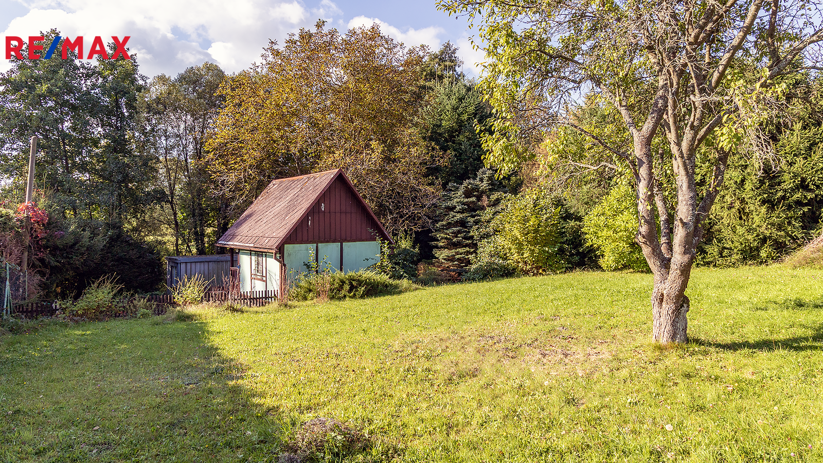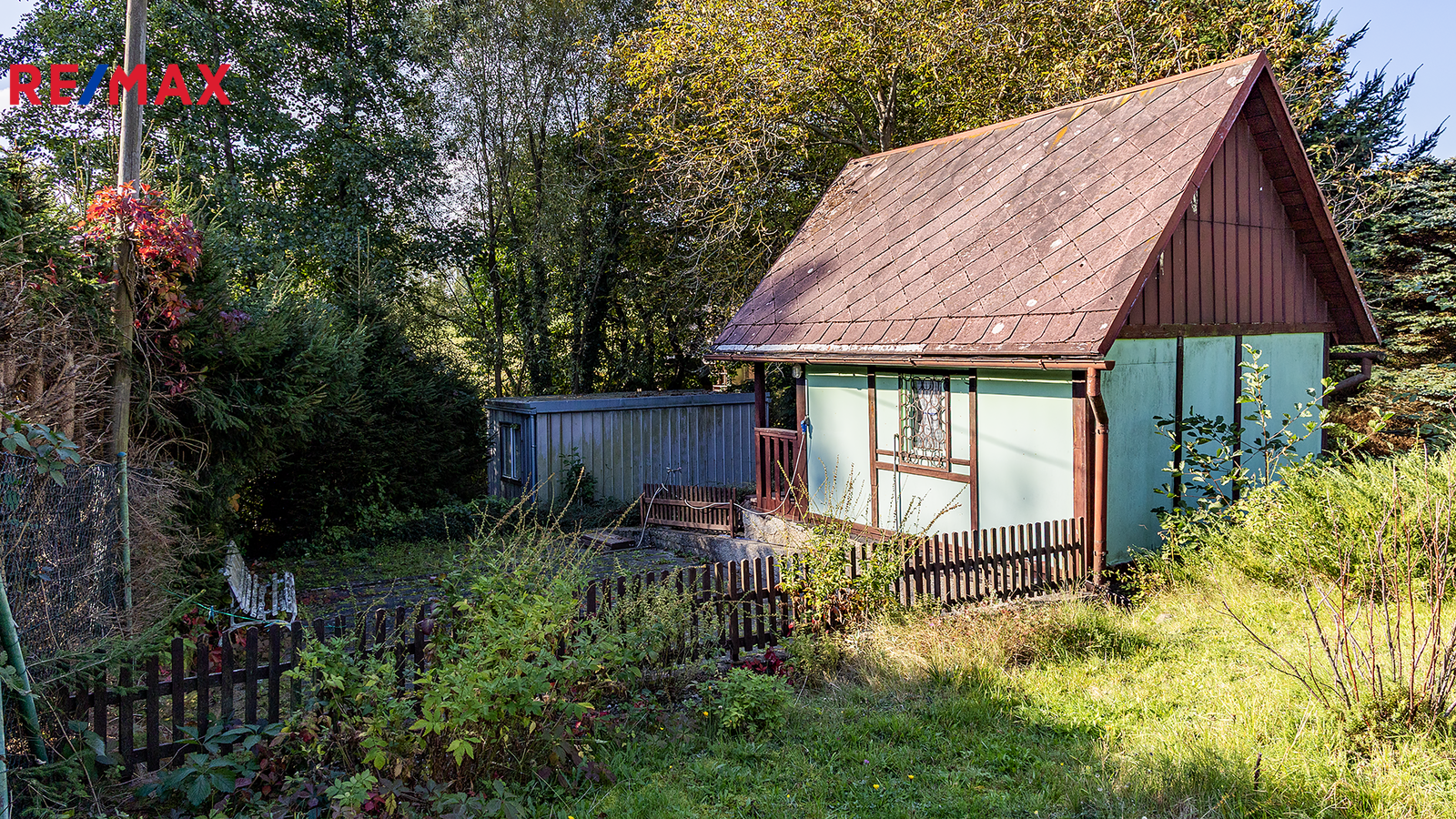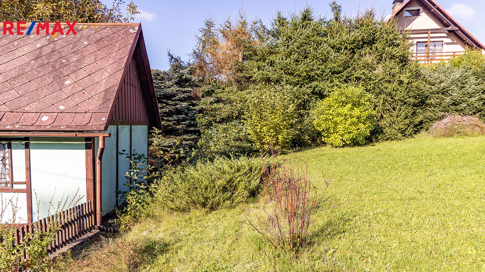 Na pozemku resp. v jeho zadní části v tuto chvíli stojí jednoduchá dřevěná chata (nikoliv na místě předpokládané budoucí stavby RD), která může ještě dál sloužit k občasnému rekreačnímu nebo sezónnímu využití, ale hlavně vám poskytne praktické zázemí během samotné výstavby domu – místo na nářadí, přístřešek při špatném počasí, zázemí pro dohled na stavbu apod.