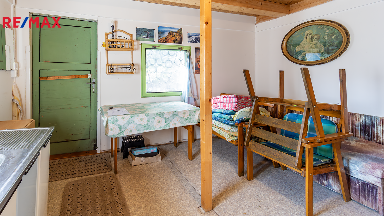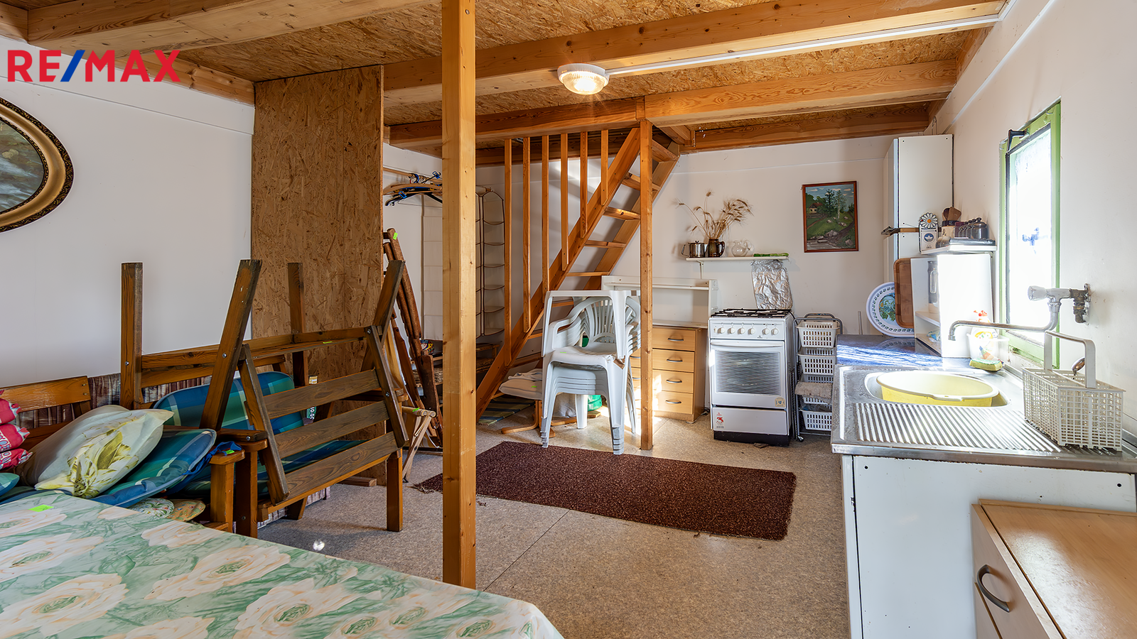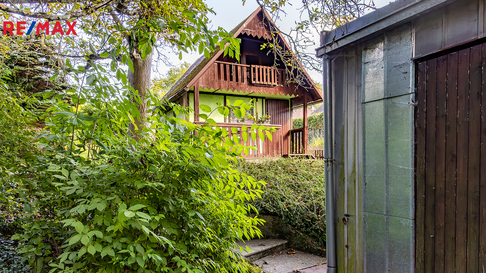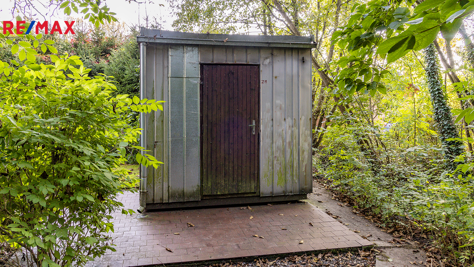 Důležité upozornění: tato chata není zapsaná v katastru nemovitostí jako stavba. To znamená, že ji vnímáme spíše jako dočasný objekt (provizorní zázemí), nikoliv jako plnohodnotnou rekreační stavbu. Na okraji pozemku je dále umístěn kontejner sloužící jako sklad. Ideální na materiál, nářadí, zahradní techniku atd. V praxi to znamená, že když začnete stavět, nemusíte první den řešit, kam s věcmi. Máte to připravené.