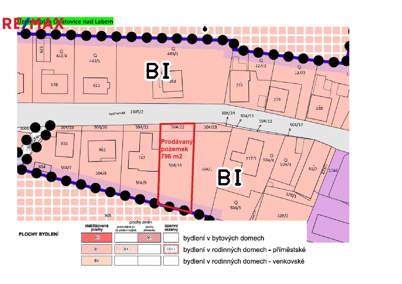 ✅ Celková plocha pozemků činí 796 m². V územním plánu jde o oblast pro bydlení v rodinných domech příměstské - v ploše BI. Ta je určena pro zástavbu rodinných domů o 1 nadzemním podlaží s možností obytného podkroví. Koeficient zastavění stavebního pozemku nepřevýší hodnotu 0,6.