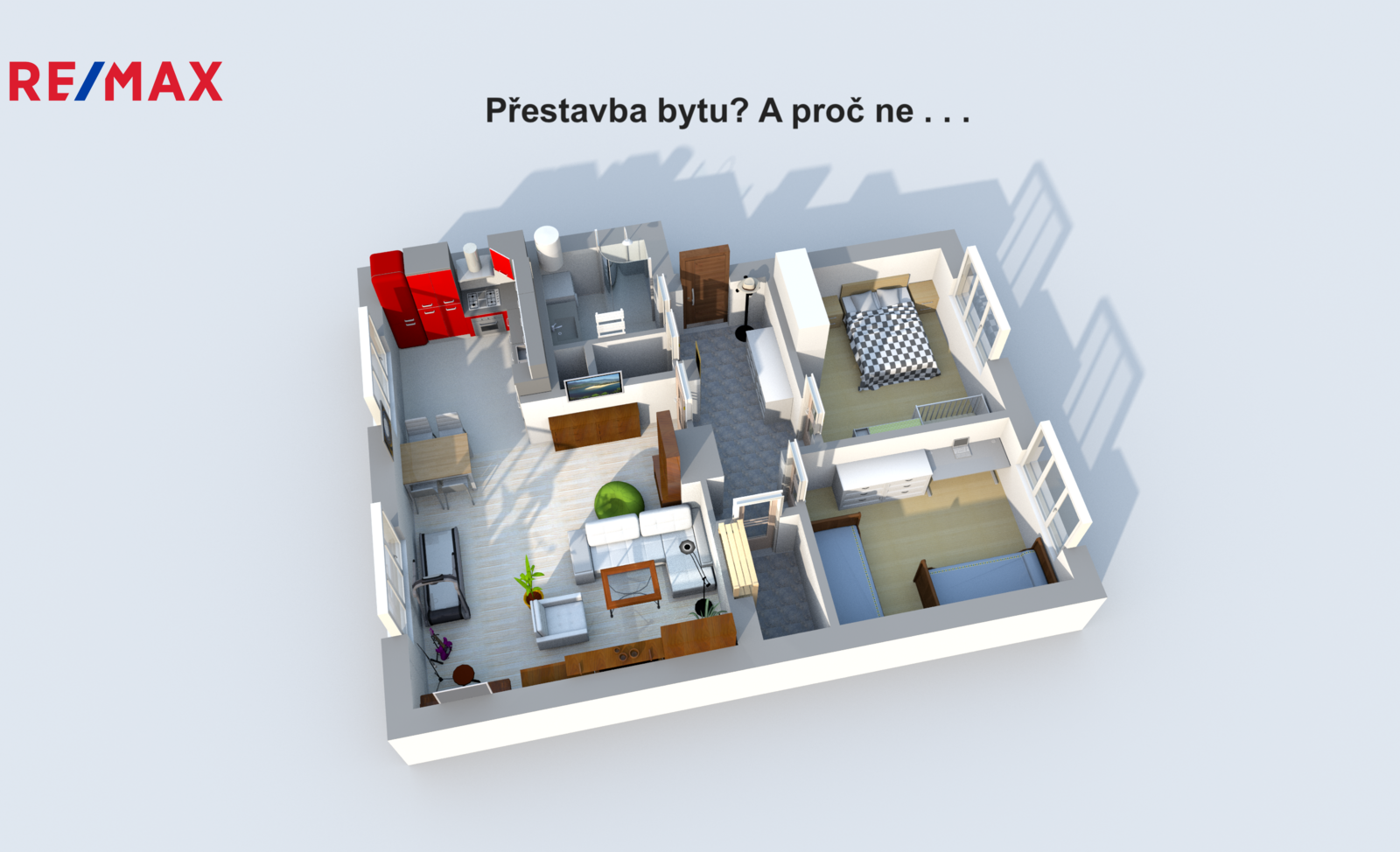 Dispozici tvoří obývací pokoj, dvě samostatné ložnice, kuchyně, chodba, koupelna, samostatné WC a také sklad/technická místnost.