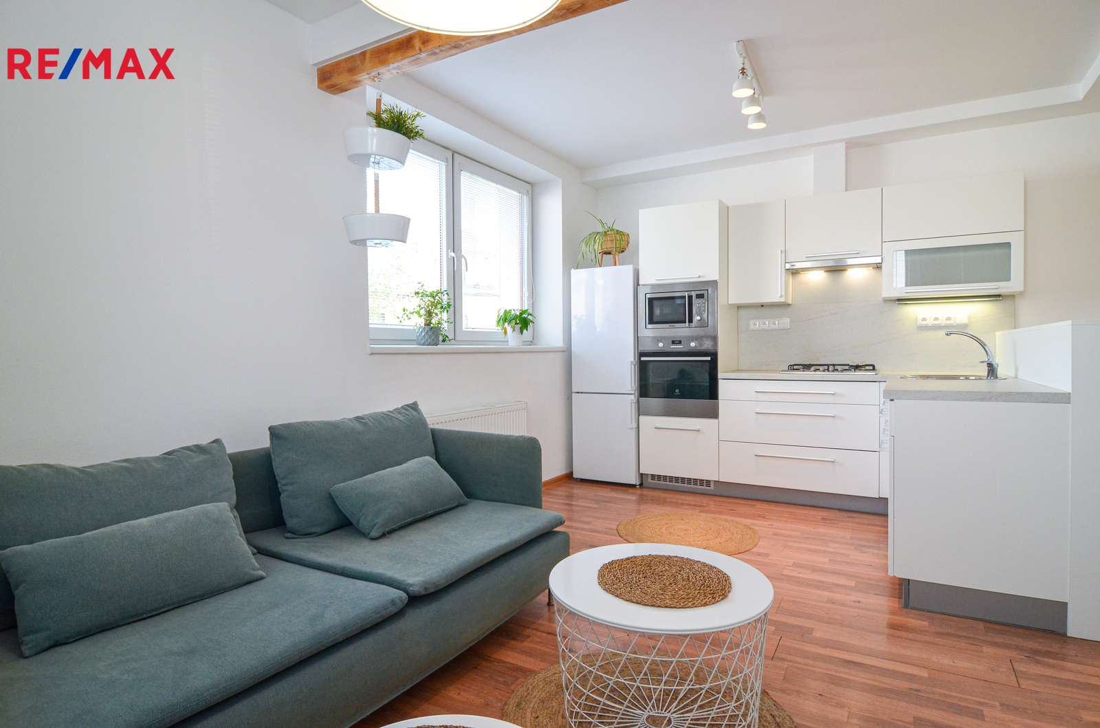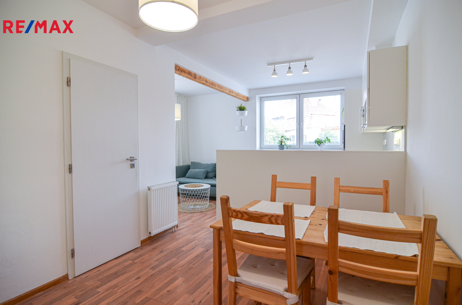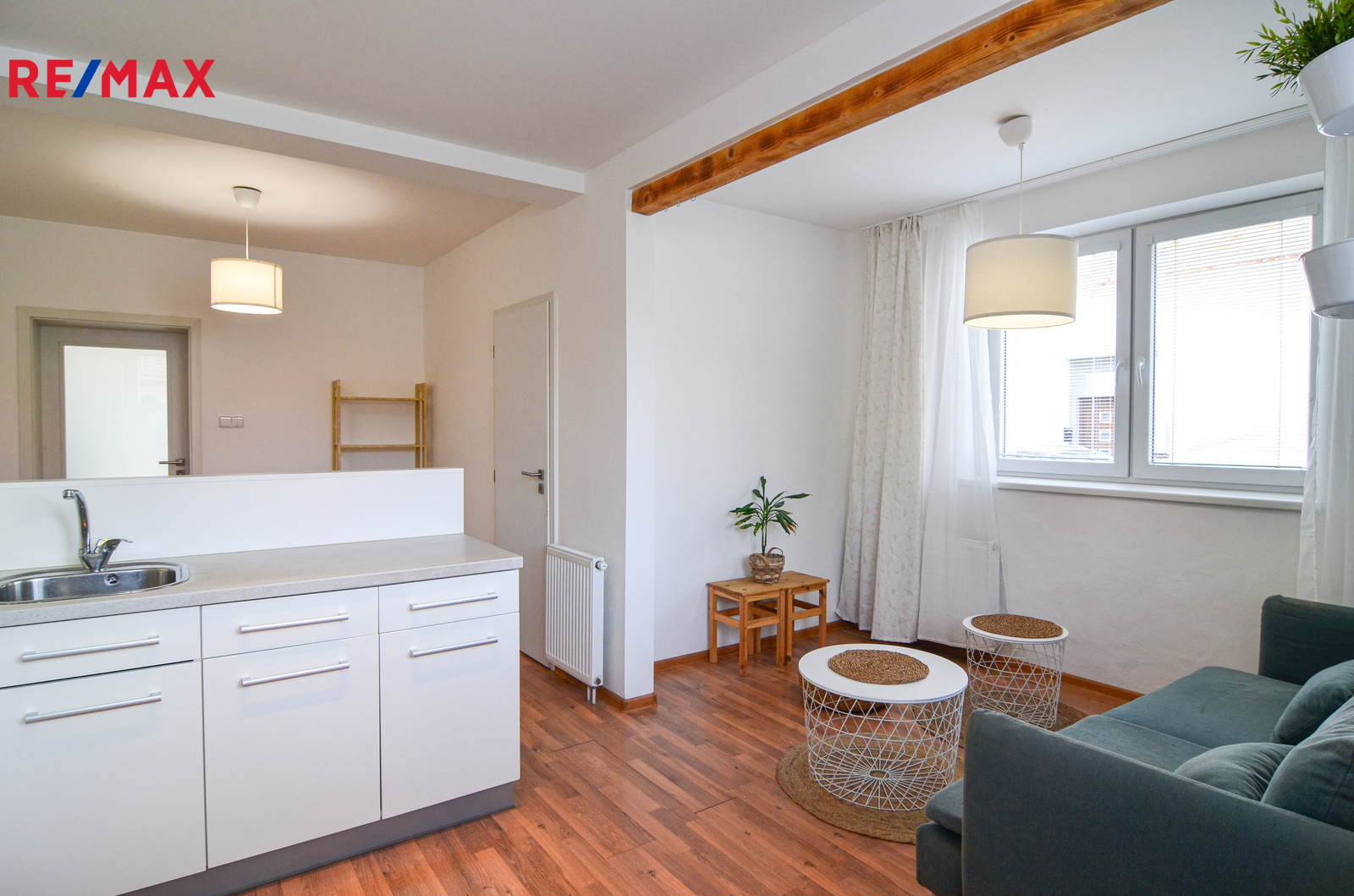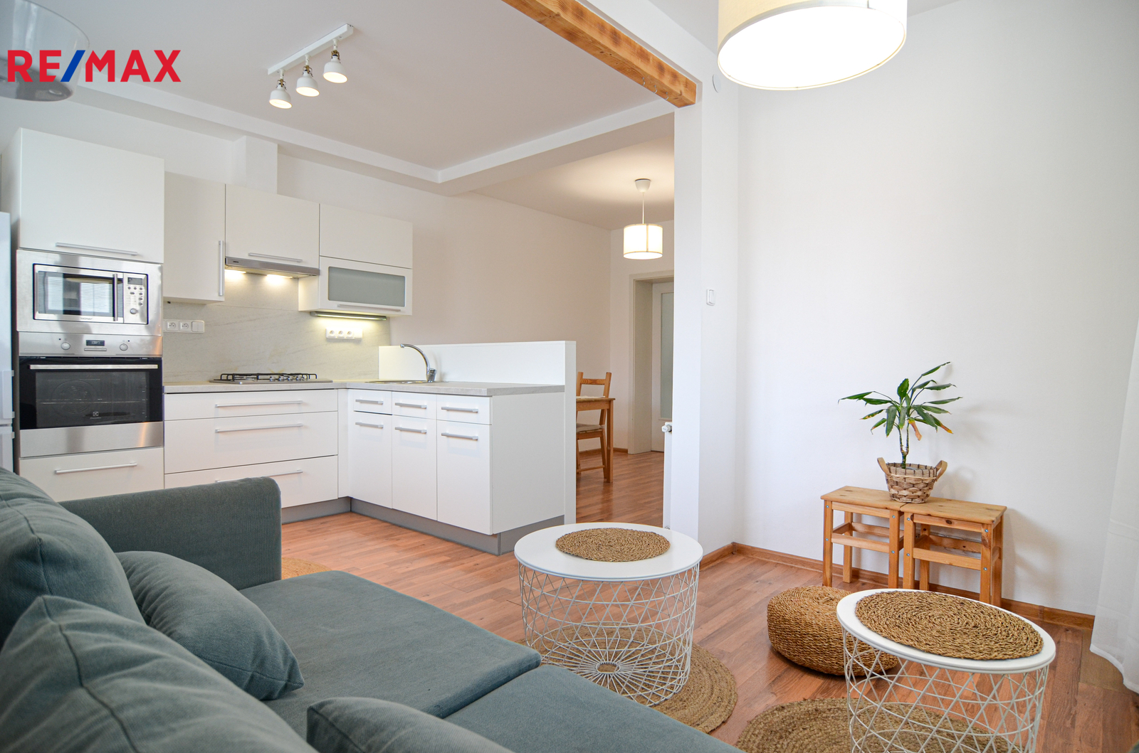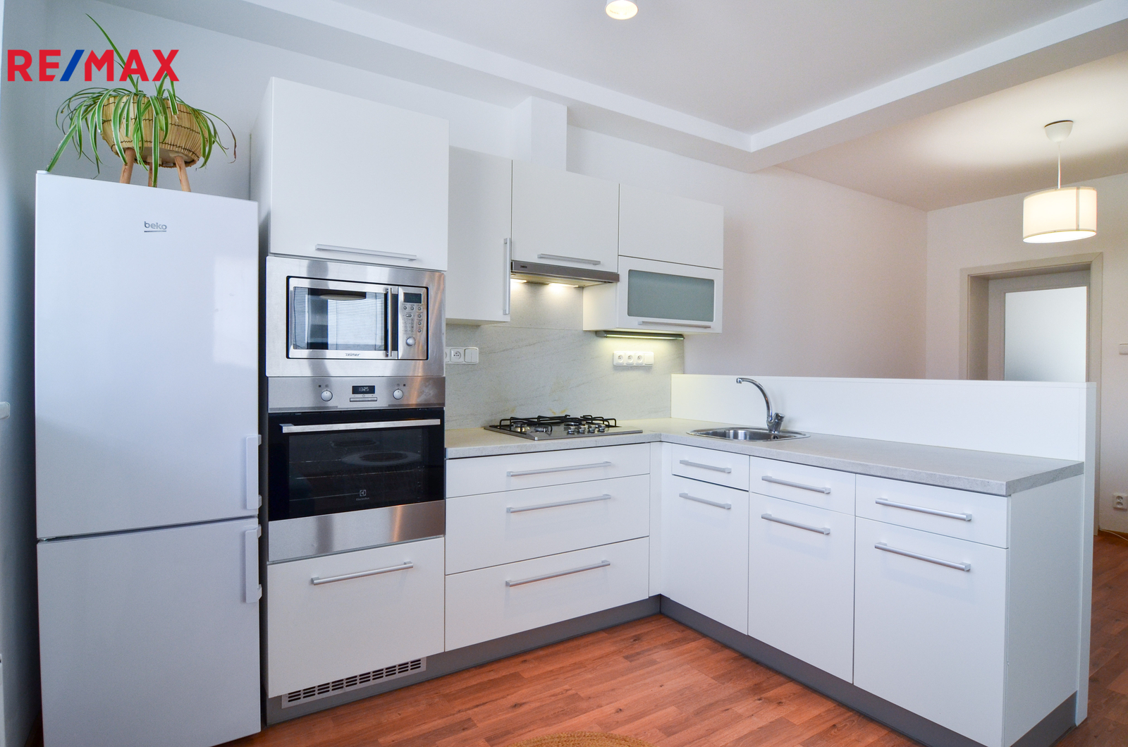 Dominantou interiéru je světlý obývací prostor propojený s kuchyní, kde je instalována moderní linka s vestavěnými spotřebiči – elektrická trouba, mikrovlnná trouba, plynová varná deska a digestoř. Nechybí ani samostatně stojící lednice s mrazákem. V obývací části navazuje místo pro jídelní stůl a pohodlné posezení u okna.
