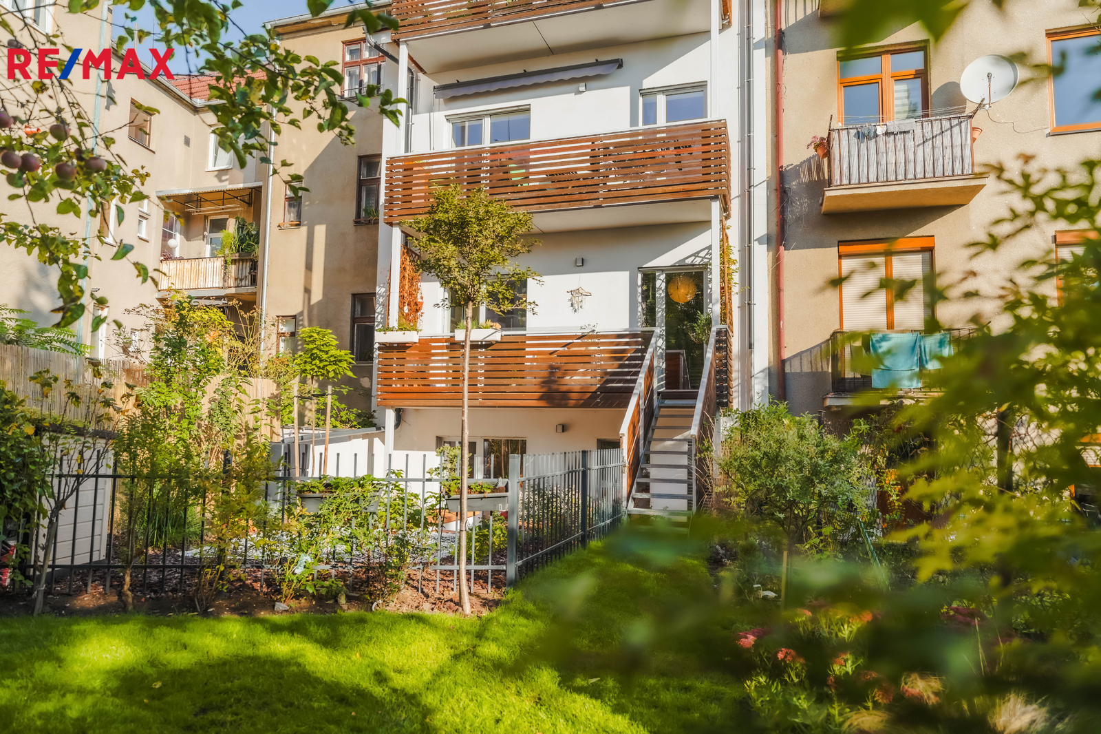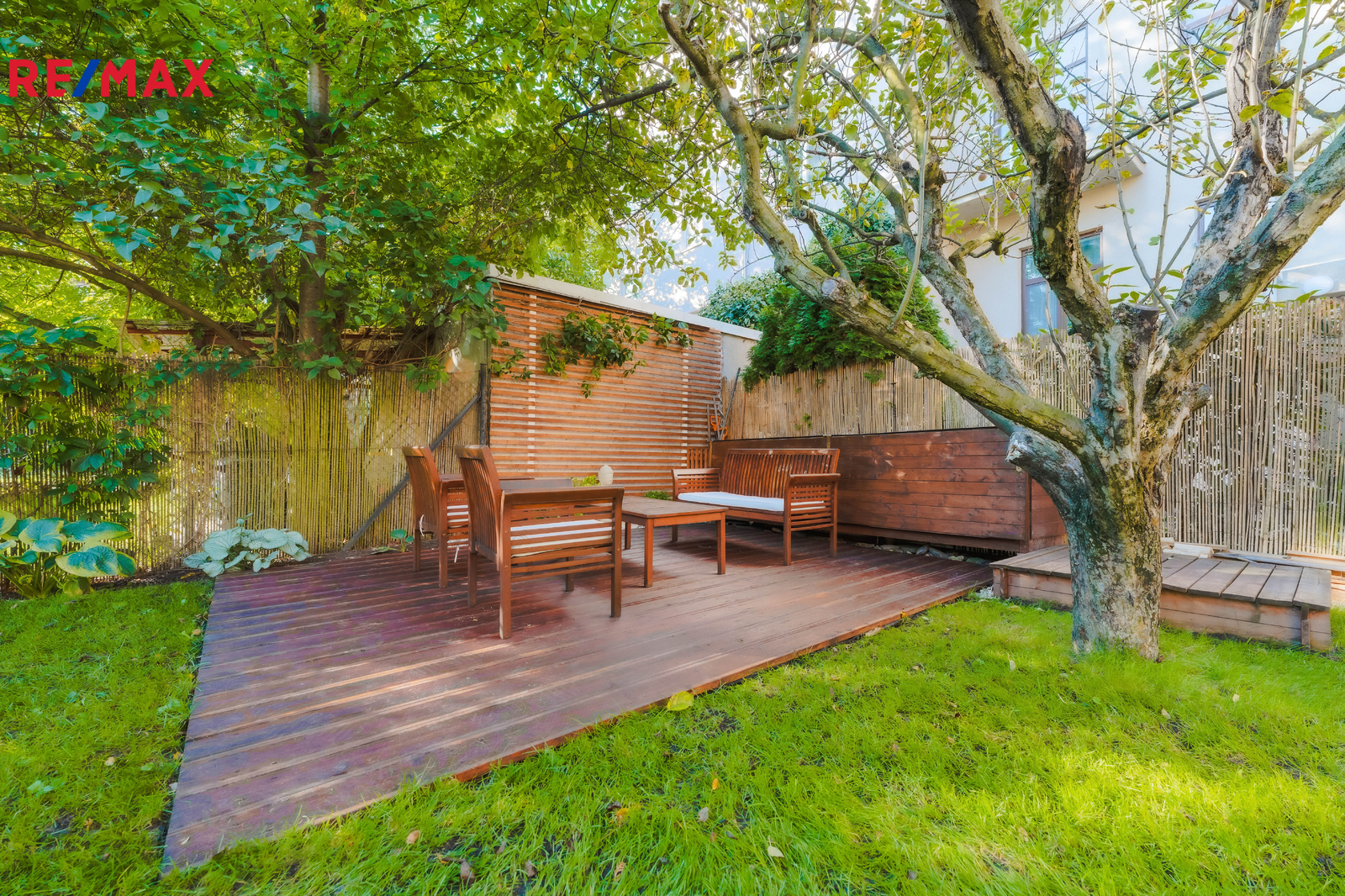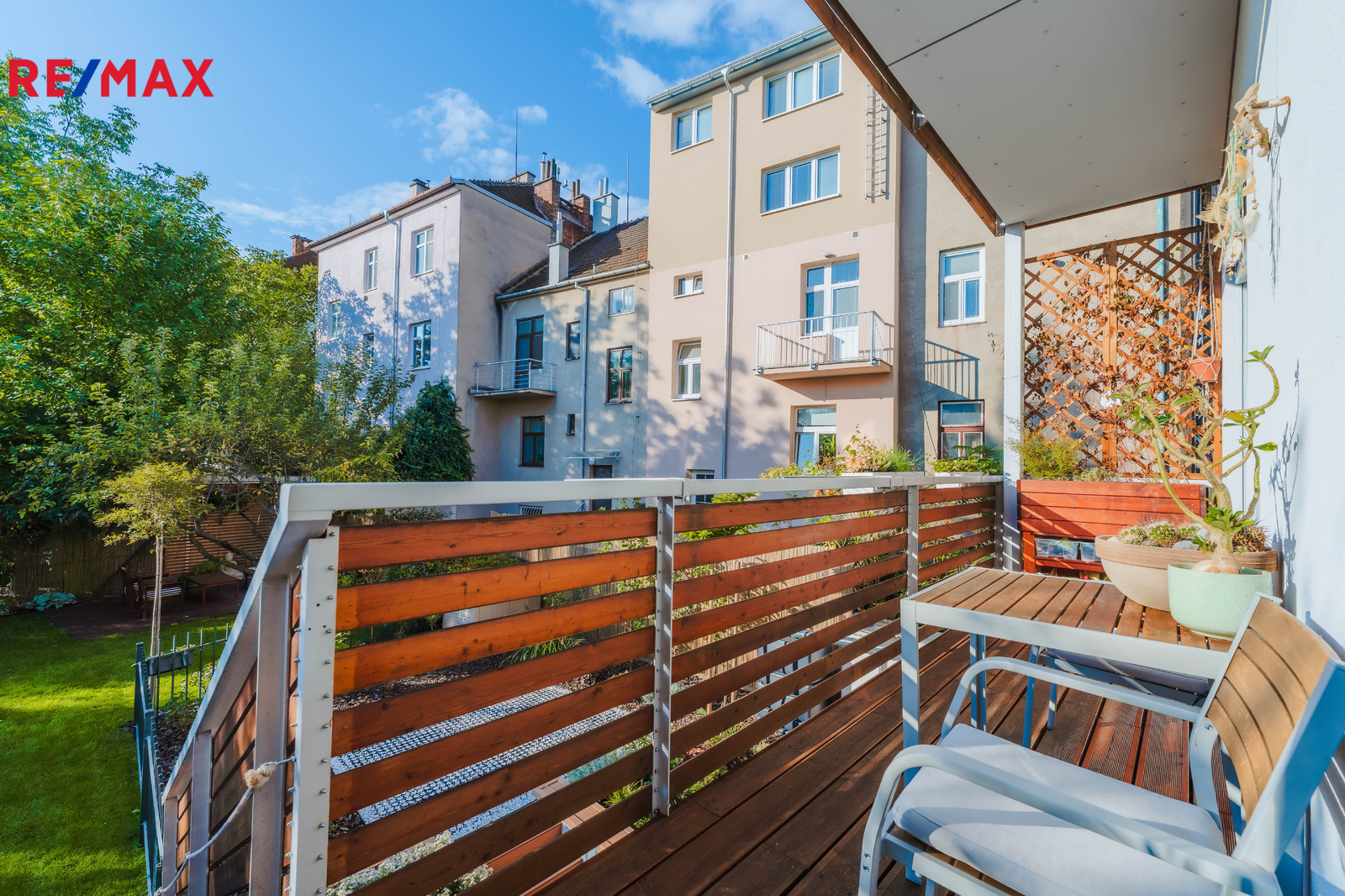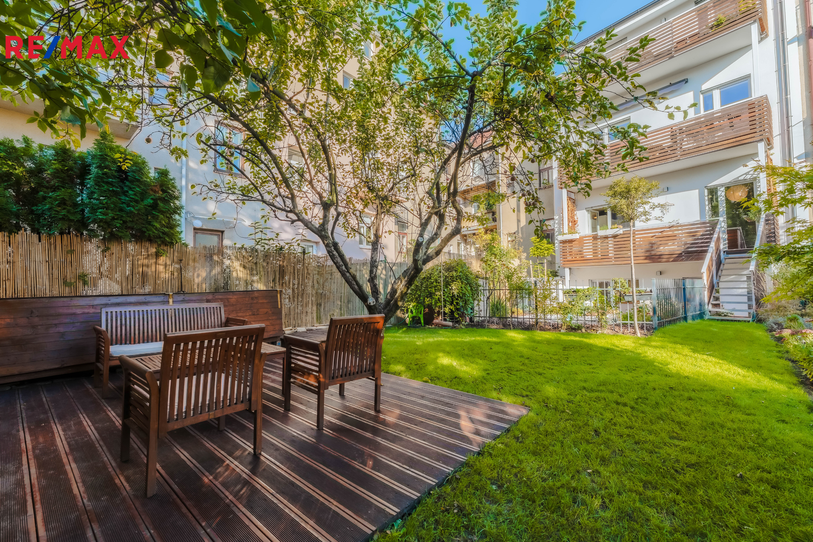 Terasa plynule navazuje na obytnou část bytu a vede z ní schodiště přímo na zahradu – ideální pro rodinné posezení, dětské hry i domácí relax.