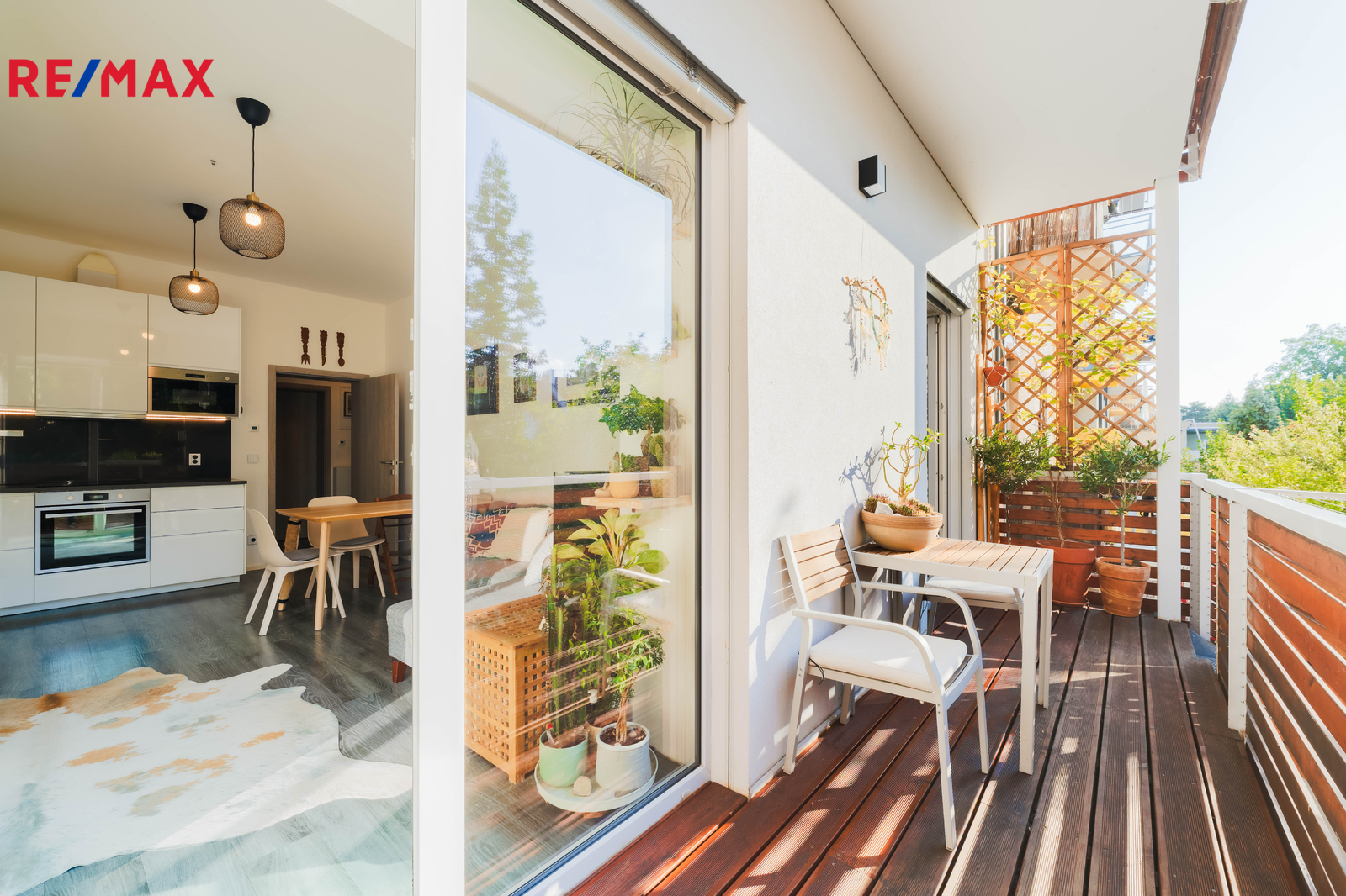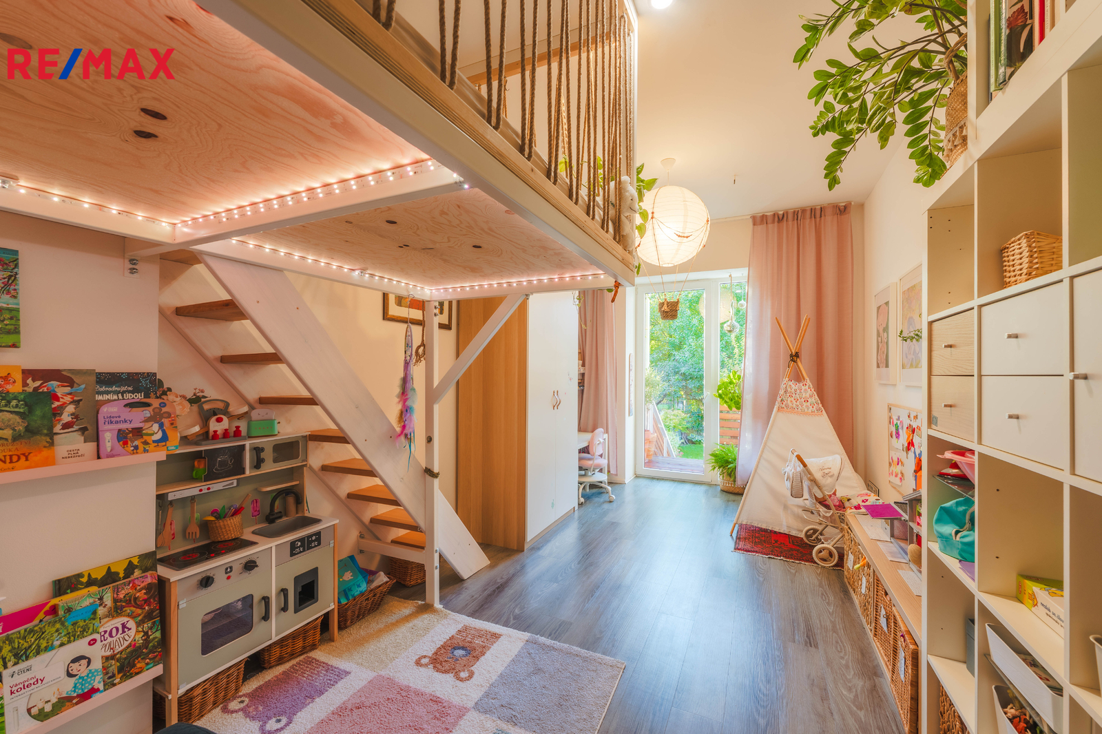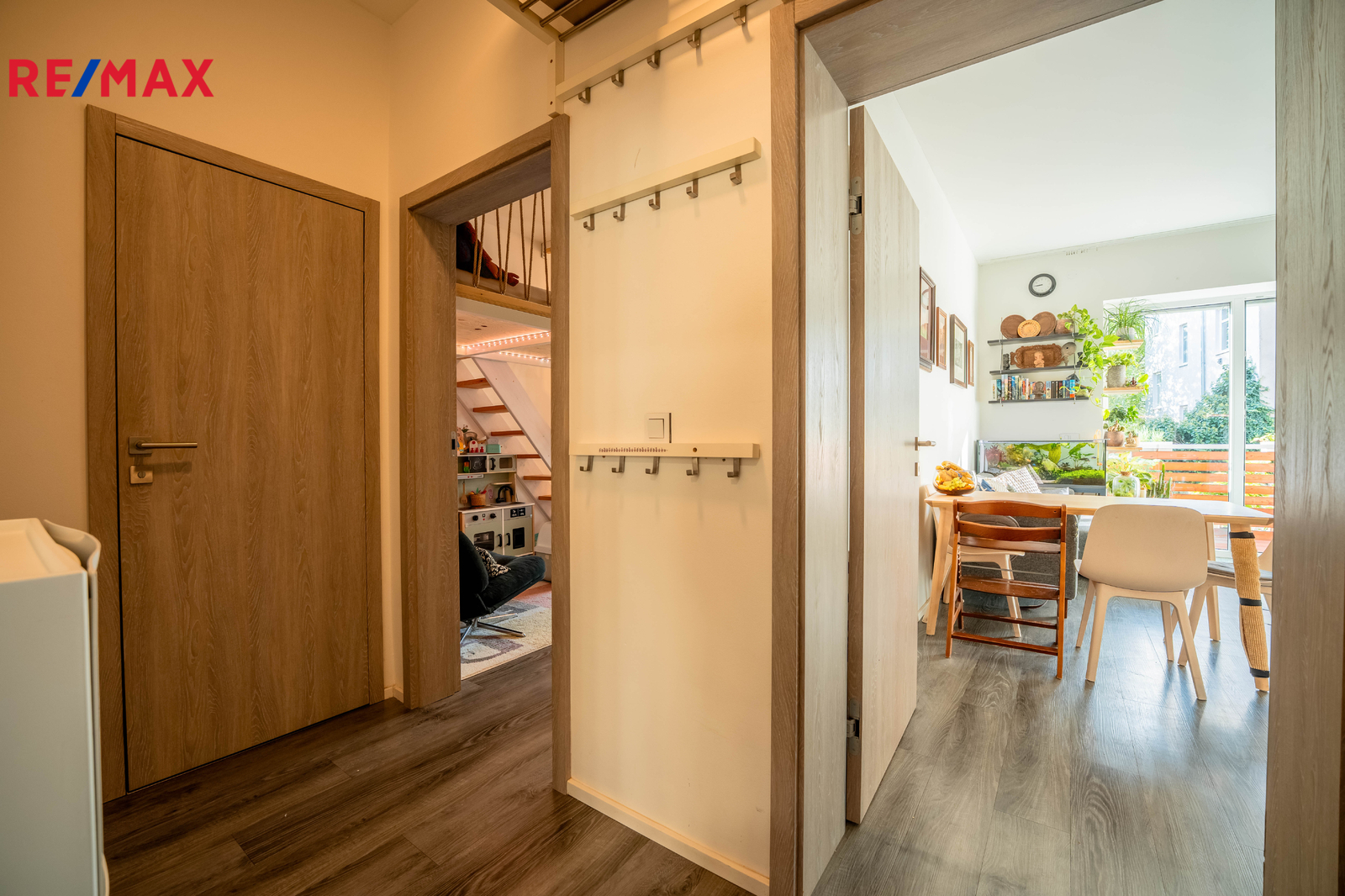 Terasa plynule navazuje na obytnou část bytu a vede z ní schodiště přímo na zahradu – ideální pro rodinné posezení, dětské hry i domácí relax.