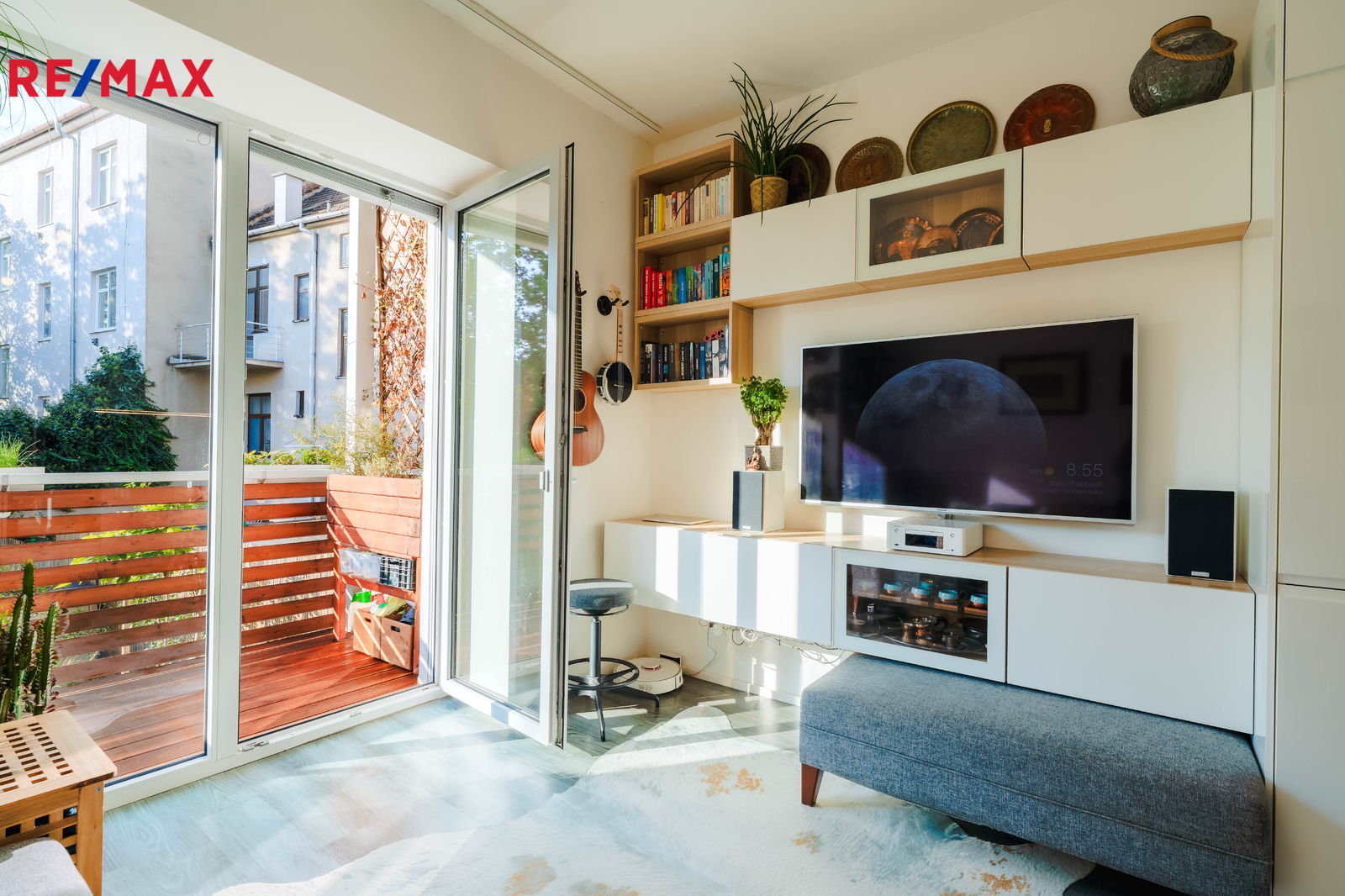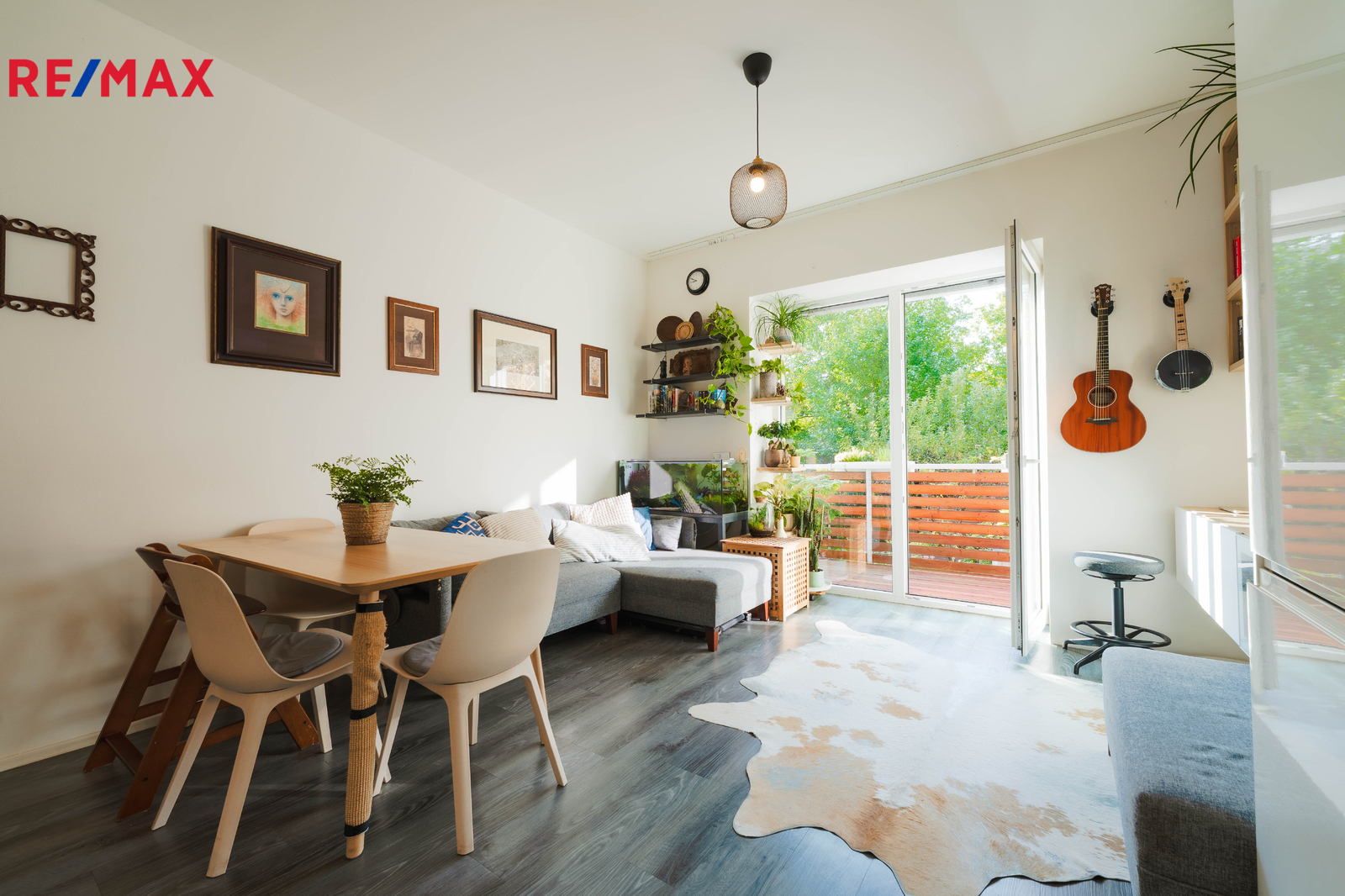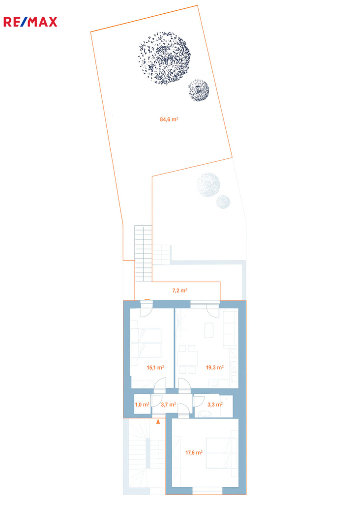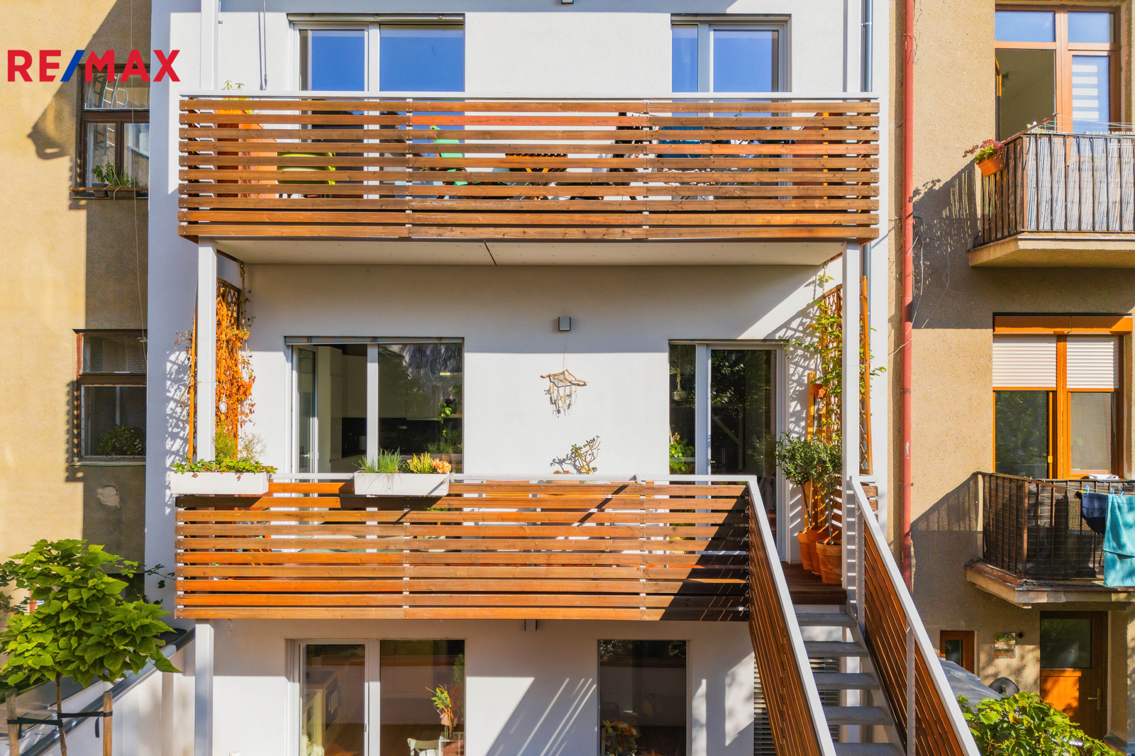 Terasa plynule navazuje na obytnou část bytu a vede z ní schodiště přímo na zahradu – ideální pro rodinné posezení, dětské hry i domácí relax.