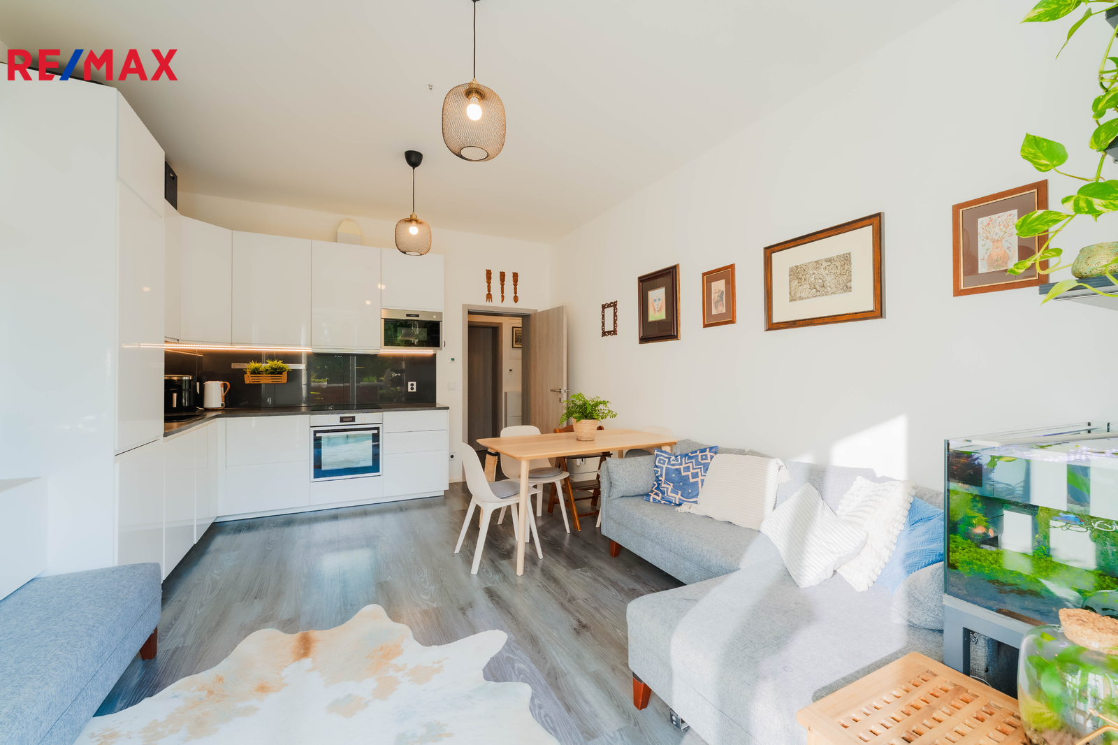 - obývací pokoj s kuchyňským koutem 19,3 m² je srdcem bytu a díky vstupu na terasu působí ještě prostorněji