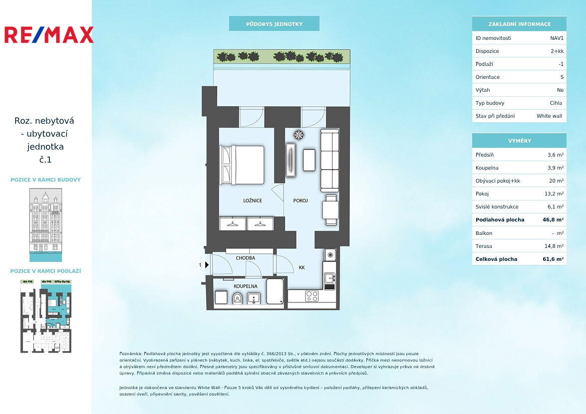 Svěží ubytovací jednotka č. 1 ve standardu White Wall o podlahové ploše 47.1 m² nabízí dispozici 2+kk a navíc předzahrádku o rozloze 15.8 m².