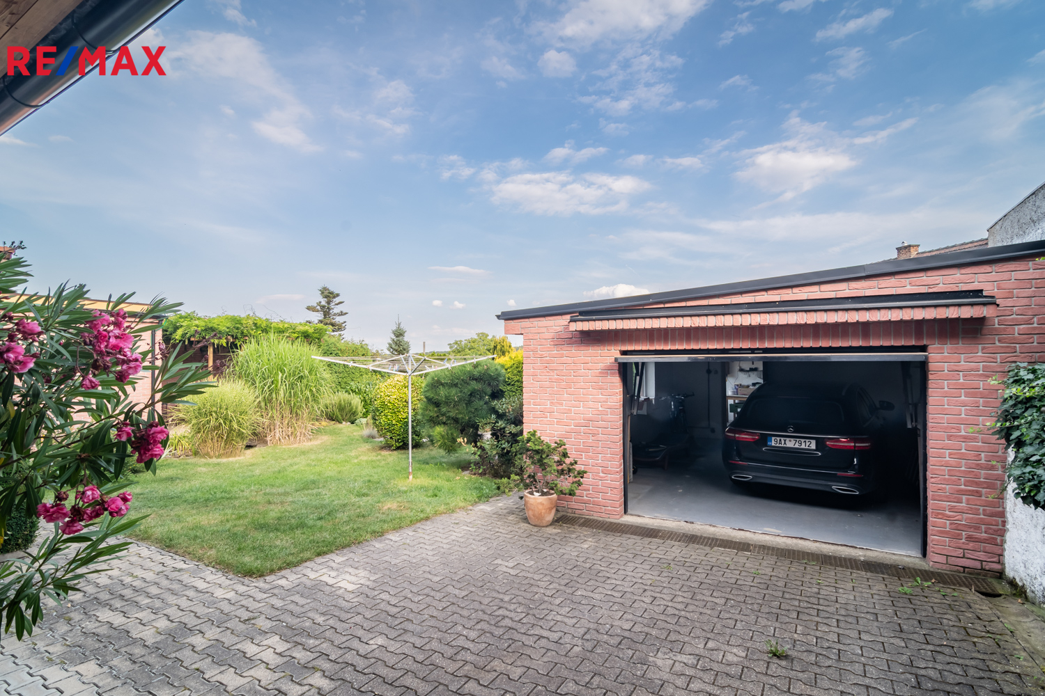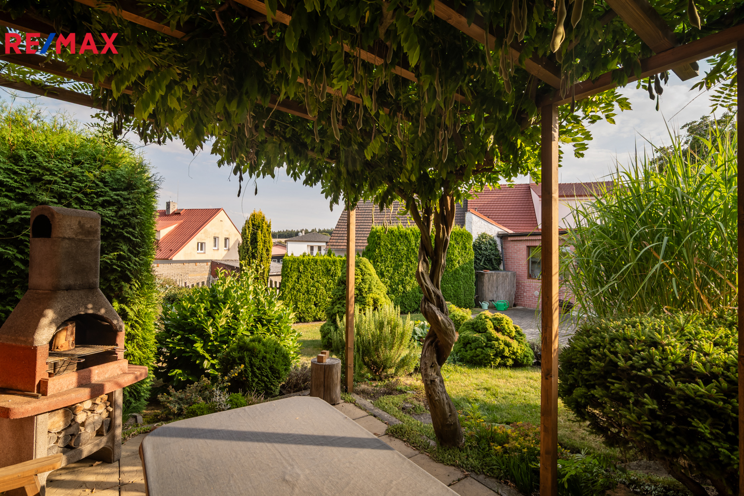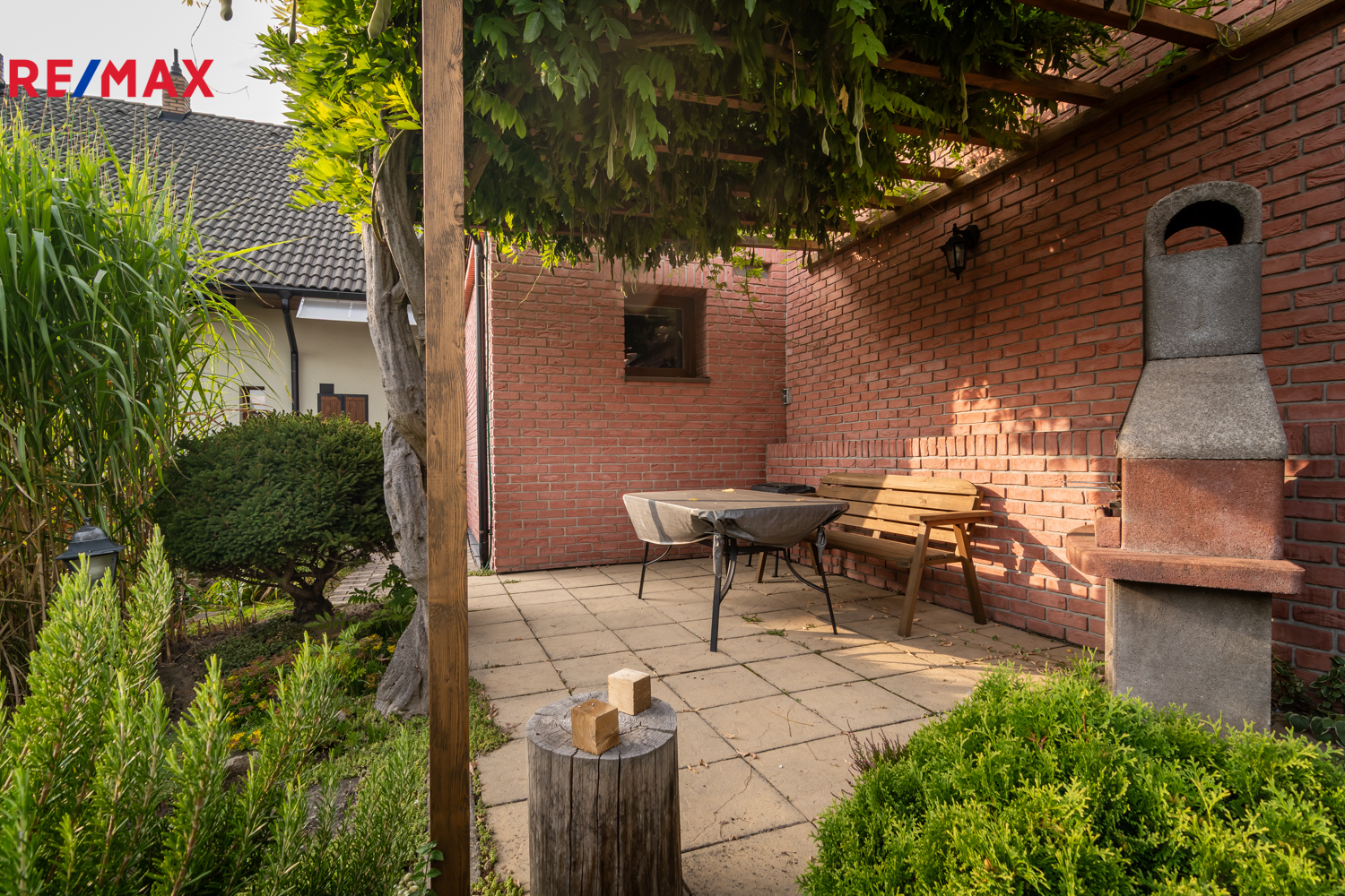 Celková výměra pozemku je 533 m2, zastavěná plocha domu včetně zpevněných ploch je 355 m2. Na pozemek je vjezd přes zmíněný průjezd, do kterého se za sebou vejdou 2 menší auta + parkování v garáži. Výměra garáže s dílnou je cca 40 m2). Zahrada je ve velmi dobrém stavu s několika vzrostlými stromy, keři a příjemným posezením pod pergolou s venkovním krbem.