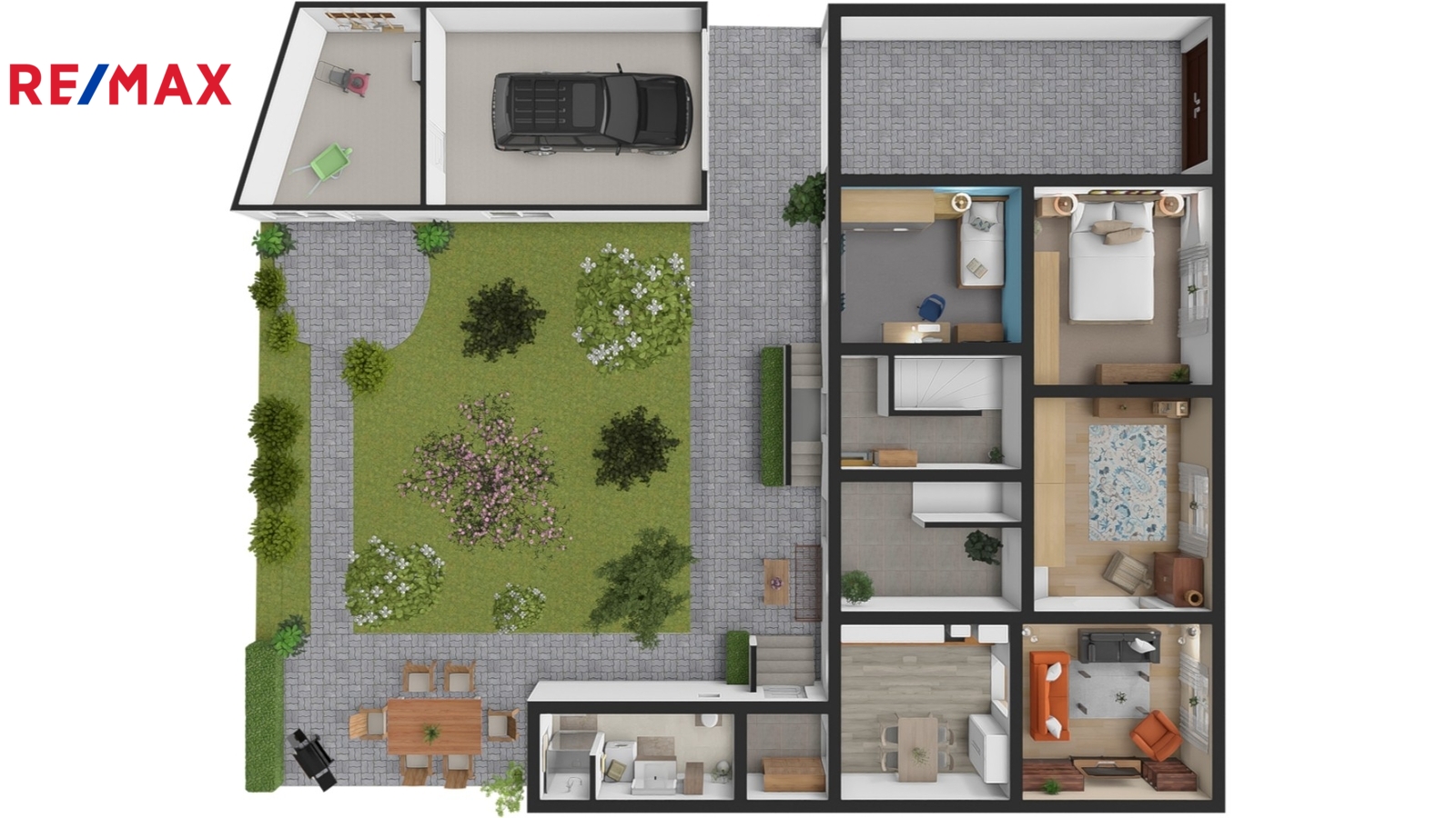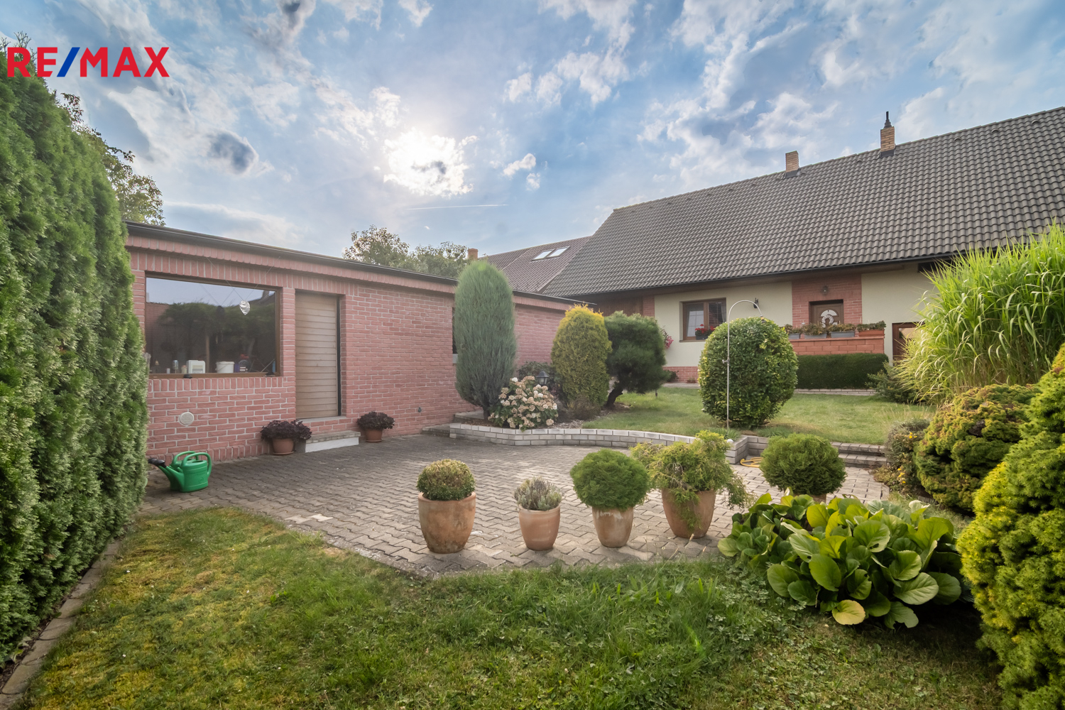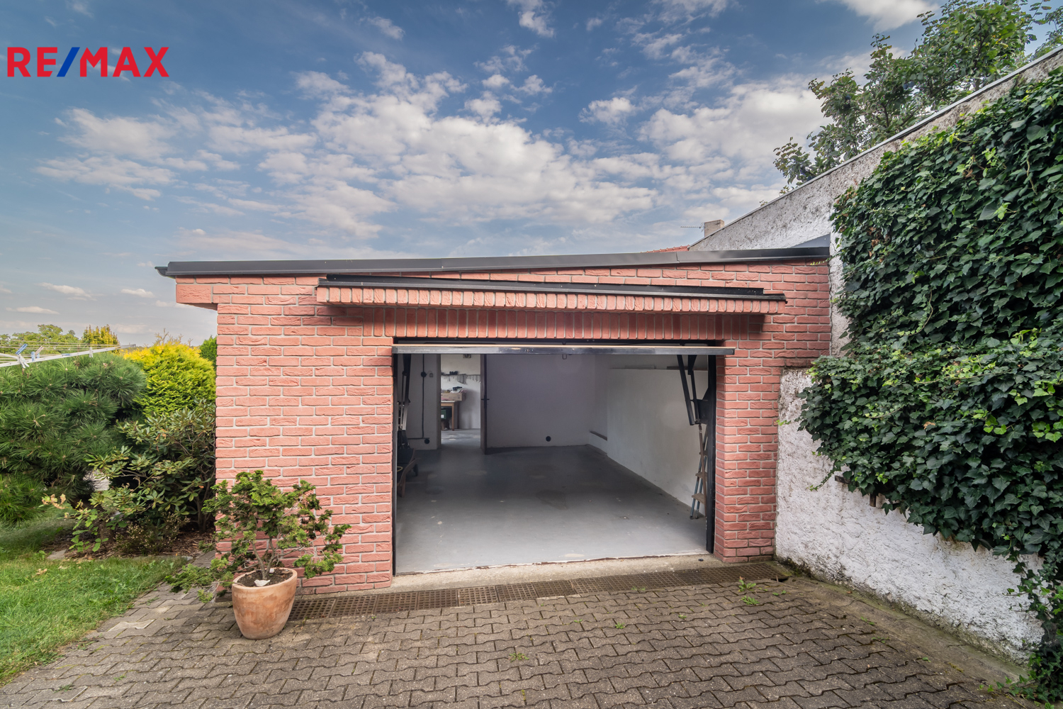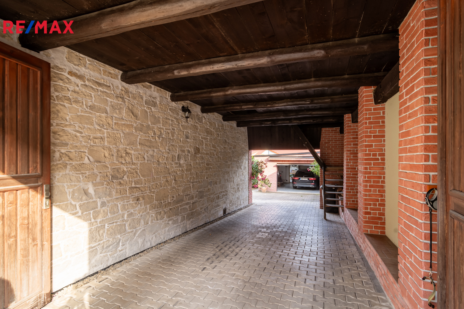 Celková výměra pozemku je 533 m2, zastavěná plocha domu včetně zpevněných ploch je 355 m2. Na pozemek je vjezd přes zmíněný průjezd, do kterého se za sebou vejdou 2 menší auta + parkování v garáži. Výměra garáže s dílnou je cca 40 m2). Zahrada je ve velmi dobrém stavu s několika vzrostlými stromy, keři a příjemným posezením pod pergolou s venkovním krbem.