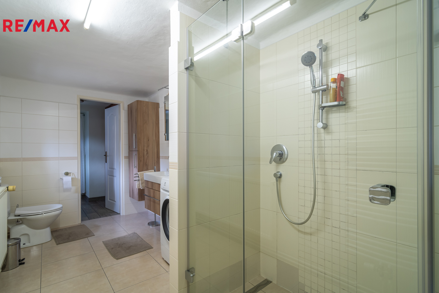 Přízemí domu má dispozici 4+1, kde kromě prostorného obývacího pokoje, samostatné kuchyně s jídelnou, tří pokojů, pracovny (ve vyvýšené části nad prádelnou), je v přístavbě koupelna s WC a druhý vstup do domu. Užitná plocha 1.NP je cca 123 m2. Součástí půdorysu domu je i průjezd s výměrou cca 33 m2.
