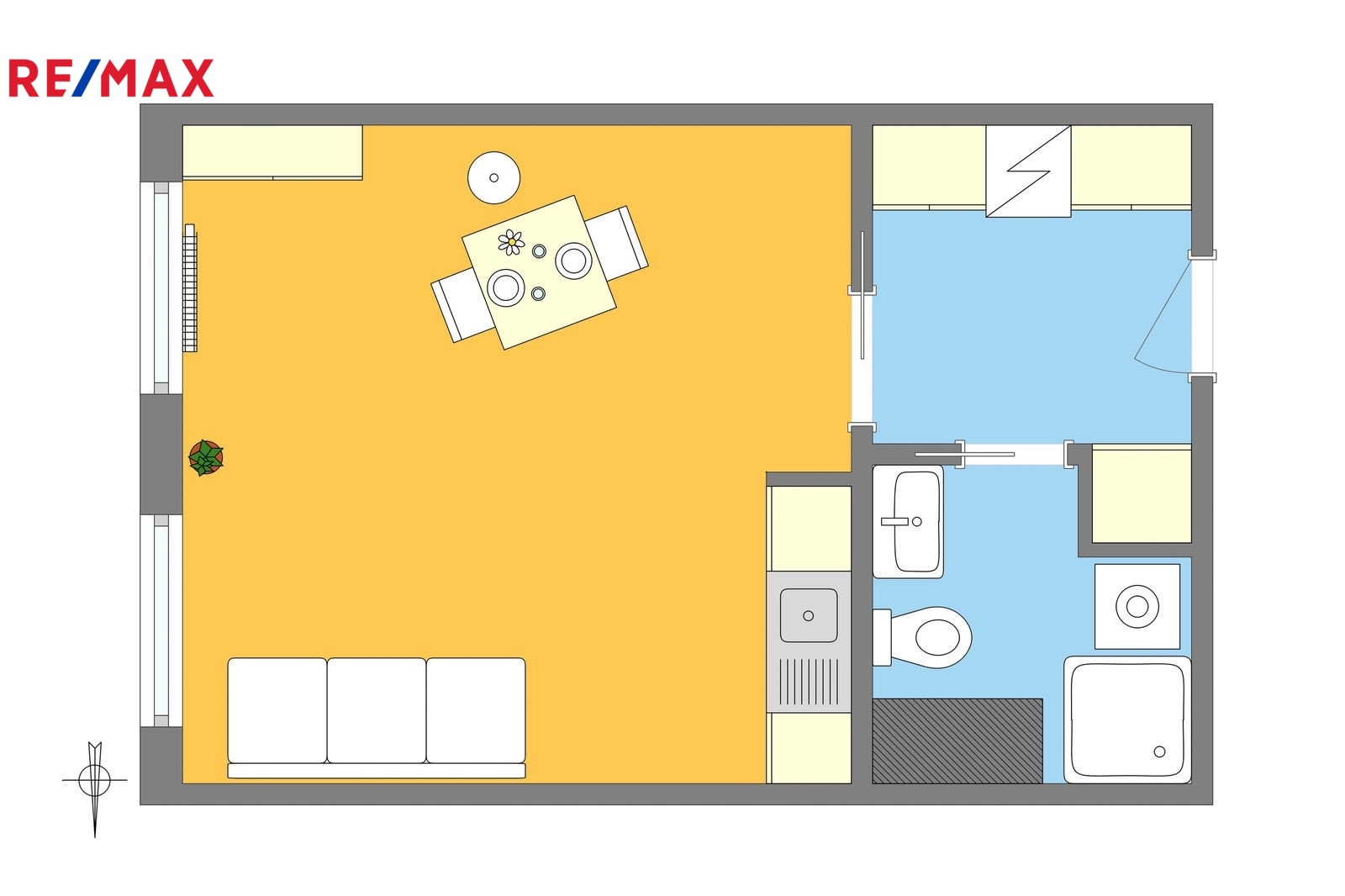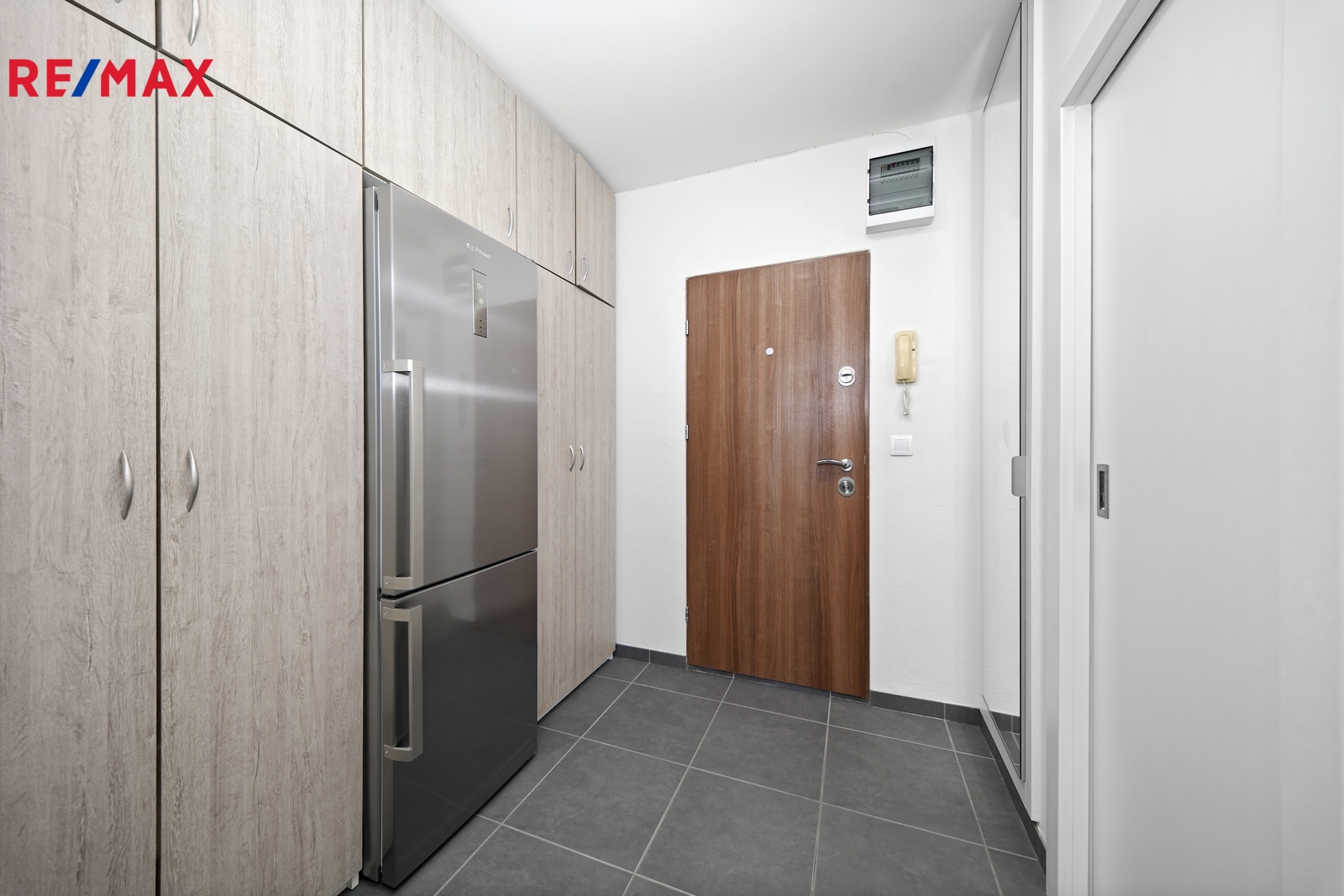 Byt tvoří obytná místnost s kuchyňským koutem a dvěma velkými okny orientovanými na východ, které zajišťují dostatek denního světla a volný výhled do okolí. Předsíň je vybavena vestavěnou skříní a botníkem, samozřejmostí je moderní koupelna se sprchovým koutem a WC. Při rekonstrukci byly instalovány nové bezpečnostní vstupní dveře a praktické interiérové zasouvací dveře, které šetří prostor. K bytu náleží také sklepní kóje o velikosti 1,7 m².