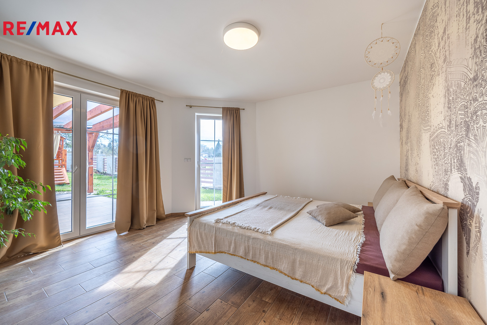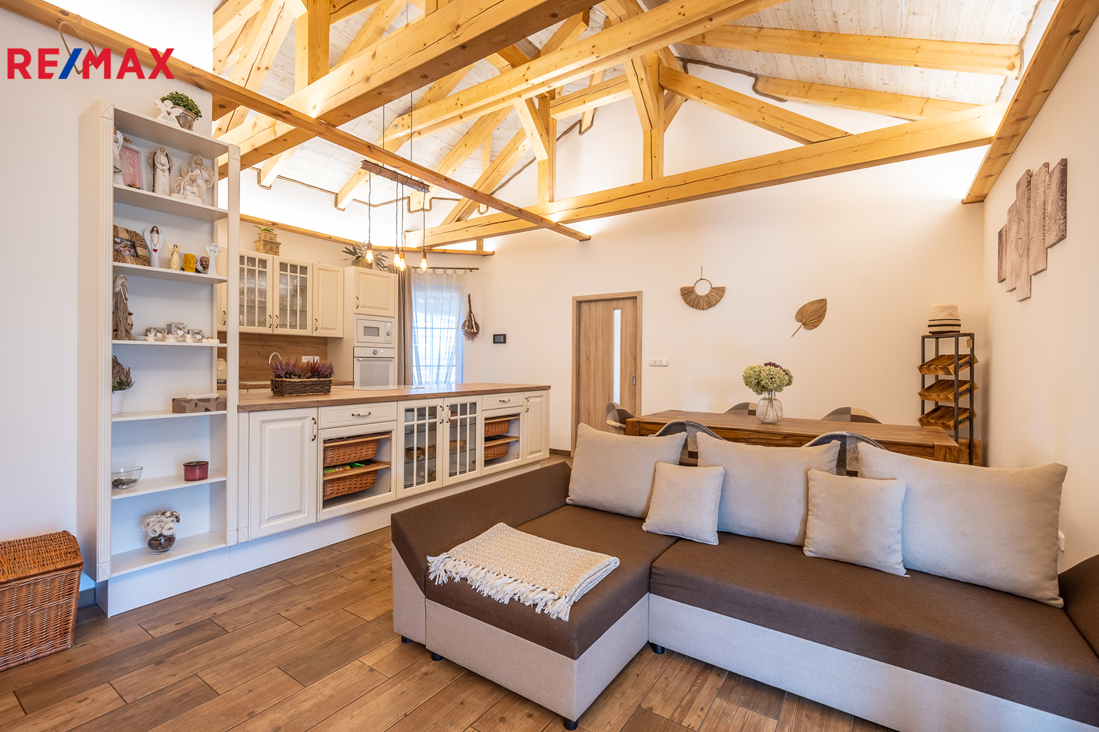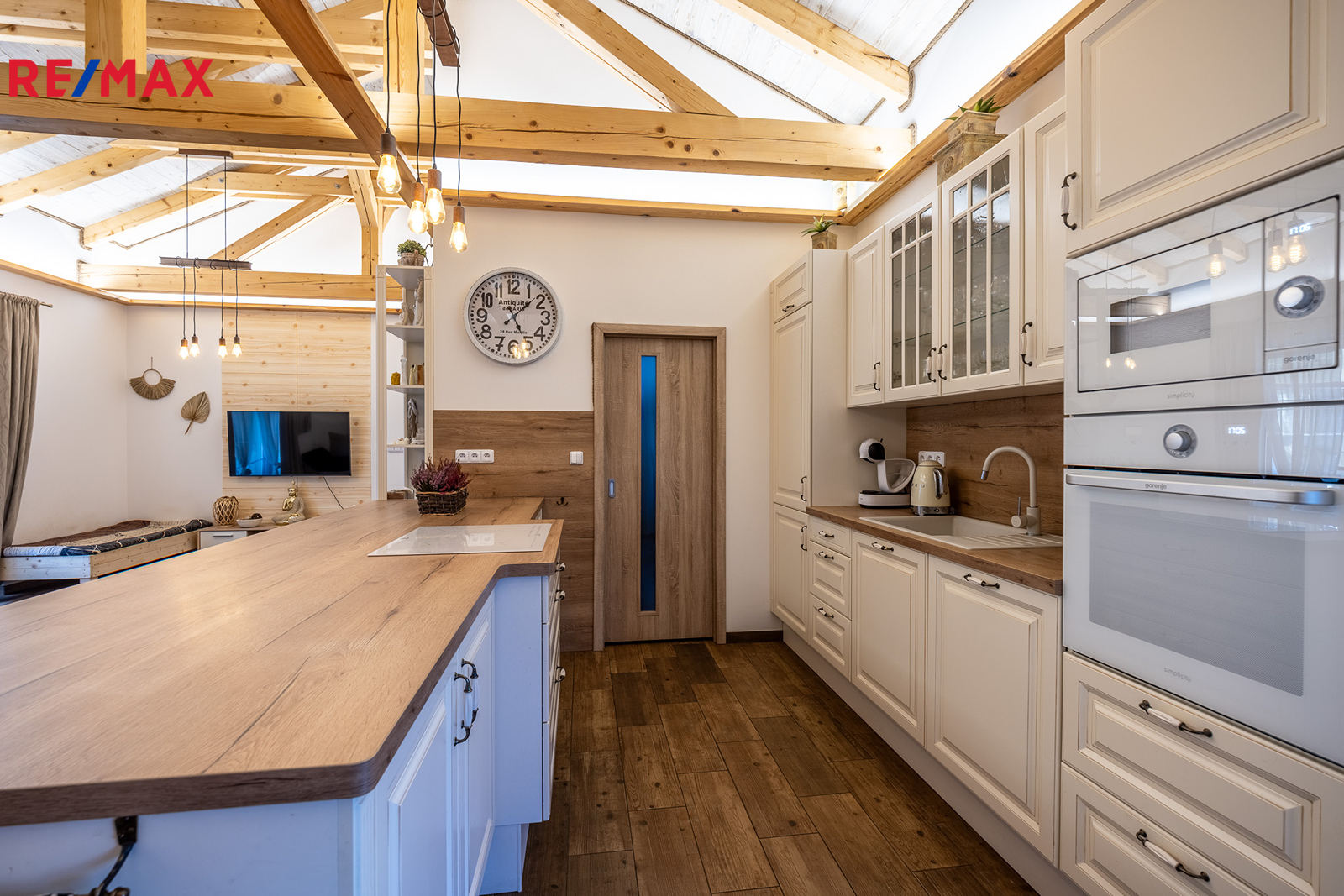 Dominantou domu je prostorná kuchyně propojená s obývacím pokojem, kde vás na první pohled zaujme otevřený strop s přiznanými krovy a decentním podsvícením, které vytváří útulnou atmosféru. V kuchyni byl použit masiv, což zajišťuje nejen vysokou kvalitu, ale i nadčasový vzhled. Celý dům je orientován na jih, což zaručuje dostatek přirozeného světla po celý den. V každém pokoji jsou francouzské dveře a je tak možné projít na zahradu přímo z pokoje, či ložnice.