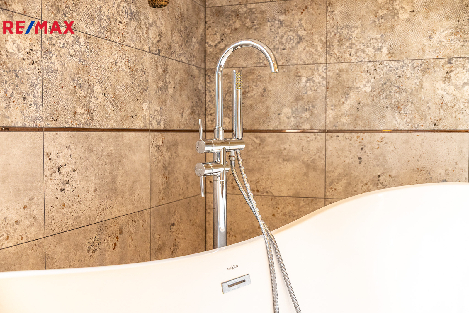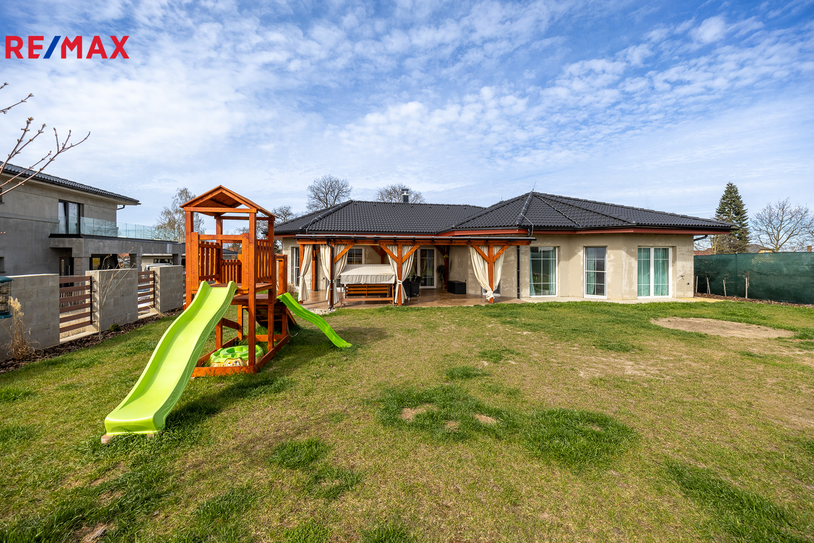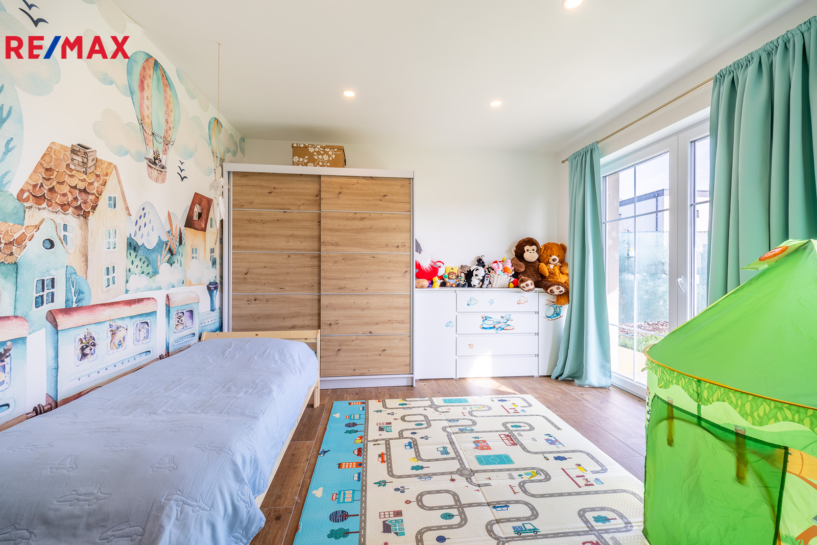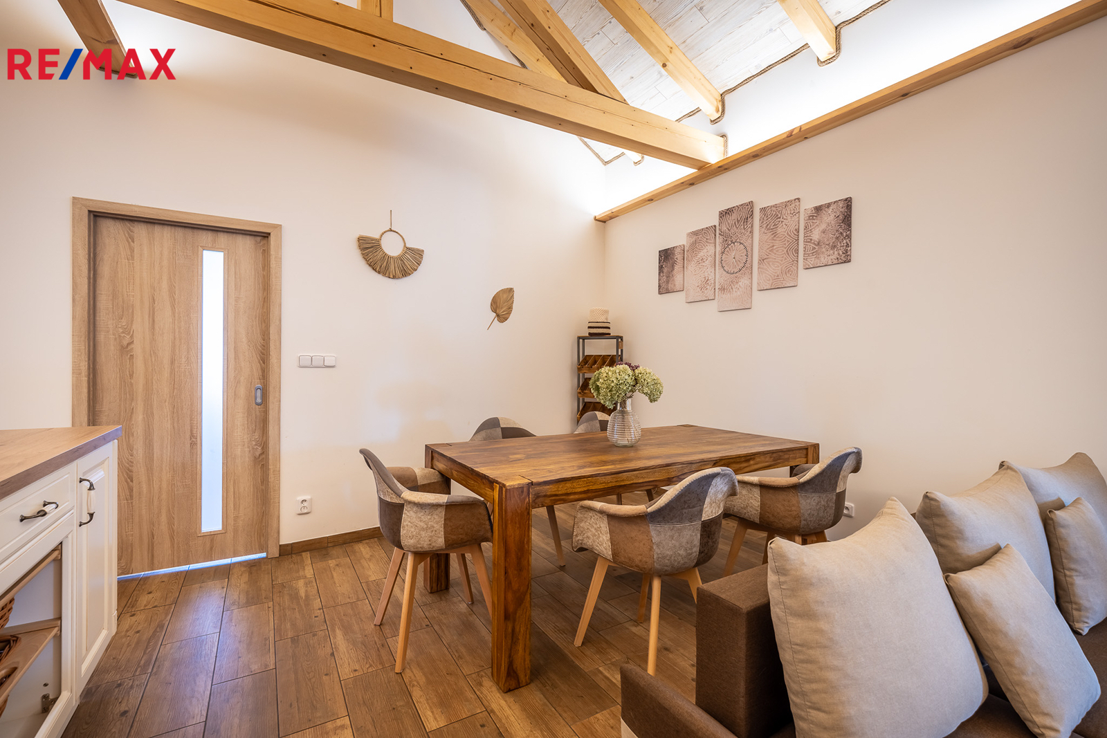 Dominantou domu je prostorná kuchyně propojená s obývacím pokojem, kde vás na první pohled zaujme otevřený strop s přiznanými krovy a decentním podsvícením, které vytváří útulnou atmosféru. V kuchyni byl použit masiv, což zajišťuje nejen vysokou kvalitu, ale i nadčasový vzhled. Celý dům je orientován na jih, což zaručuje dostatek přirozeného světla po celý den. V každém pokoji jsou francouzské dveře a je tak možné projít na zahradu přímo z pokoje, či ložnice.