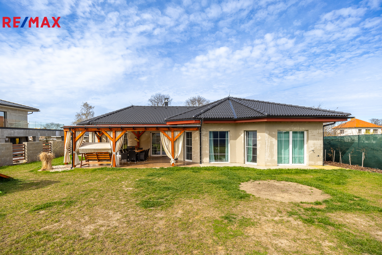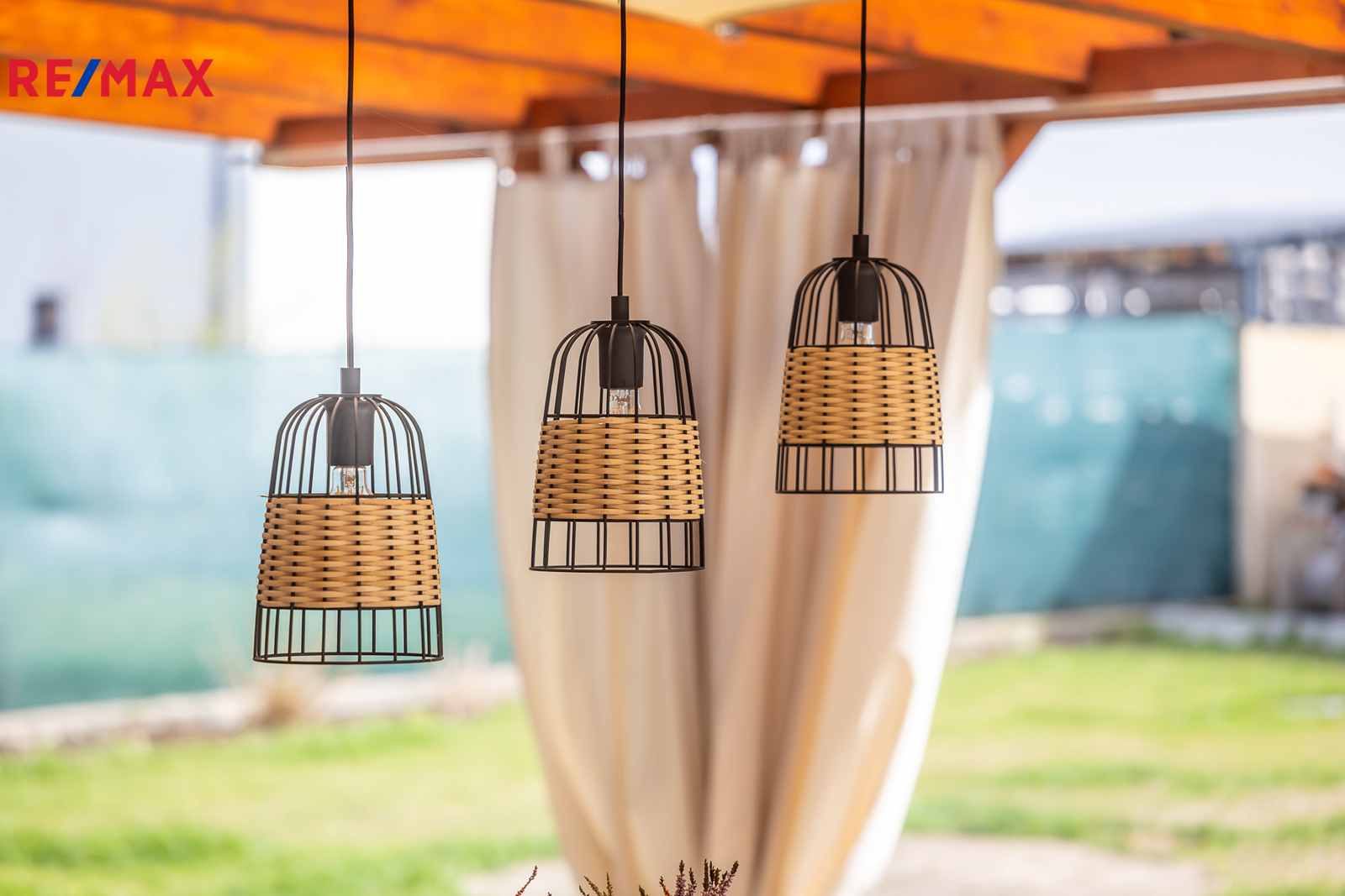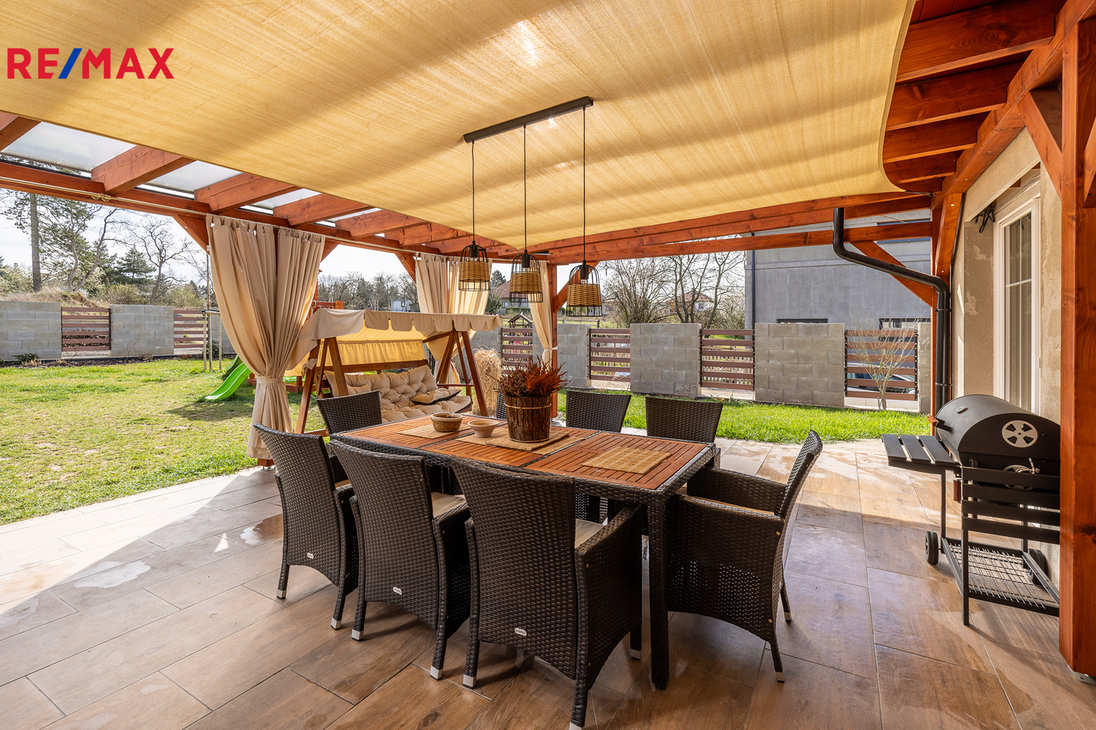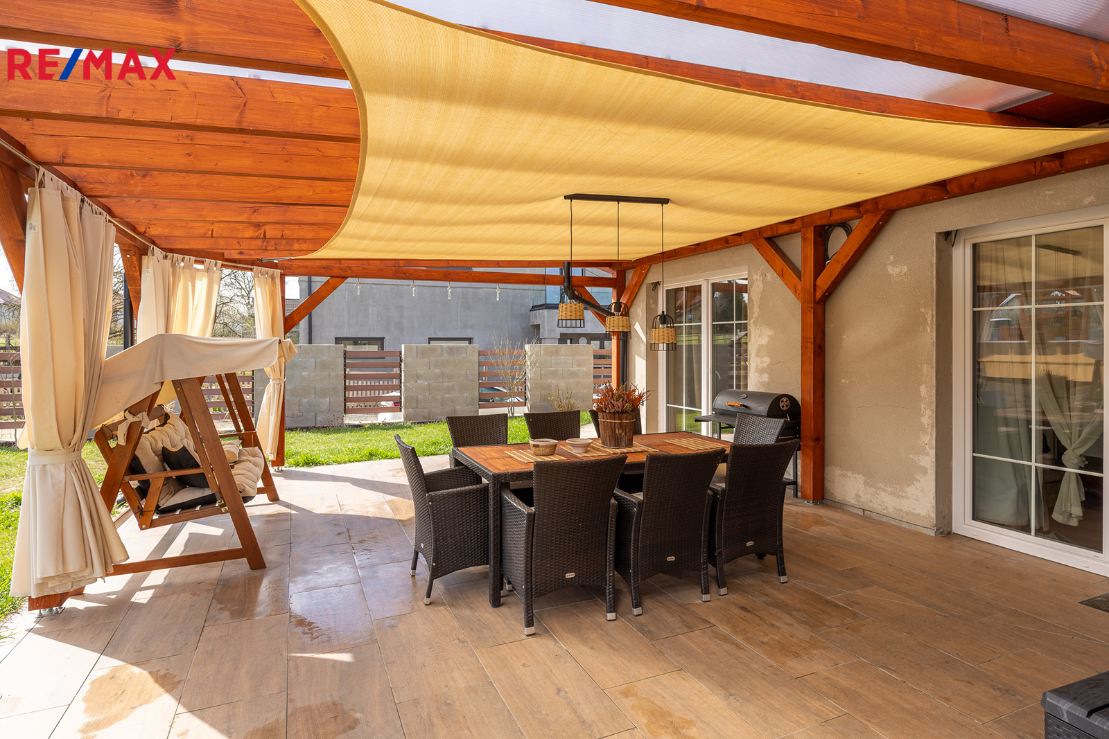 Součástí domu je také velká a zastřešená terasa, ideální pro relaxaci či posezení s přáteli – slunce si zde užijete od rána až do večera.