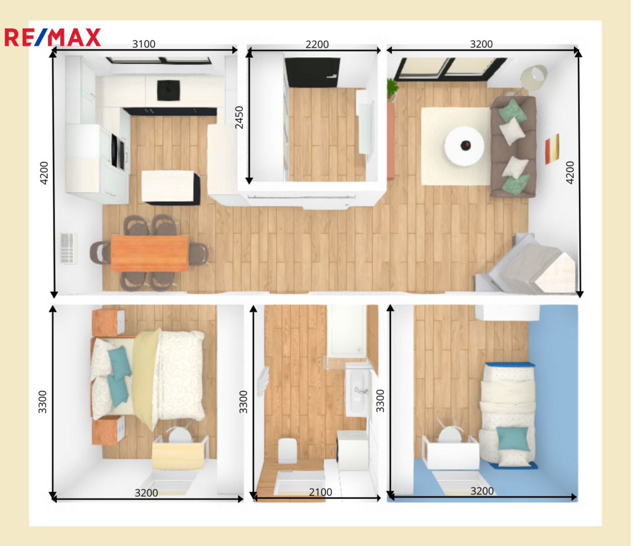 • 2. NP (obytná část): 63,95 m² – kuchyň, obývací pokoj, dva pokoje a koupelna
