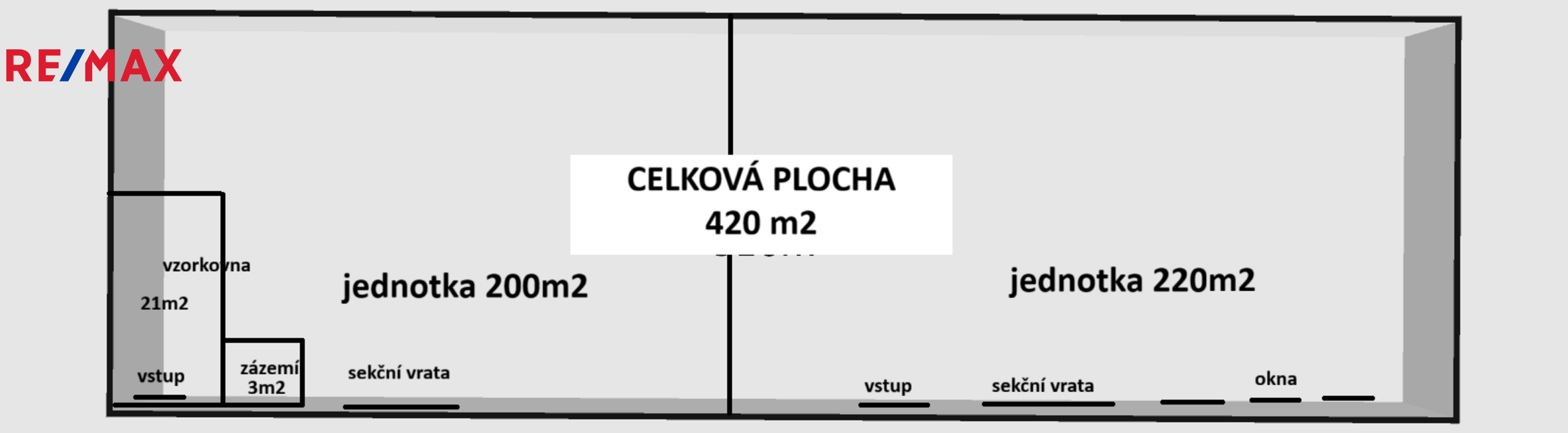 Jednotka je součástí prostoru o celkové výměře 420m², v současné chvíli je oddělena příčkou a navazuje přímo na úroveň venkovní manipulační plochy monitorované kamerovým systémem. Jednotka má samostatný vchod a vjezd se sekčními vraty pro vykládku&nakládku. Dostatečná parkovací plocha pro zákazníky i zaměstnance.