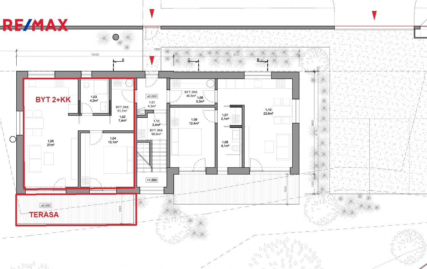 Moderní projekt zahrnuje pouze tři bytové jednotky v domě, čímž je zajištěno soukromí i dostatek prostoru pro pohodlné bydlení.