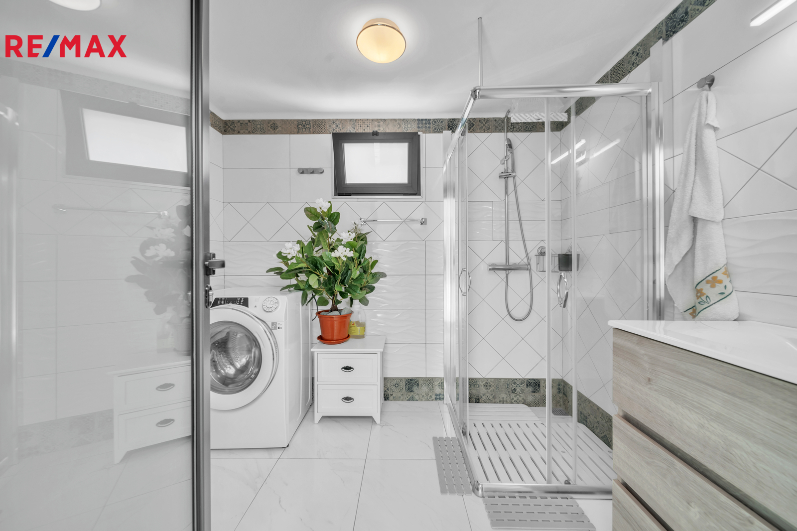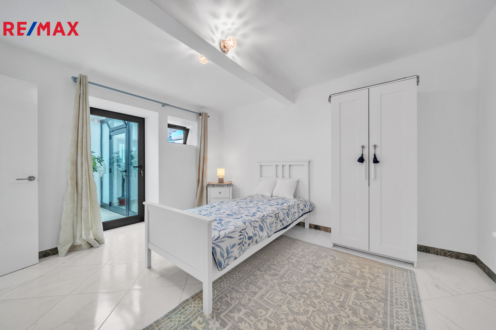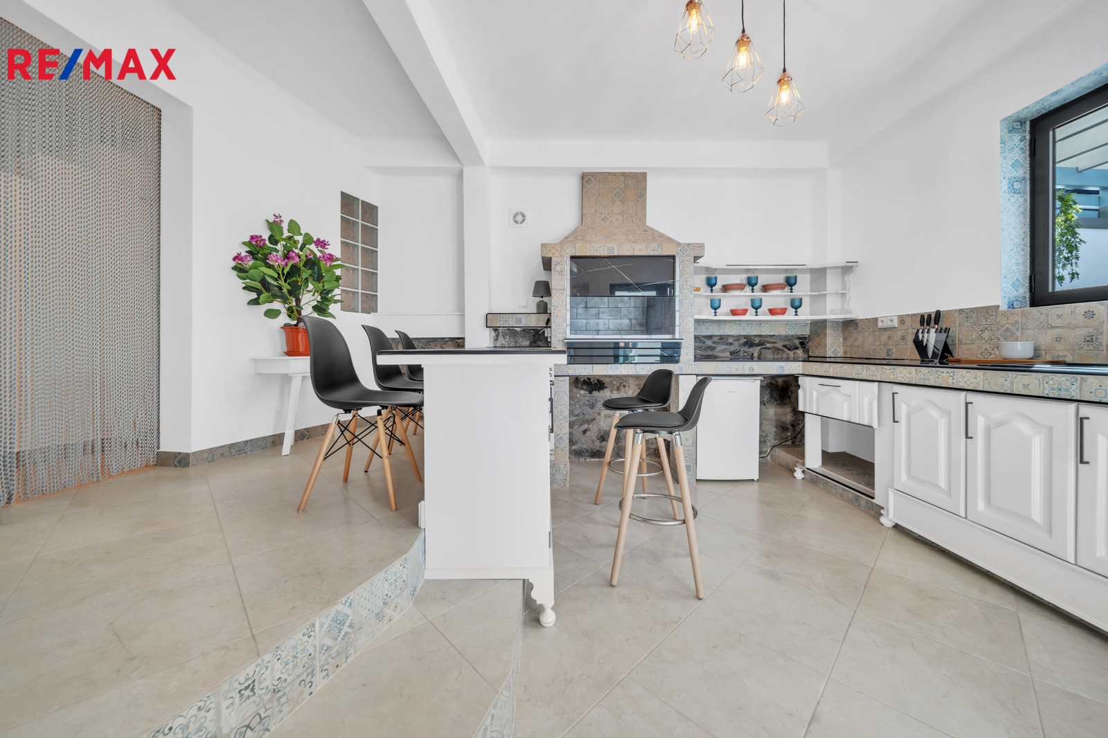V horním patře se nachází garáž pro jedno auto s možností parkování motocyklu nebo kola a další soukromé parkovací místo pro dvě vozidla. Na prostorné terase je k dispozici venkovní kuchyň, bazén a sprcha – ideální prostředí pro odpočinek, grilování či posezení s přáteli u sklenky vína při západu slunce.