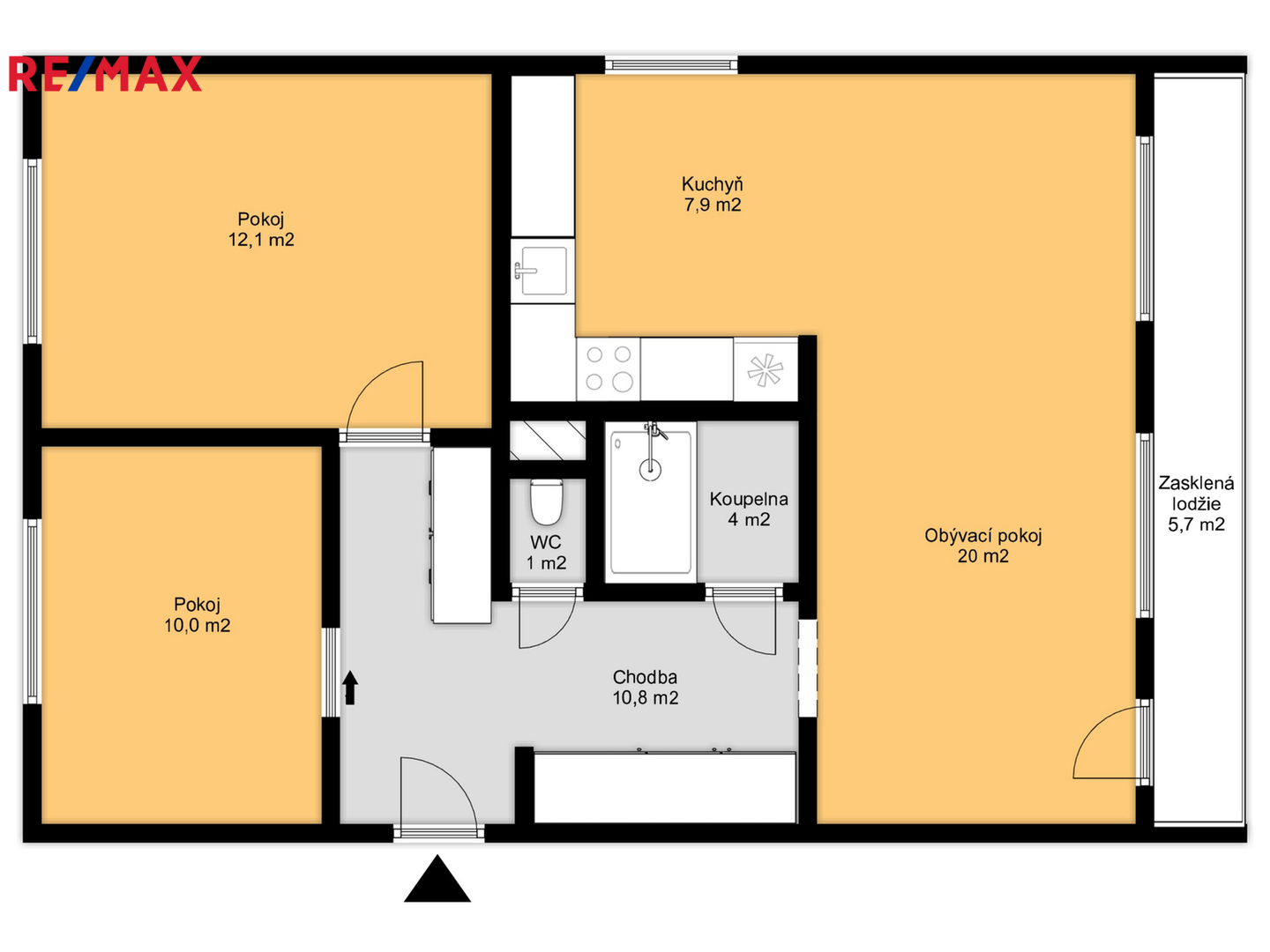 Byt se sestává z obývacího pokoje s kuchyní (27,9 m2), 2 ložnic (10 a 12,1 m2), chodby (10,8 m2), koupelny (4 m2) a WC (1 m2). Z obývacího pokoje lze vyjít na zasklenou lodžii (5,7 m2). S bytem lze využívat také komoru vedle bytu a sklep.
