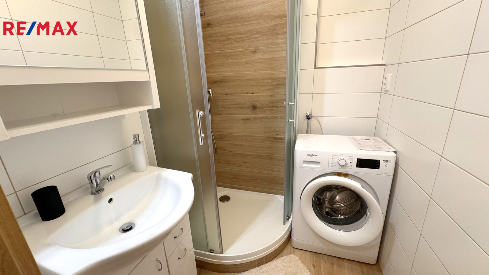Jádro po rekonstrukci: Bytové jádro prošlo nedávnou rekonstrukcí (samostatné WC, sprchový kout, pračka).