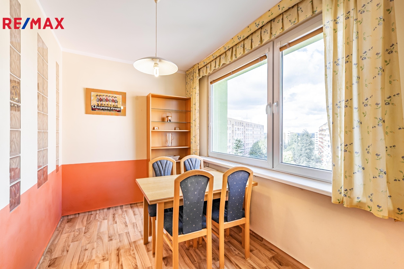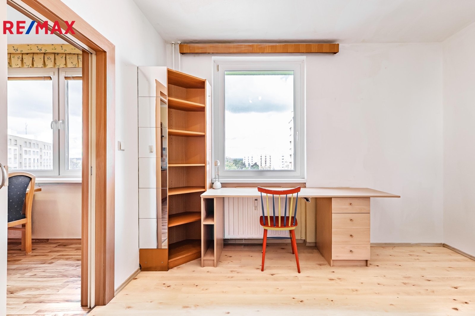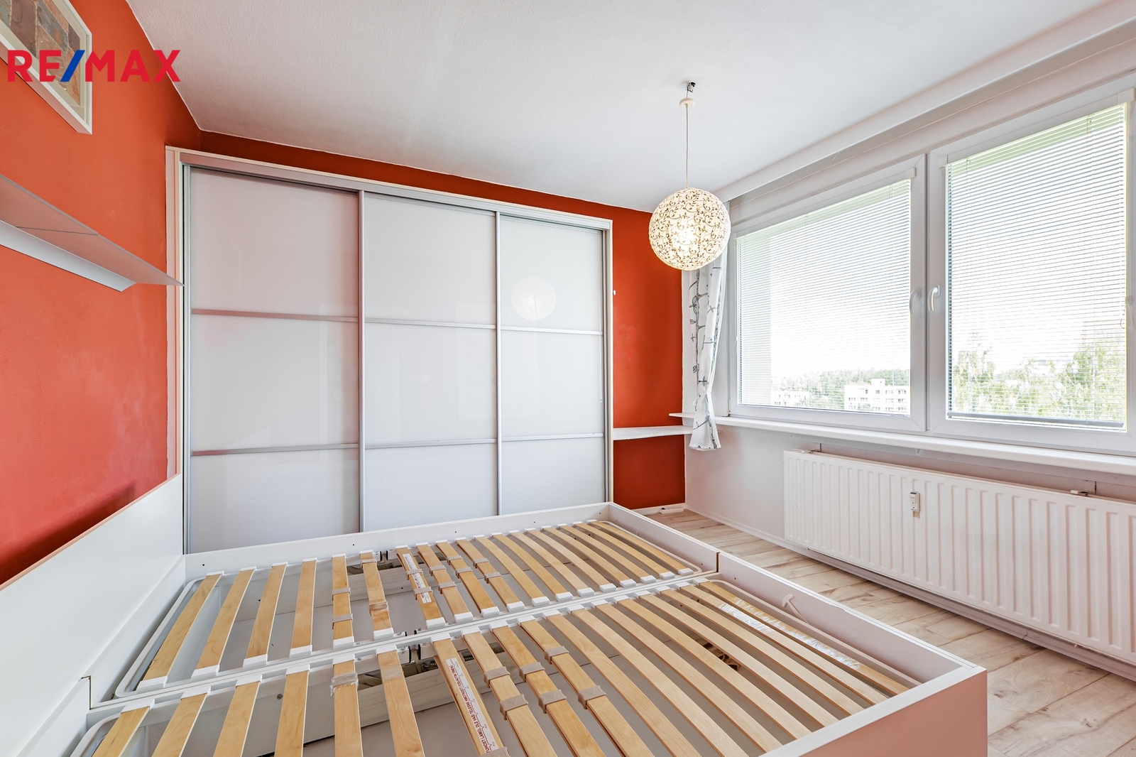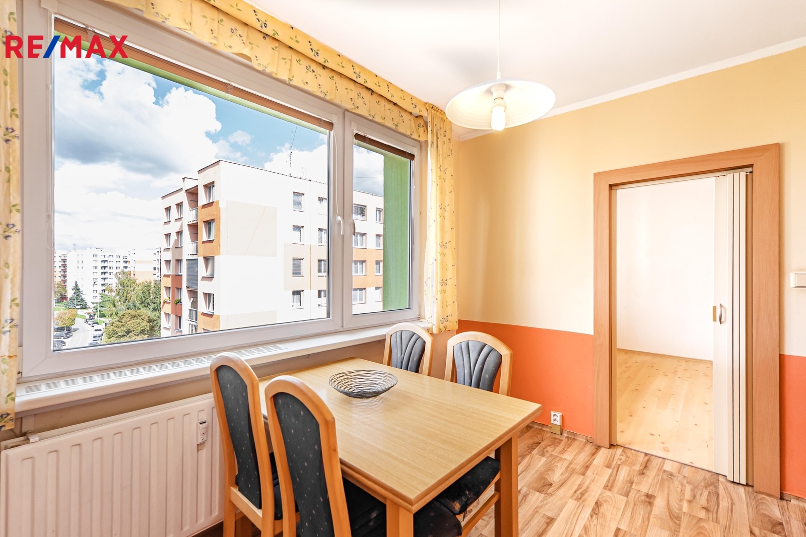 Byt se nachází v šestém patře (sedmém nadzemním podlaží) panelového domu s výtahem. Při vstupu do bytu se nacházíme ve větší předsíni (zádveří). Naproti nám je koupelna s toaletou. Z předsíně se můžeme vydat dále do kuchyně s jídelnou nebo do obývacího pokoje s prostornou lodžií. Díky velkým oknům je tato místnost přirozeně světlá, díky čemuž Vám dodá na pocitu svěžího bydlení. U obývacího pokoje se pak nachází hlavní ložnice. Druhý pokoj, který můžete využít jako další ložnici, pracovnu nebo místnost pro hosty, se pak nachází u jídelny. Kuchyně a pokoj u jídelny jsou orientovány na sever, zatímco obývací pokoj a hlavní ložnice na východ. Součástí pronájmu je ještě sklepní kóje v přízemí domu.
