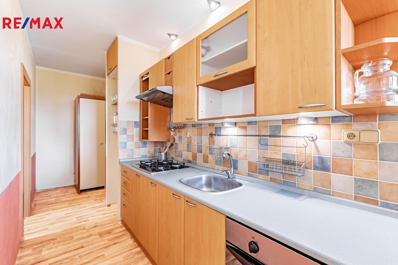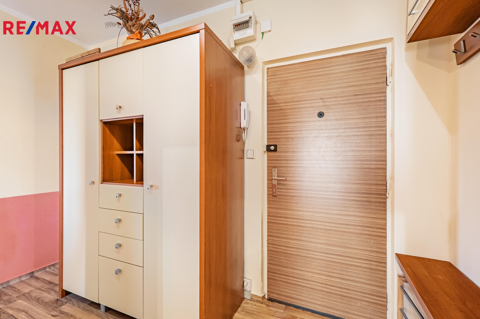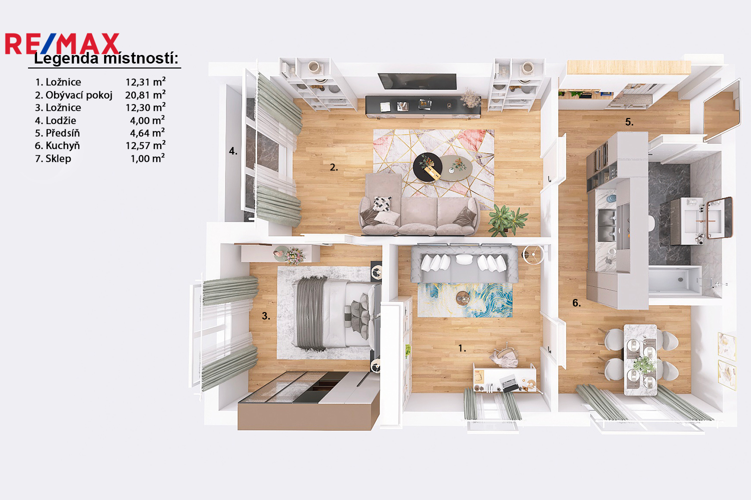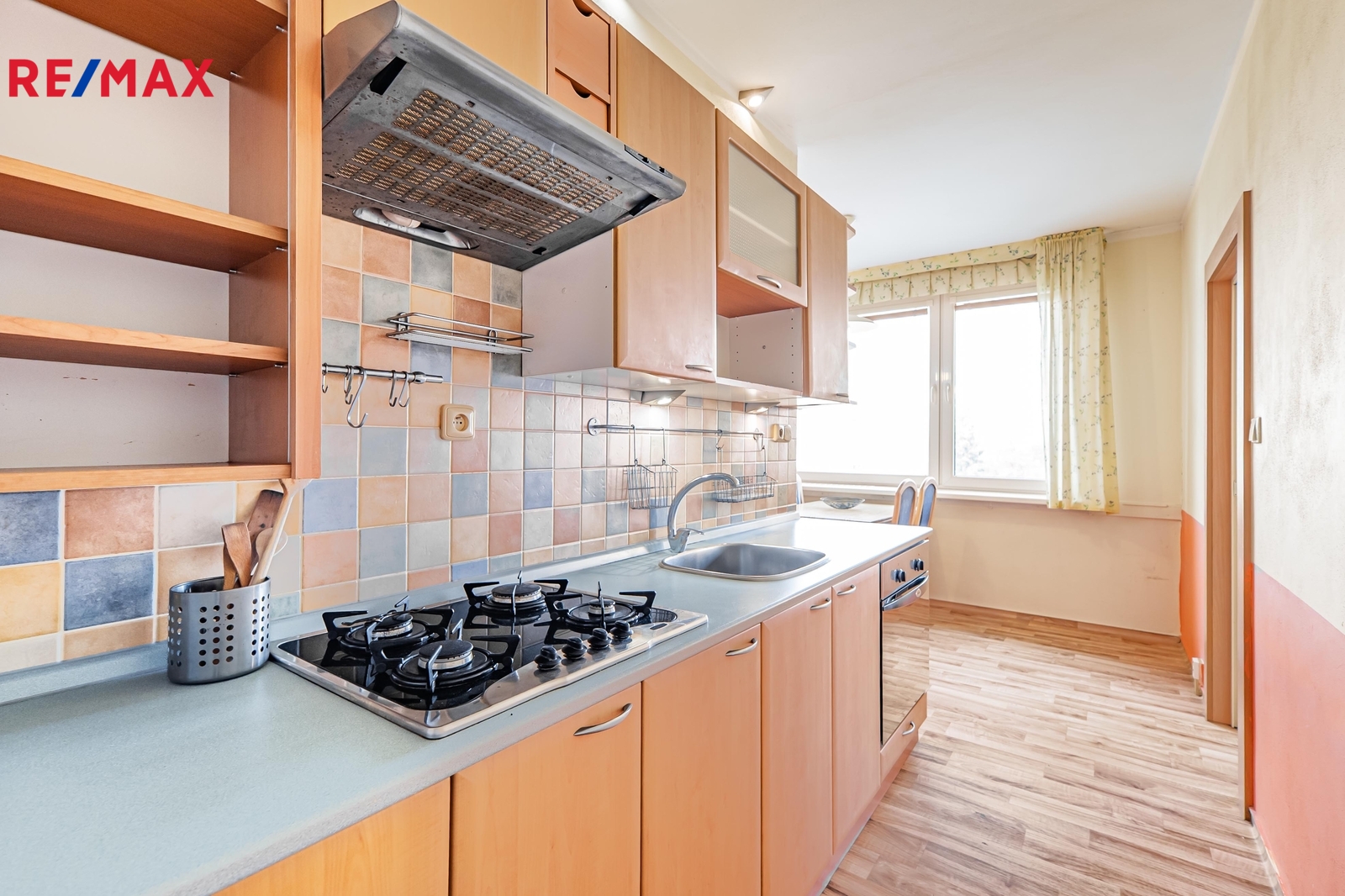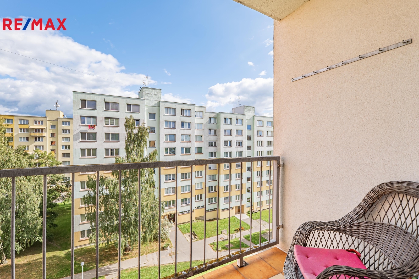 Byt se nachází v šestém patře (sedmém nadzemním podlaží) panelového domu s výtahem. Při vstupu do bytu se nacházíme ve větší předsíni (zádveří). Naproti nám je koupelna s toaletou. Z předsíně se můžeme vydat dále do kuchyně s jídelnou nebo do obývacího pokoje s prostornou lodžií. Díky velkým oknům je tato místnost přirozeně světlá, díky čemuž Vám dodá na pocitu svěžího bydlení. U obývacího pokoje se pak nachází hlavní ložnice. Druhý pokoj, který můžete využít jako další ložnici, pracovnu nebo místnost pro hosty, se pak nachází u jídelny. Kuchyně a pokoj u jídelny jsou orientovány na sever, zatímco obývací pokoj a hlavní ložnice na východ. Součástí pronájmu je ještě sklepní kóje v přízemí domu.