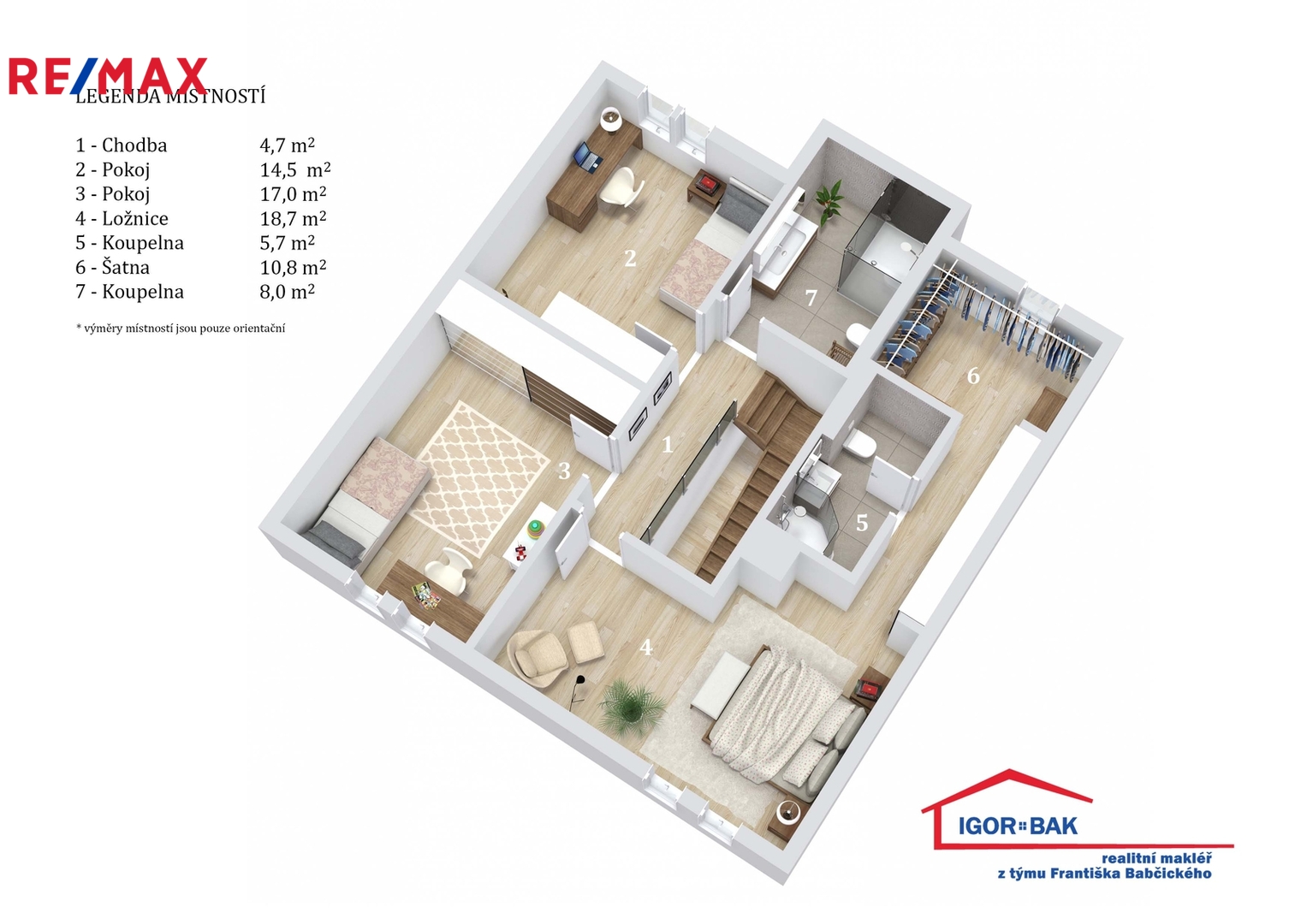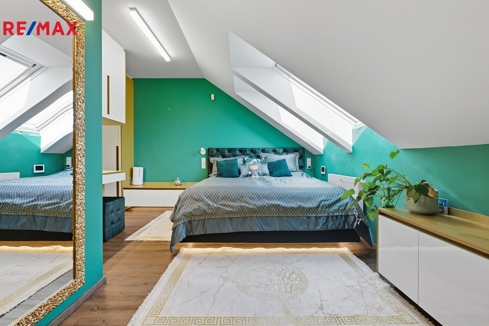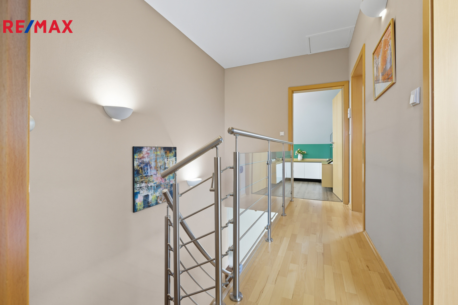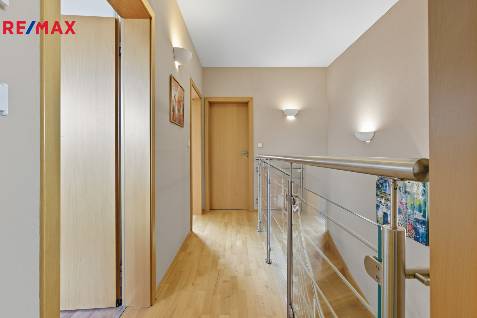 V patře se nachází chodba 4,7 m², pokoj 14,5 m², druhý pokoj 17,0 m², ložnice 18,7 m² s prostornou šatnou 10,8 m² a dvě koupelny se sprchovým koutem a WC o velikosti 5,7 m² a 8,0 m². Celkem jsou v domě tři toalety.