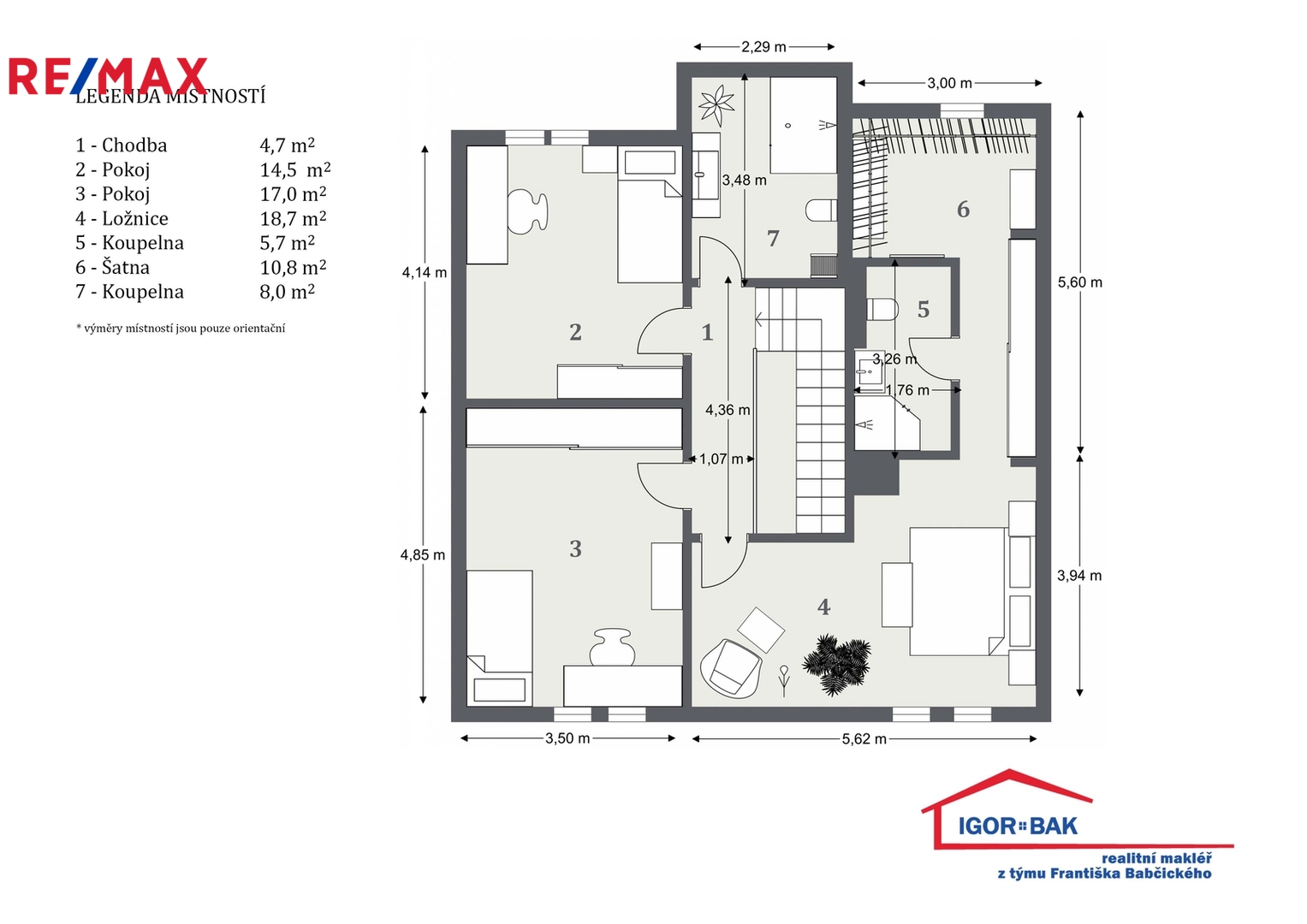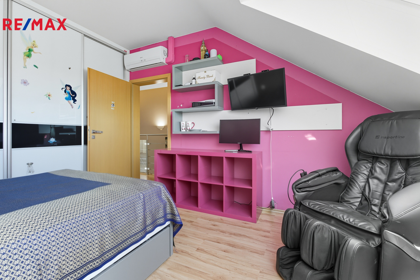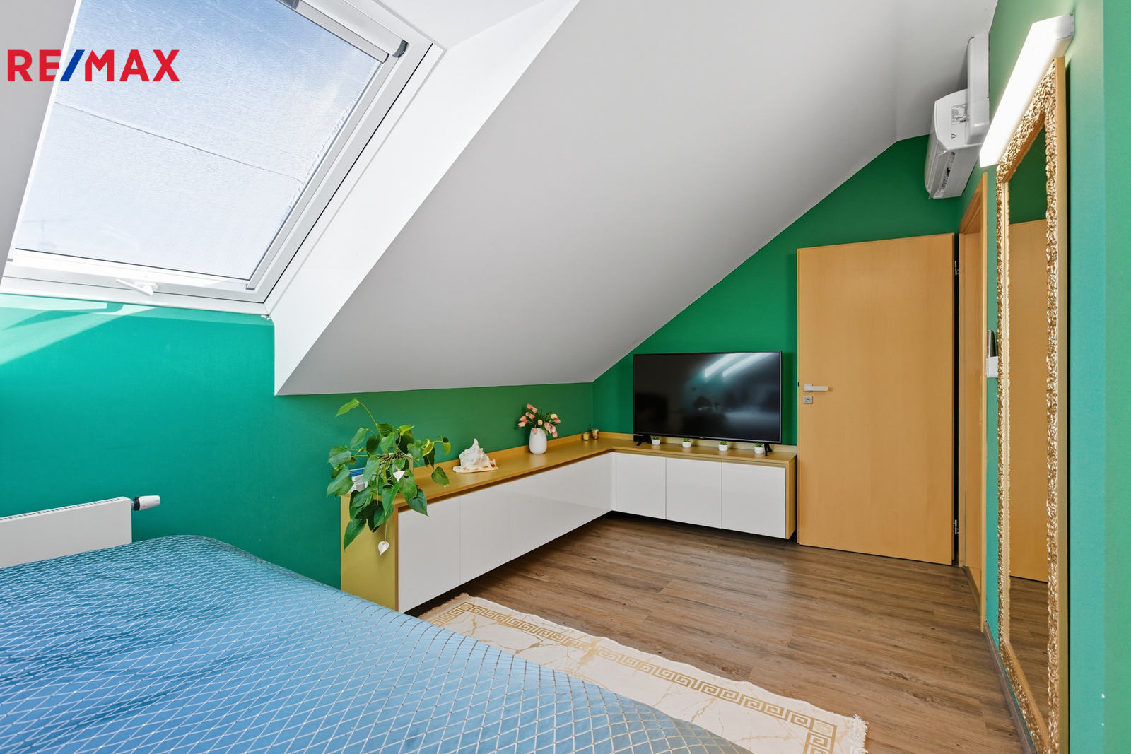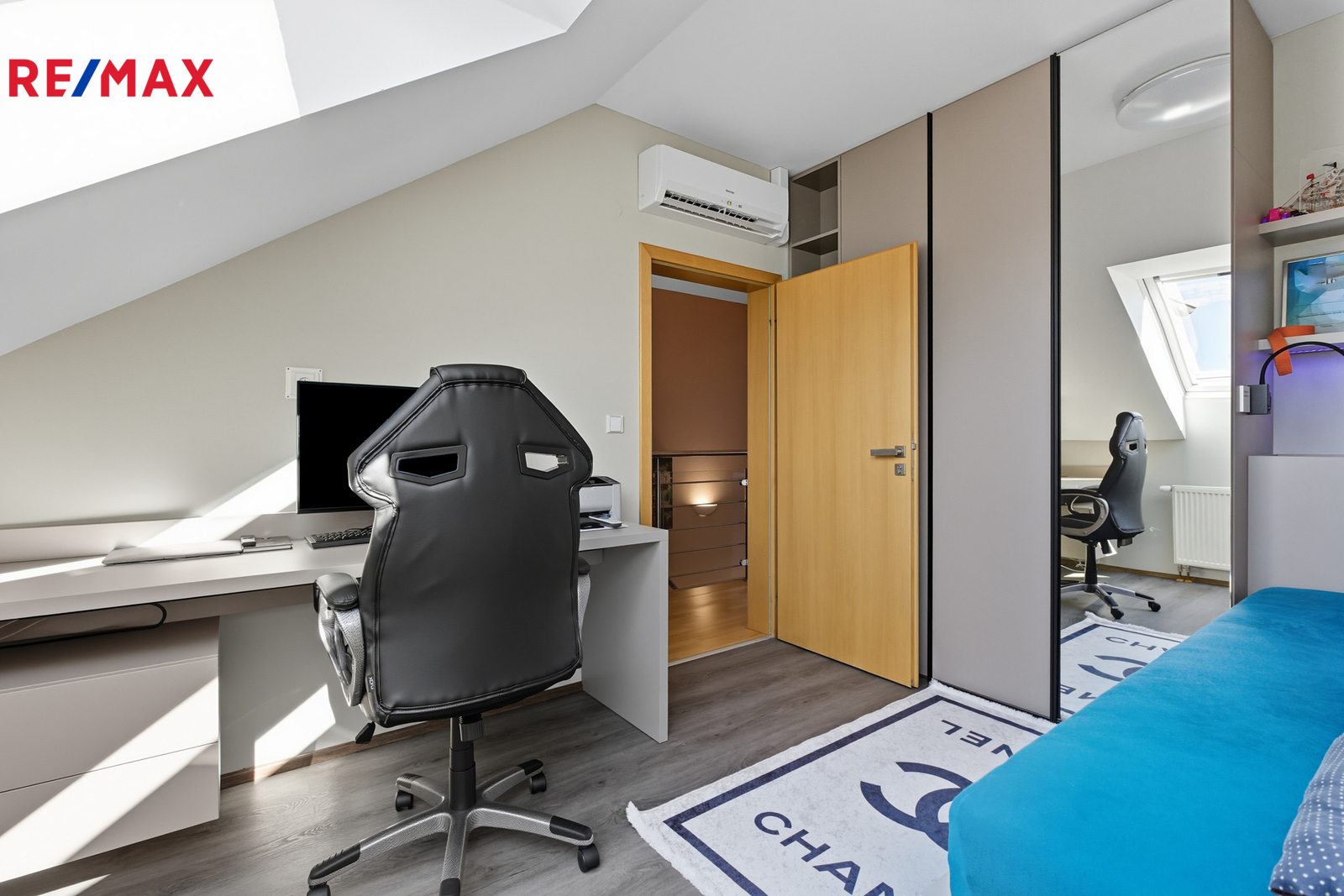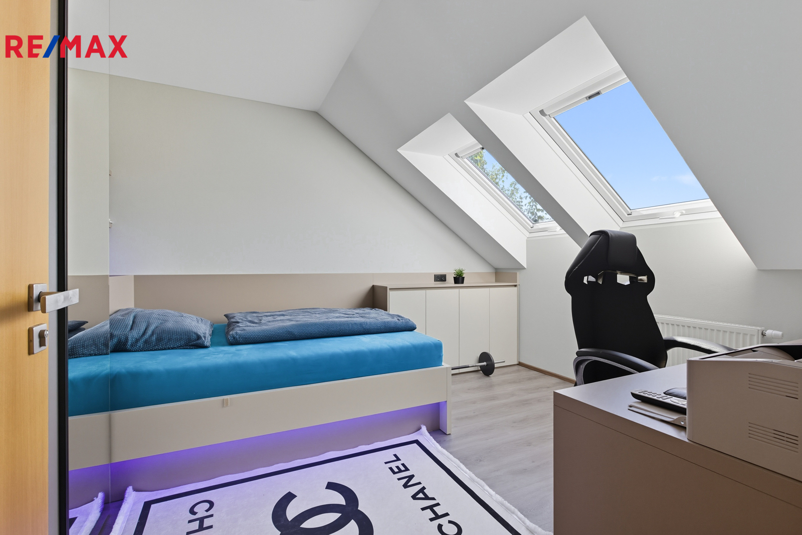 V patře se nachází chodba 4,7 m², pokoj 14,5 m², druhý pokoj 17,0 m², ložnice 18,7 m² s prostornou šatnou 10,8 m² a dvě koupelny se sprchovým koutem a WC o velikosti 5,7 m² a 8,0 m². Celkem jsou v domě tři toalety.