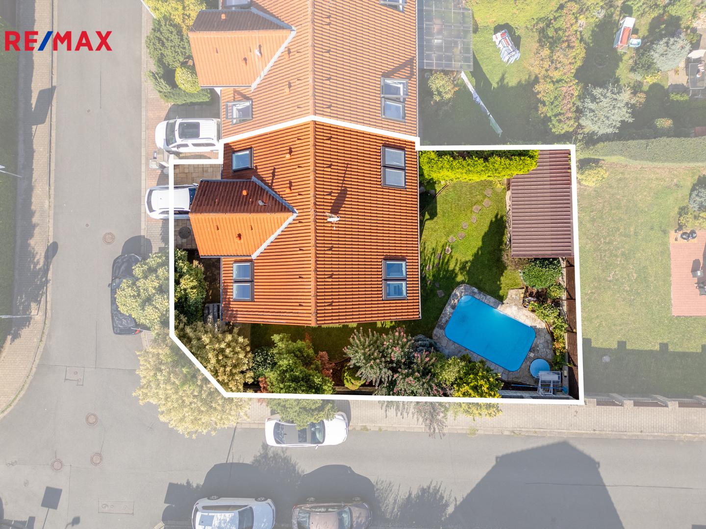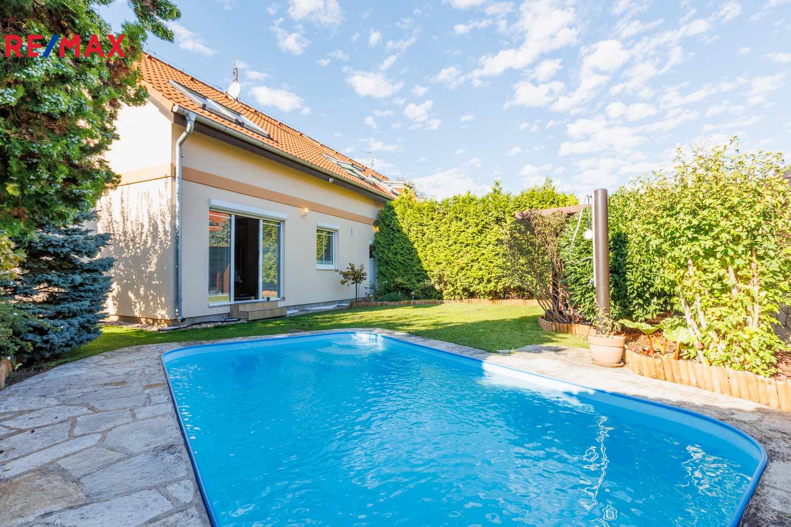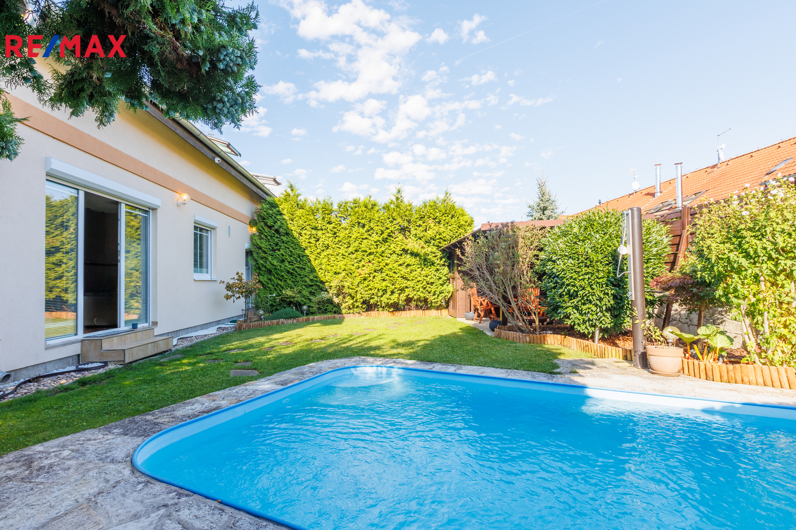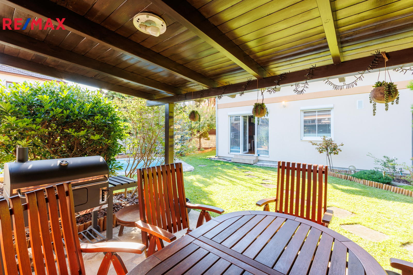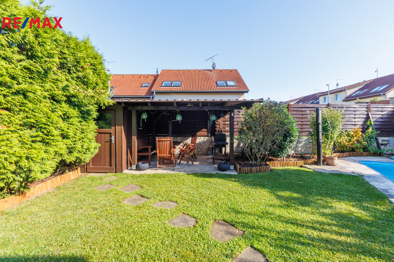 Zahrada o výměře 247 m² byla navržena architektem a tvoří soukromou oázu klidu. Je zde bazén o rozměru 5 × 3 metry se slanou vodou a tepelným čerpadlem, automatické zavlažování, zahradní domek s elektřinou a krytá pergola s posezením a grilem. Celý venkovní prostor je osvětlený a vybavený elektrickými zásuvkami.