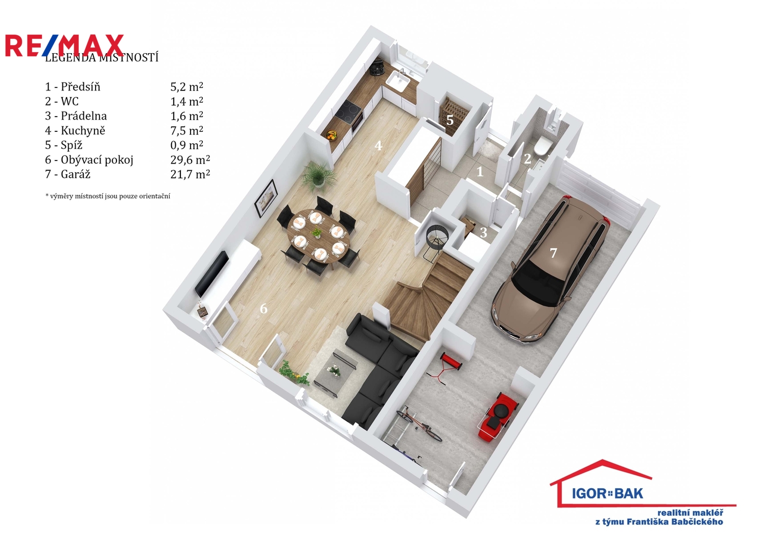 V přízemí se nachází předsíň 5,2 m² s vestavěnými úložnými prostory, samostatné WC 1,4 m², prádelna 1,6 m² a spíž 0,9 m². Kuchyně 7,5 m² s linkou na míru je vybavena spotřebiči Miele a doplněna o LED podsvícení. Na kuchyň navazuje prostorný obývací pokoj 29,6 m² s přímým vstupem na terasu a zahradu. Dominantou obývací části je exkluzivní mozaiková dřevěná podlaha. Součástí přízemí je také garáž 21,7 m² s přímým vstupem do domu.