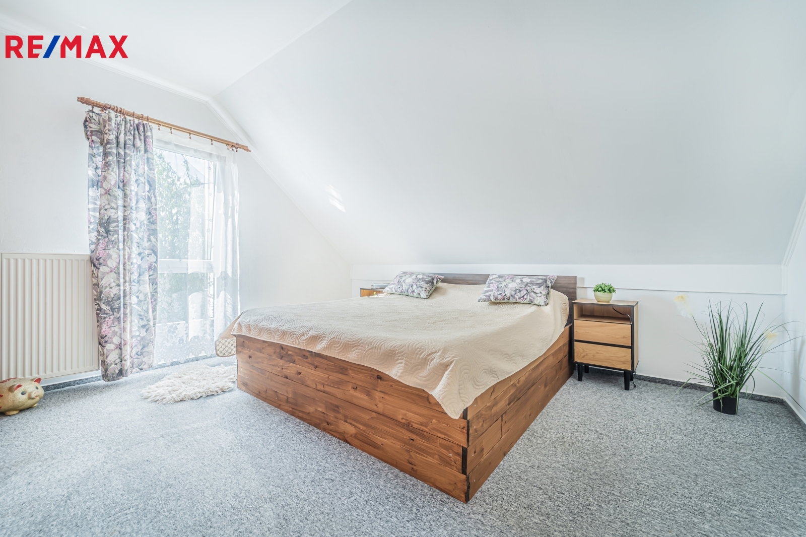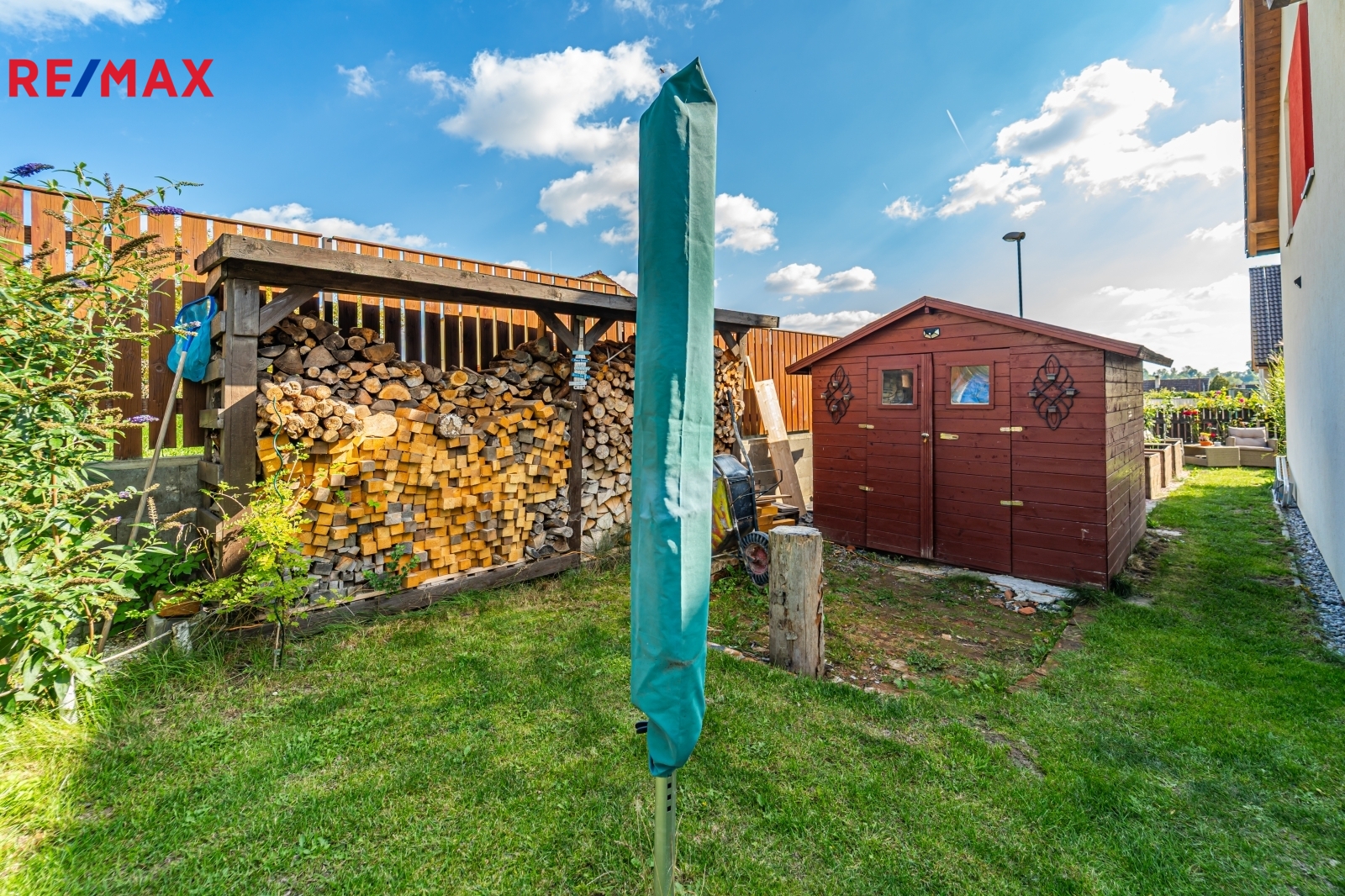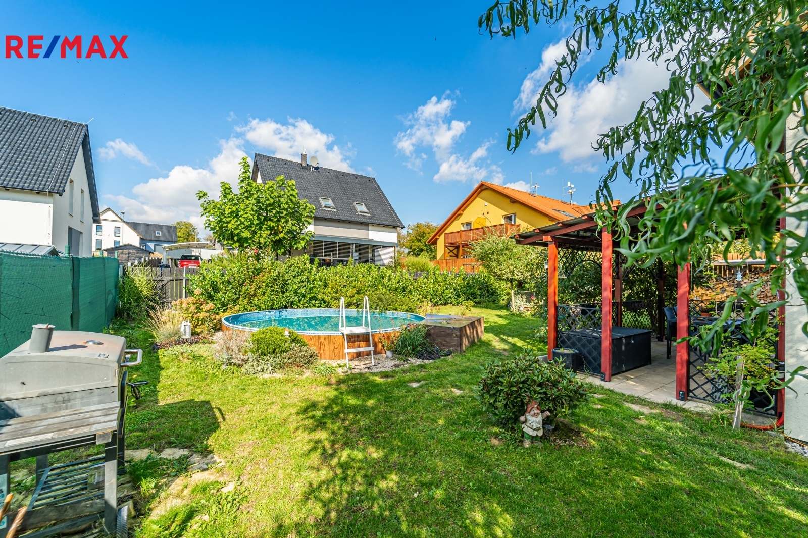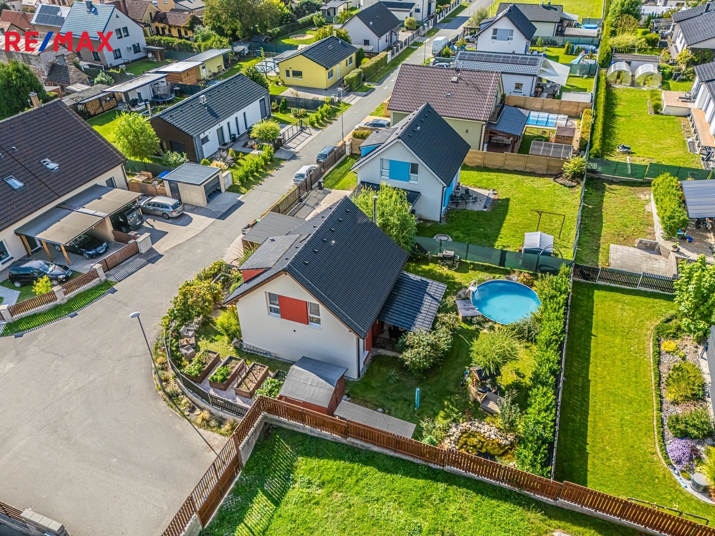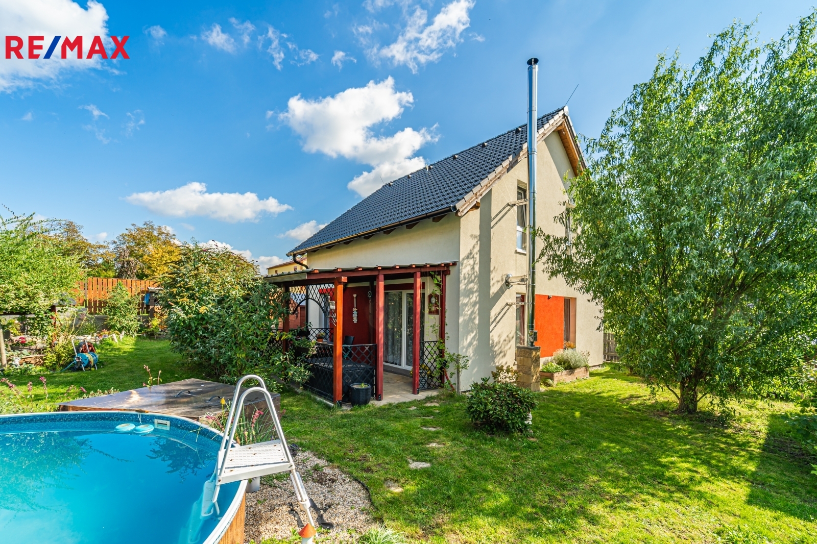Nemovitost sestává z rodinného domu o dispozici 4+kk (96 m2) , samostatně stojící garáže s montážní jámou (20 m2), zastřešené terasy (15 m2), přírodního jezírka, zahradního domku a polozapuštěného venkovního bazénu. Bazén i jezírko disponují čistícím a filtračním zařízením. Na první pohled Vás osloví pečlivě udržovaná zahrada kolem domu, citlivě kombinující okrasné a užitkové prvky.