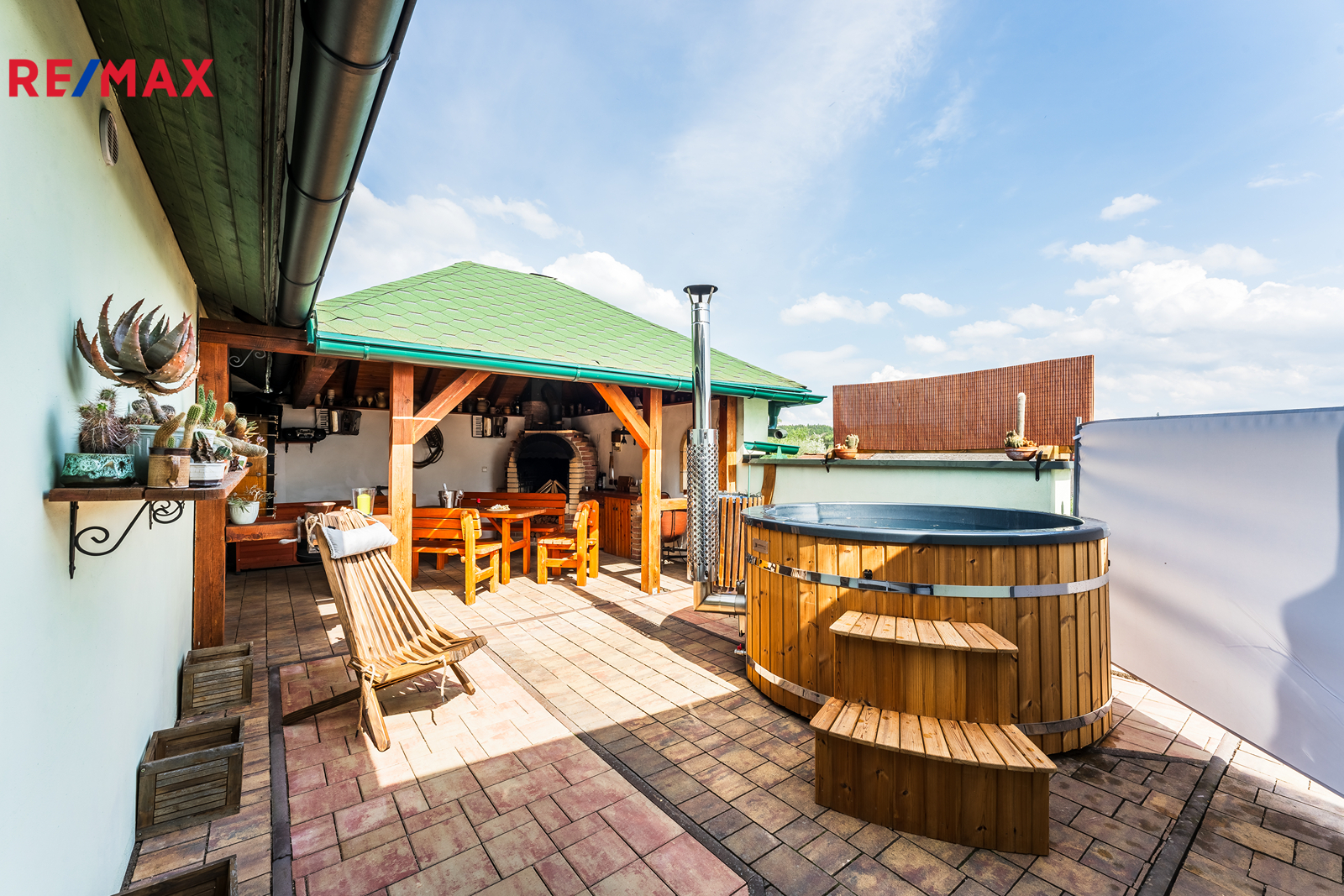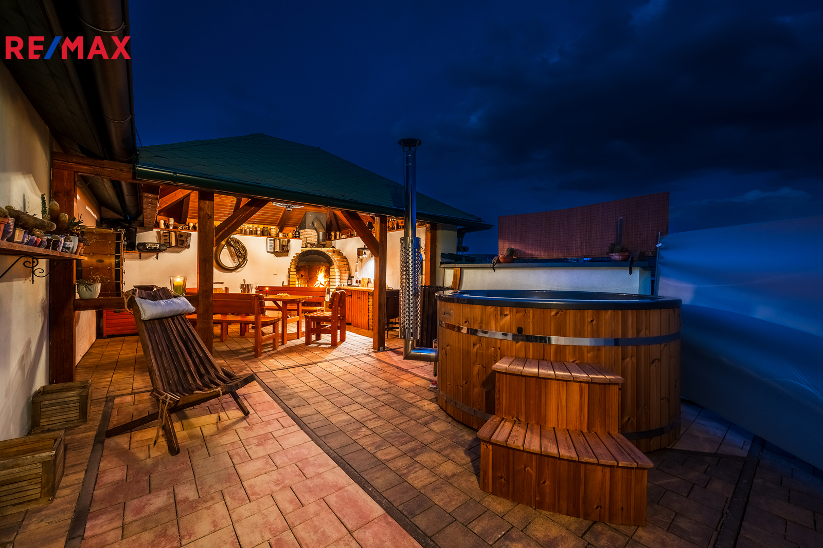 Dominantou prostoru je koupací sud z masivního dřeva s hydromasážním a aeromasážním systémem, LED osvětlením a dřevem vytápěným topením – perfektní místo pro relaxaci pod širým nebem. Celé zákoutí je dokonale ukryté před zraky okolí, takže si můžete užívat naprosté soukromí.