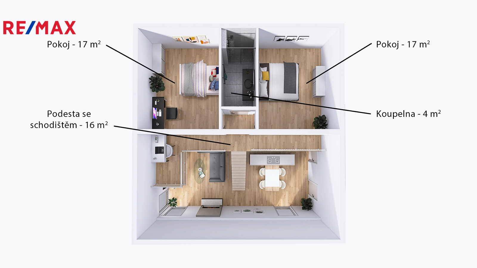 V patře na vás čekají další dva pokoje a multifunkční místnost, připravená buď jako prostorná šatna, nebo budoucí druhá koupelna – její možnou podobu si můžete prohlédnout ve vizualizaci ve fotogalerii.
